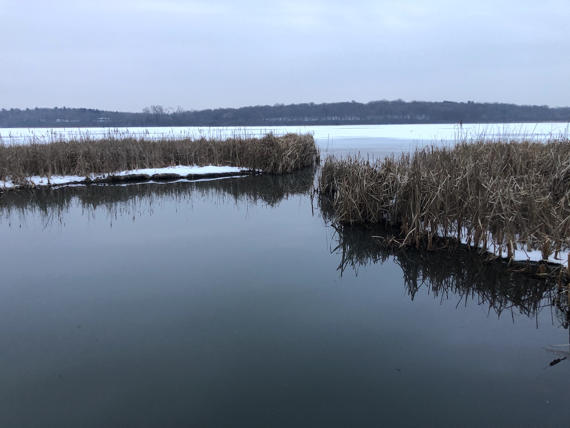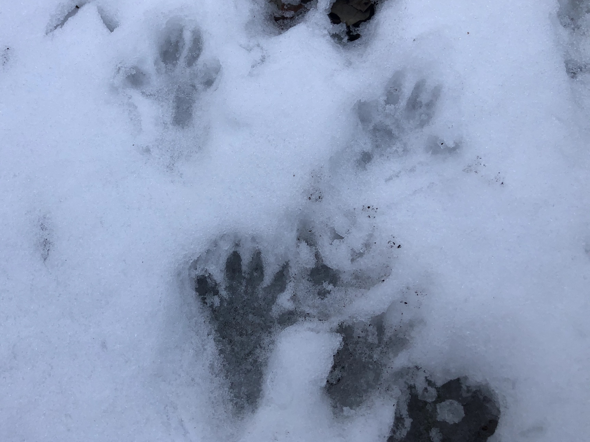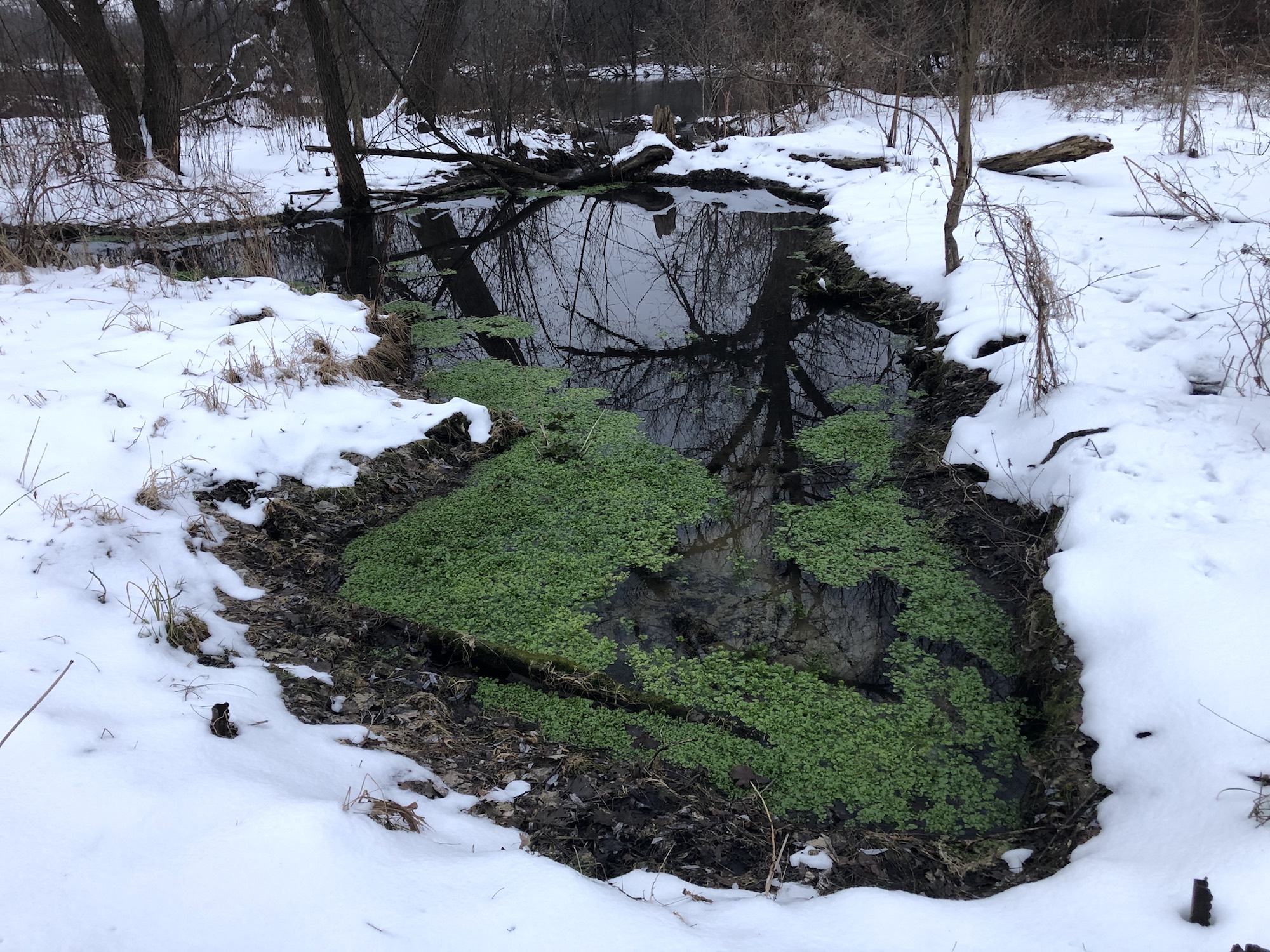 No movement. No Geese. And then, Cardinals appear. Springs flow. Raccoon tracks.