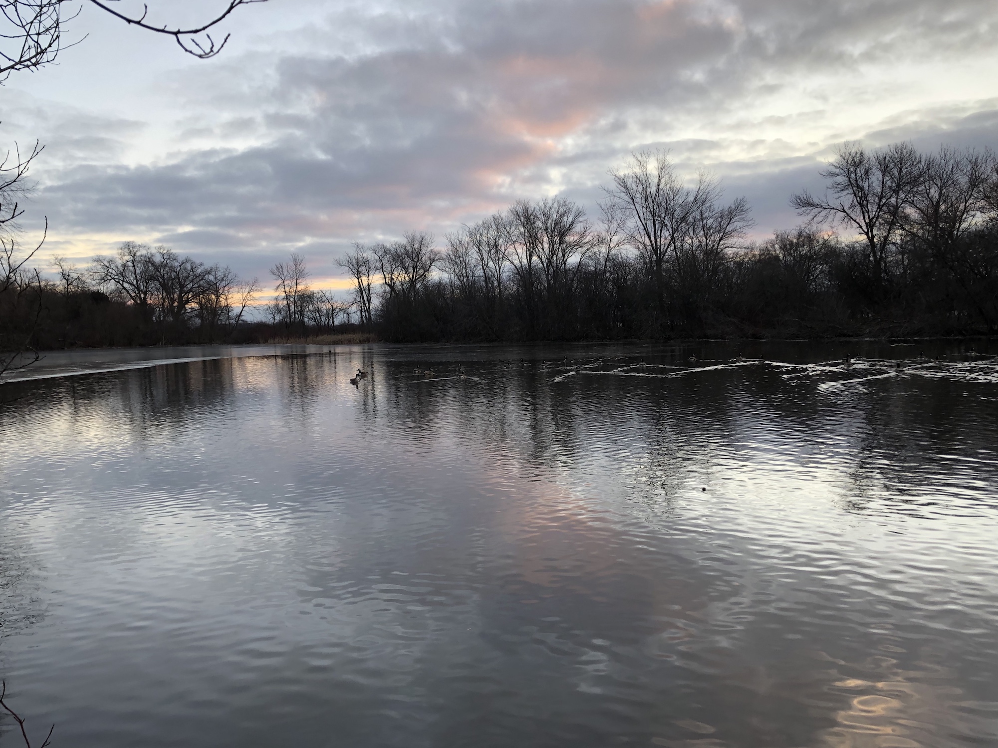 Above: Geese in open water in Ho-Nee-Um Pond swimming towards outlet to Lake Wingra.