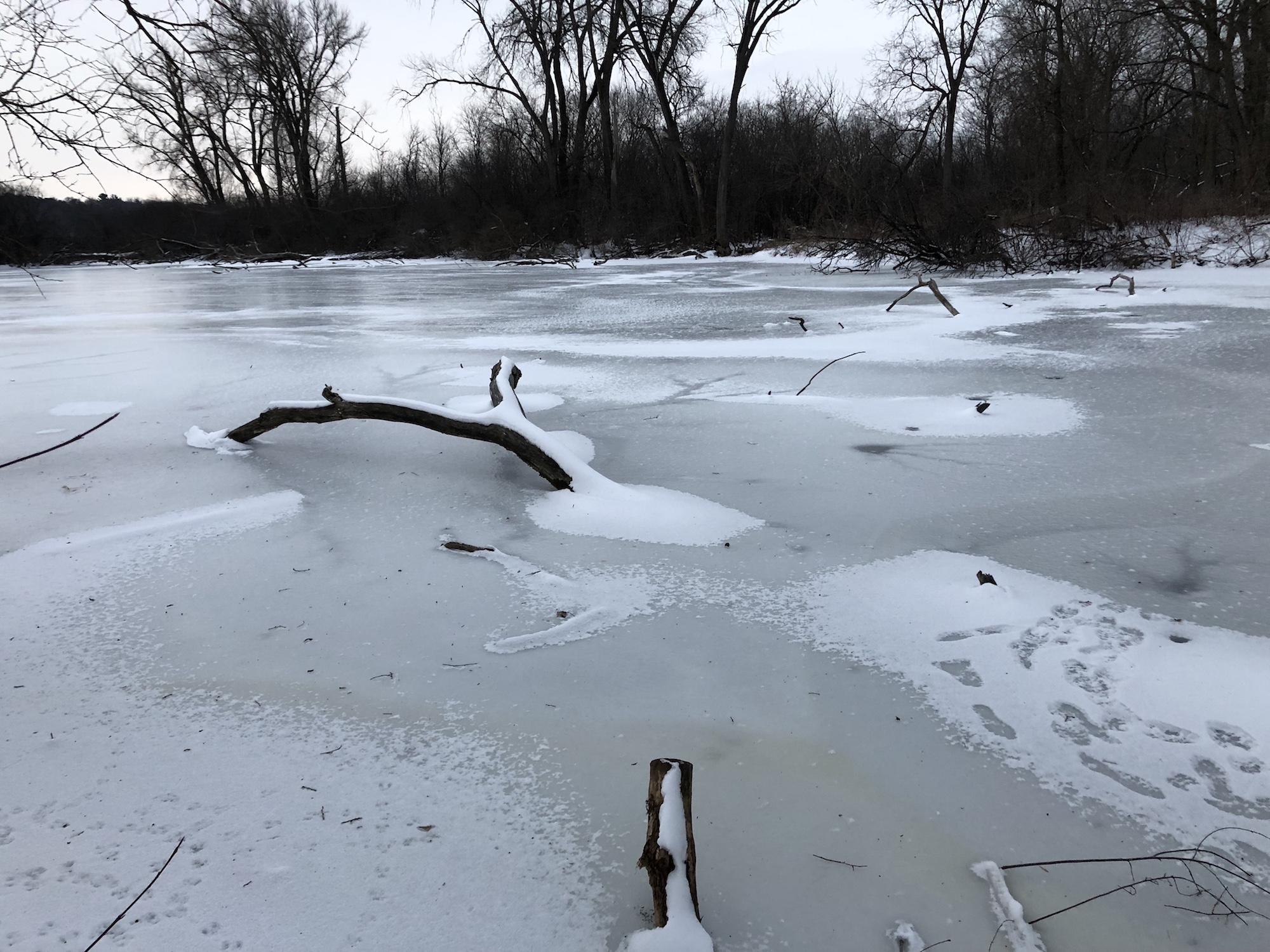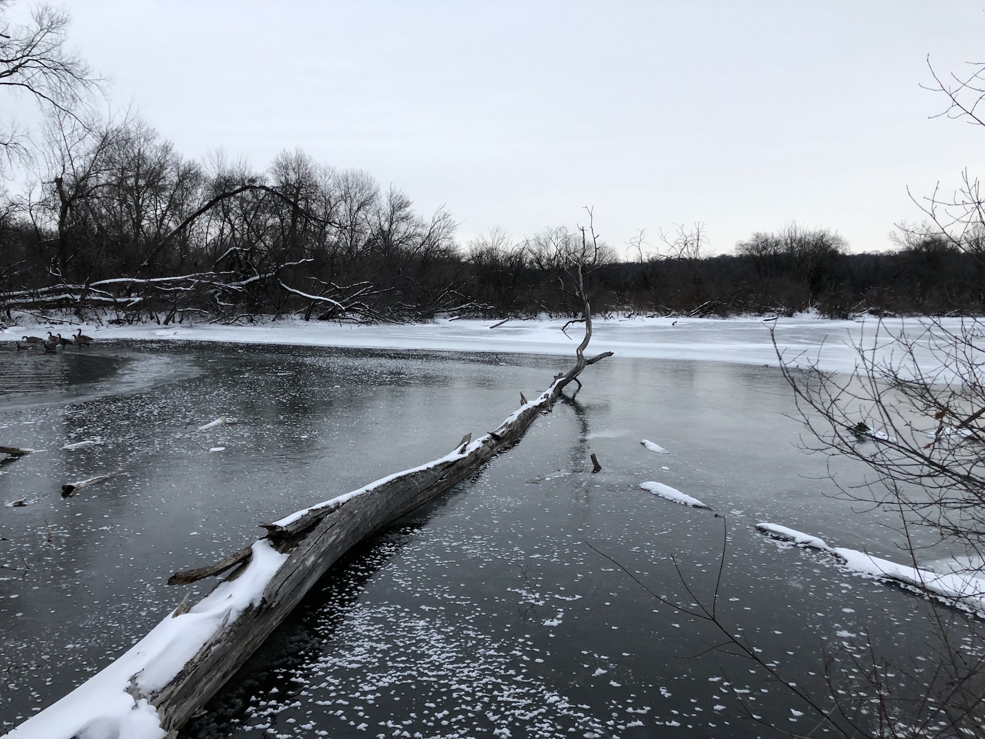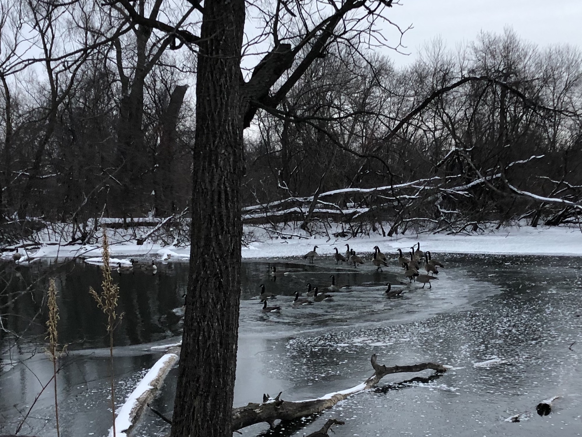 Above: Ho-Nee-Um Pond lagoon. Geese on edge of ice and open water.