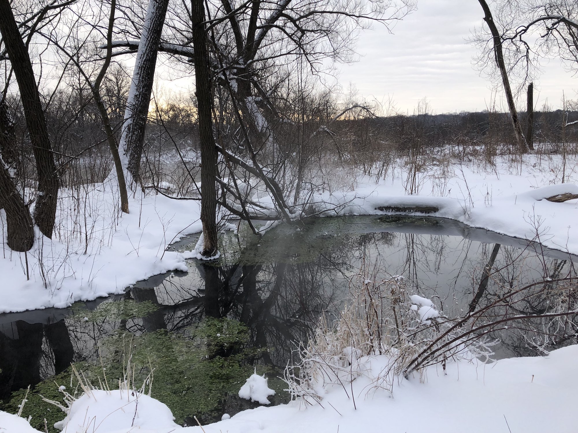 Above: Council Ring Spring merging with Dancing Sands and flowing into Ho-Nee-Um Pond on February 1, 2019.