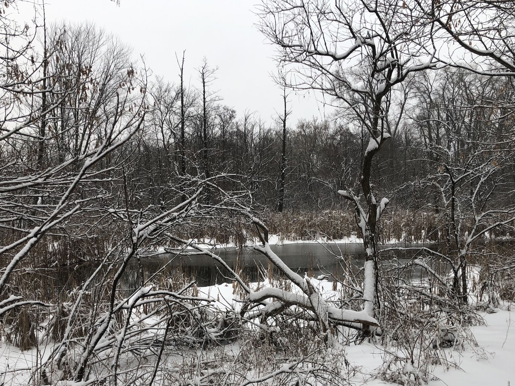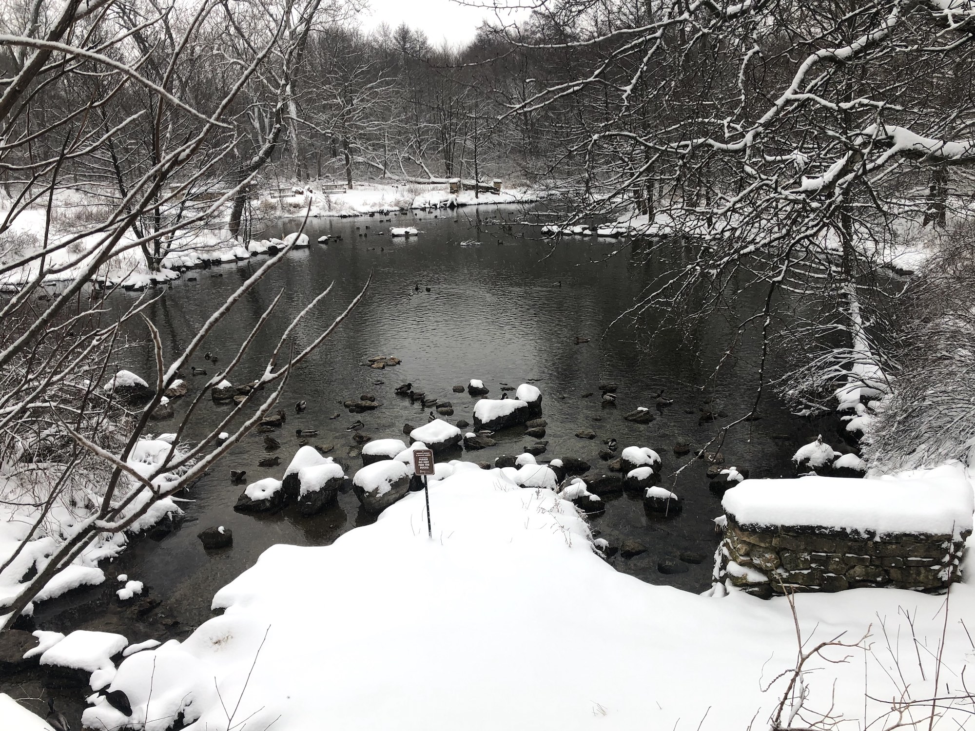 Above: Duck Pond on February 12, 2019 (27°). Rafter of wild turkeys at end of pond.