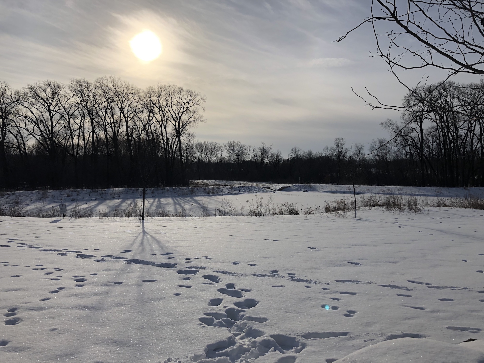 Above: Retaining pond on corner of Nakoma Road and Manitou Way on March 3, 2019 (22°).