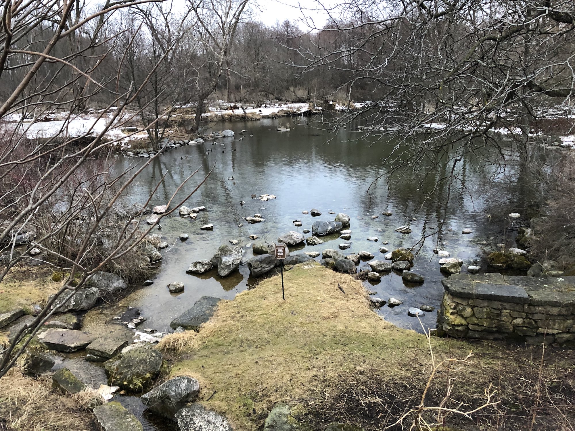 Above: Duck Pond on March 15, 2019 (33°). A rafter of wild turkeys flocking at southern edge of pond.
