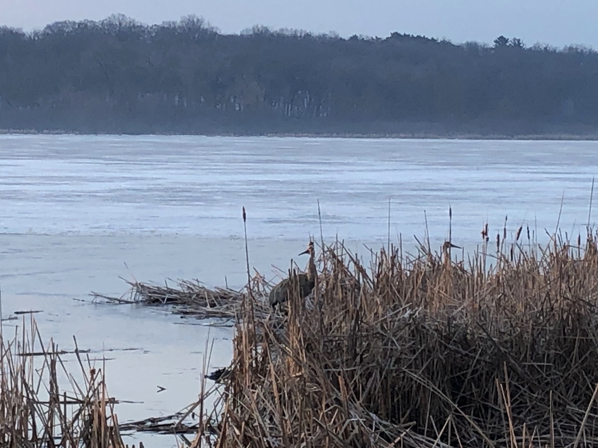 Above: Lake Wingra cattails. Two Sandhill Cranes. Redwing Blackbirds.
