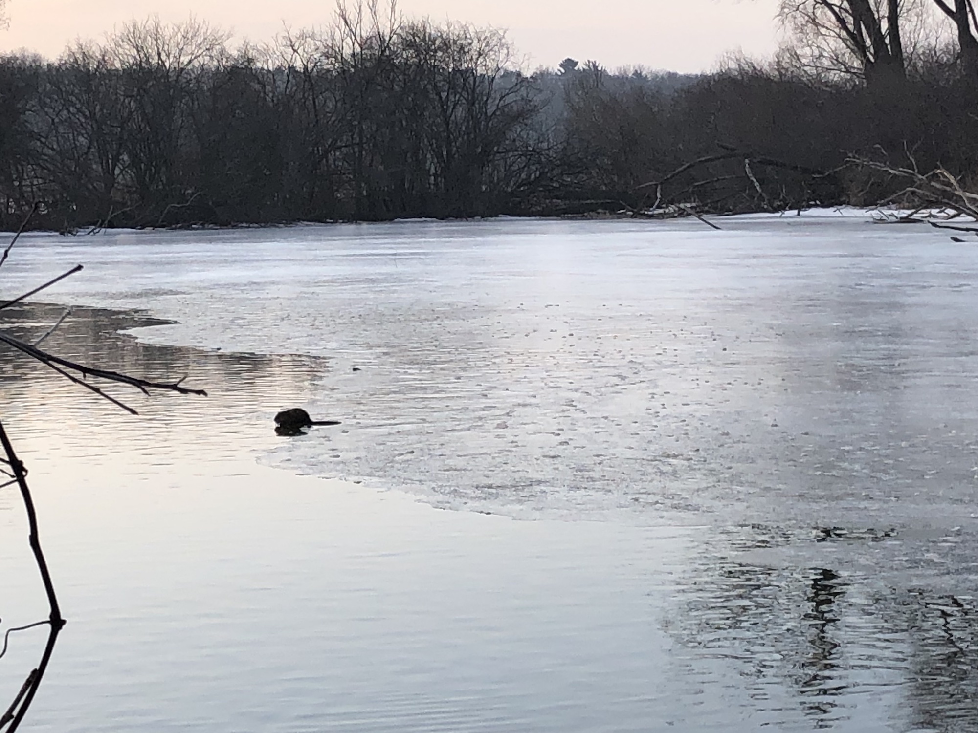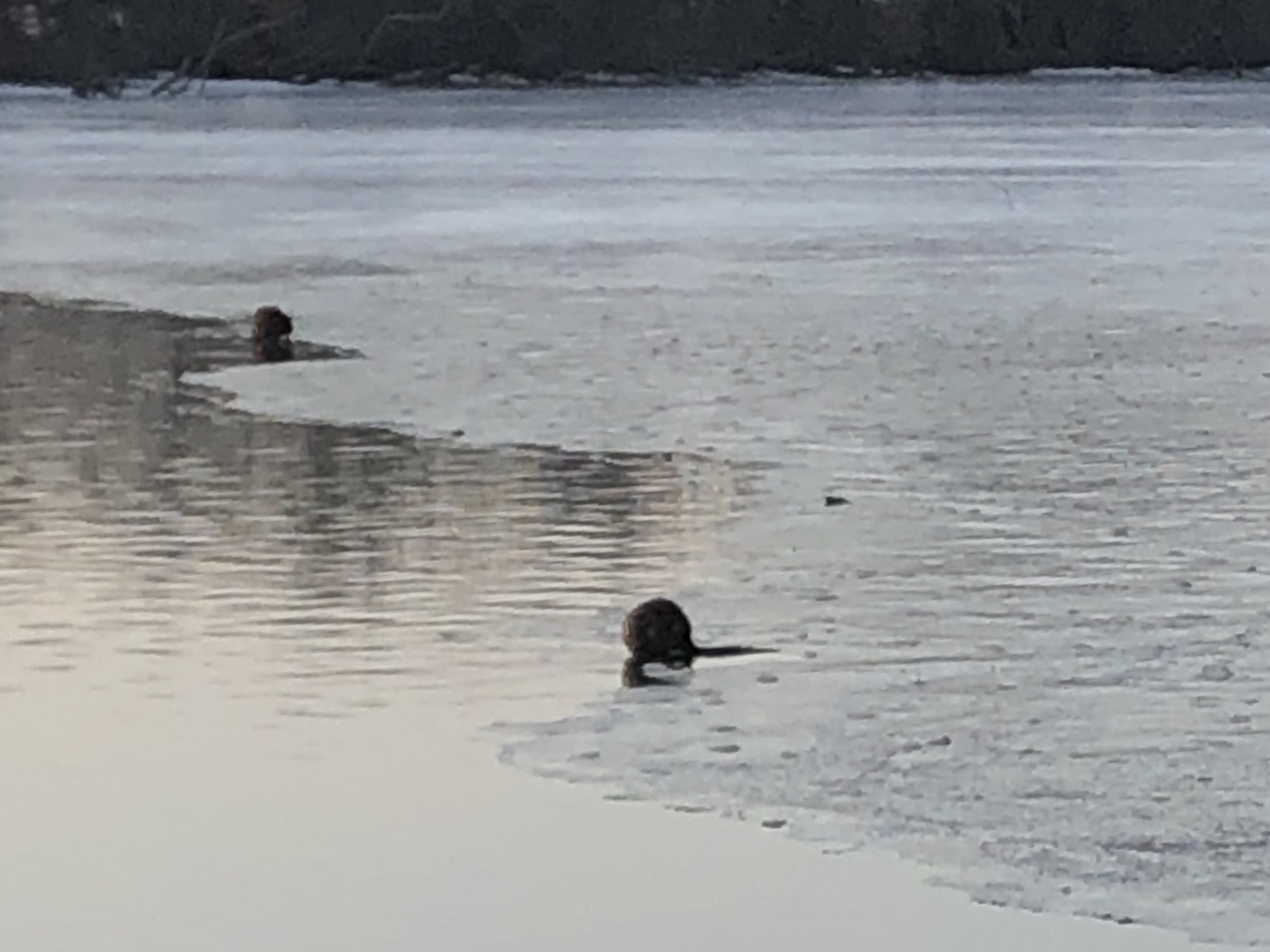 Above: Ho-Nee-Um Pond. Muskrats sitting on edge of receeding ice. About six sighted in pond.