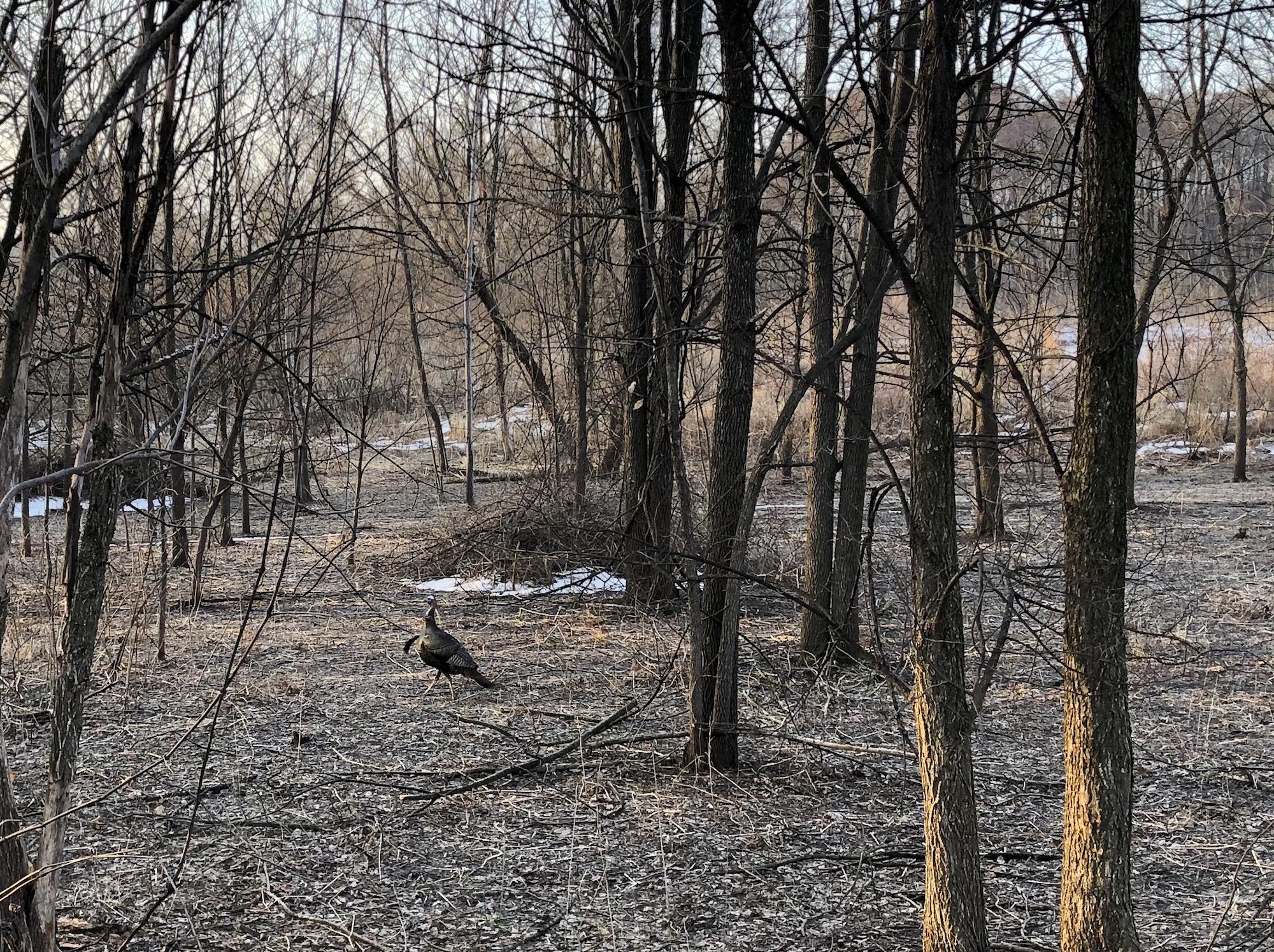 Above: Lone turkey in woods adjacent to Marion Dunn prairie on March 18, 2019 (27°).