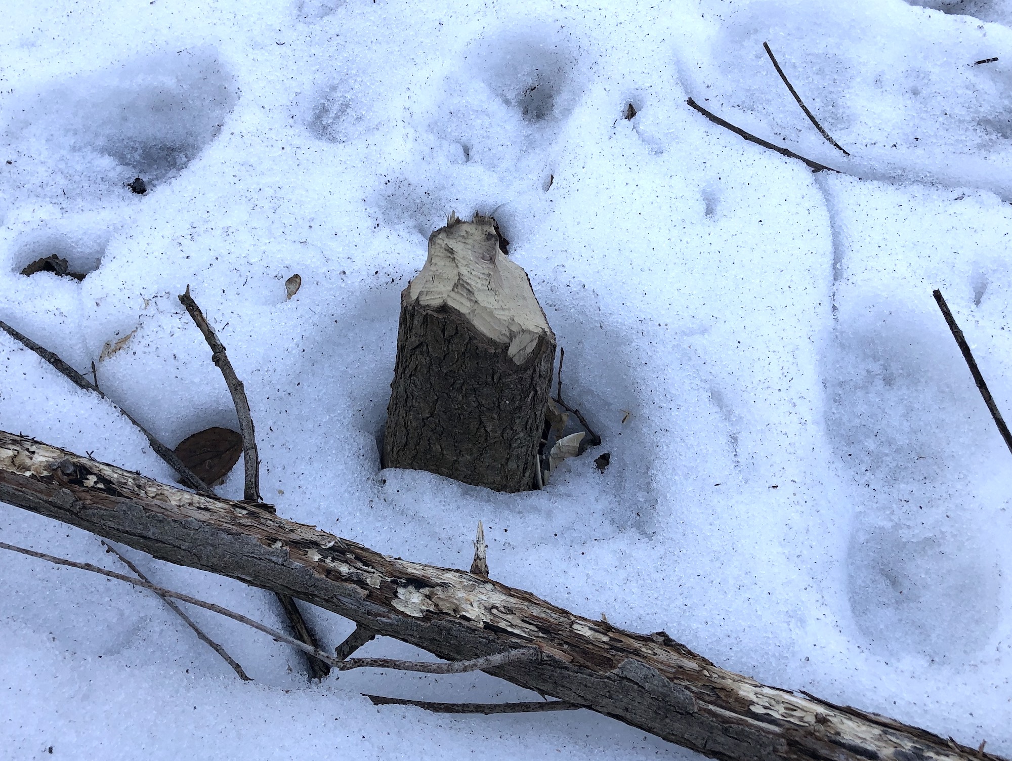 Below: Tree gnawed by beaver on shore of Ho-Nee-Um Pond .