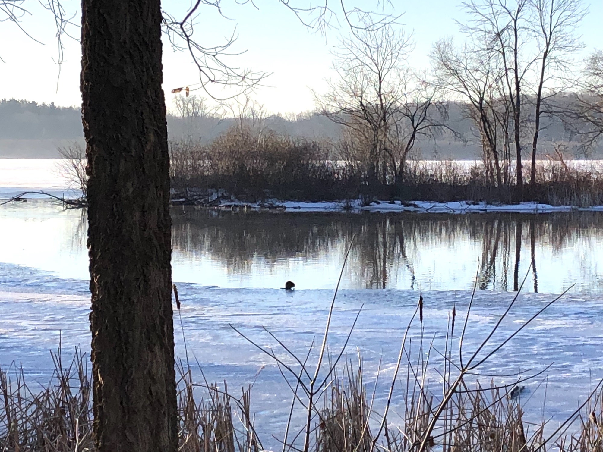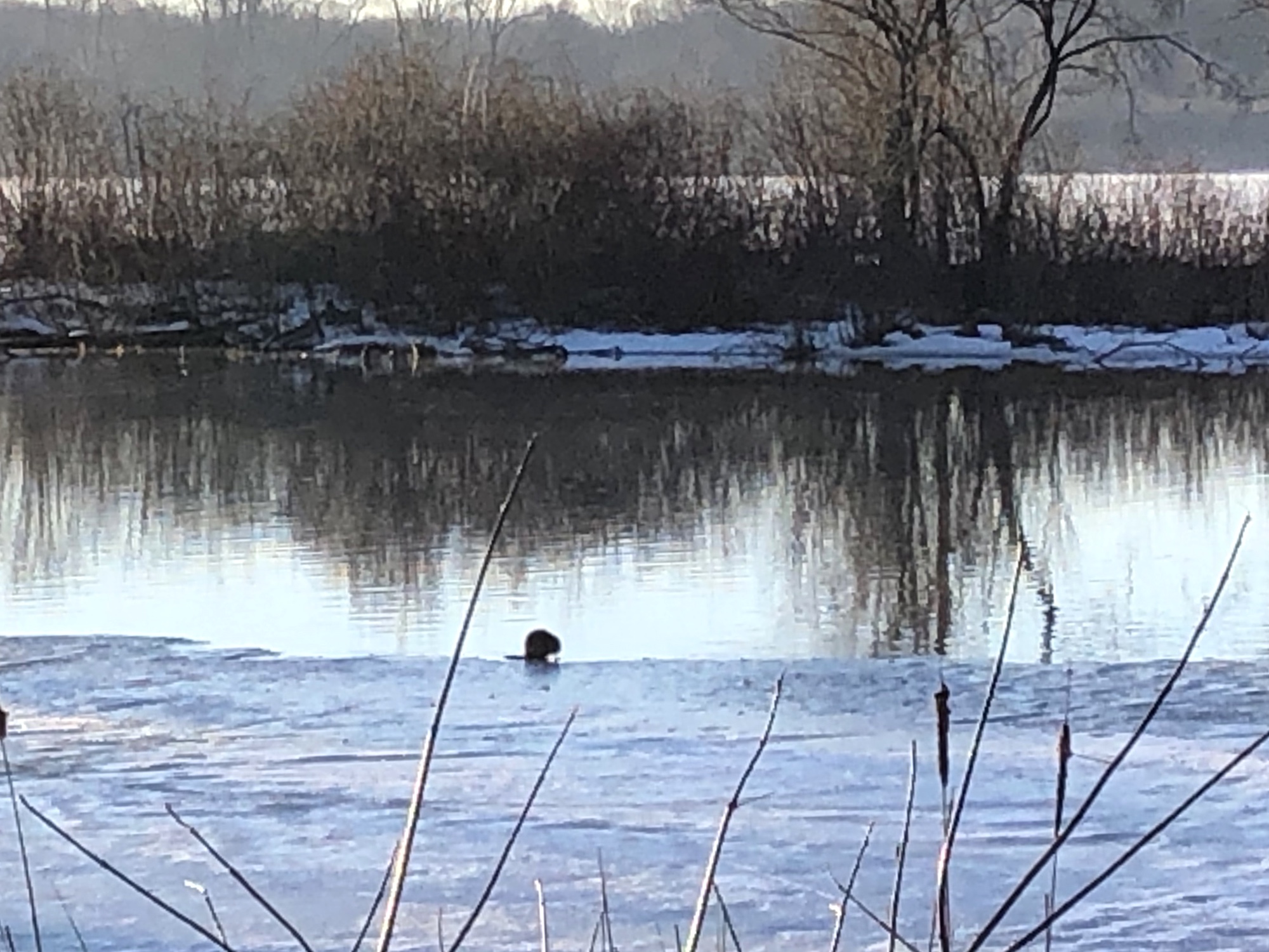 Above: Muskrat in Ho-Nee-Um Pond (30°). Muskrats sitting on edge of receeding ice. About four sighted in pond.