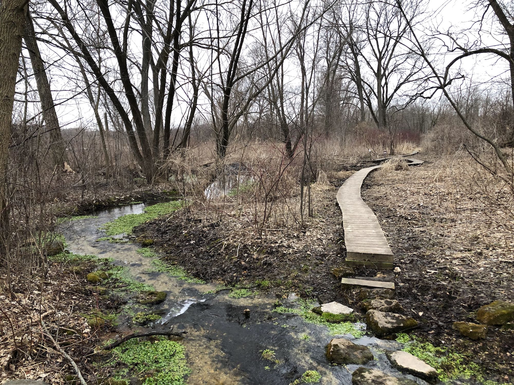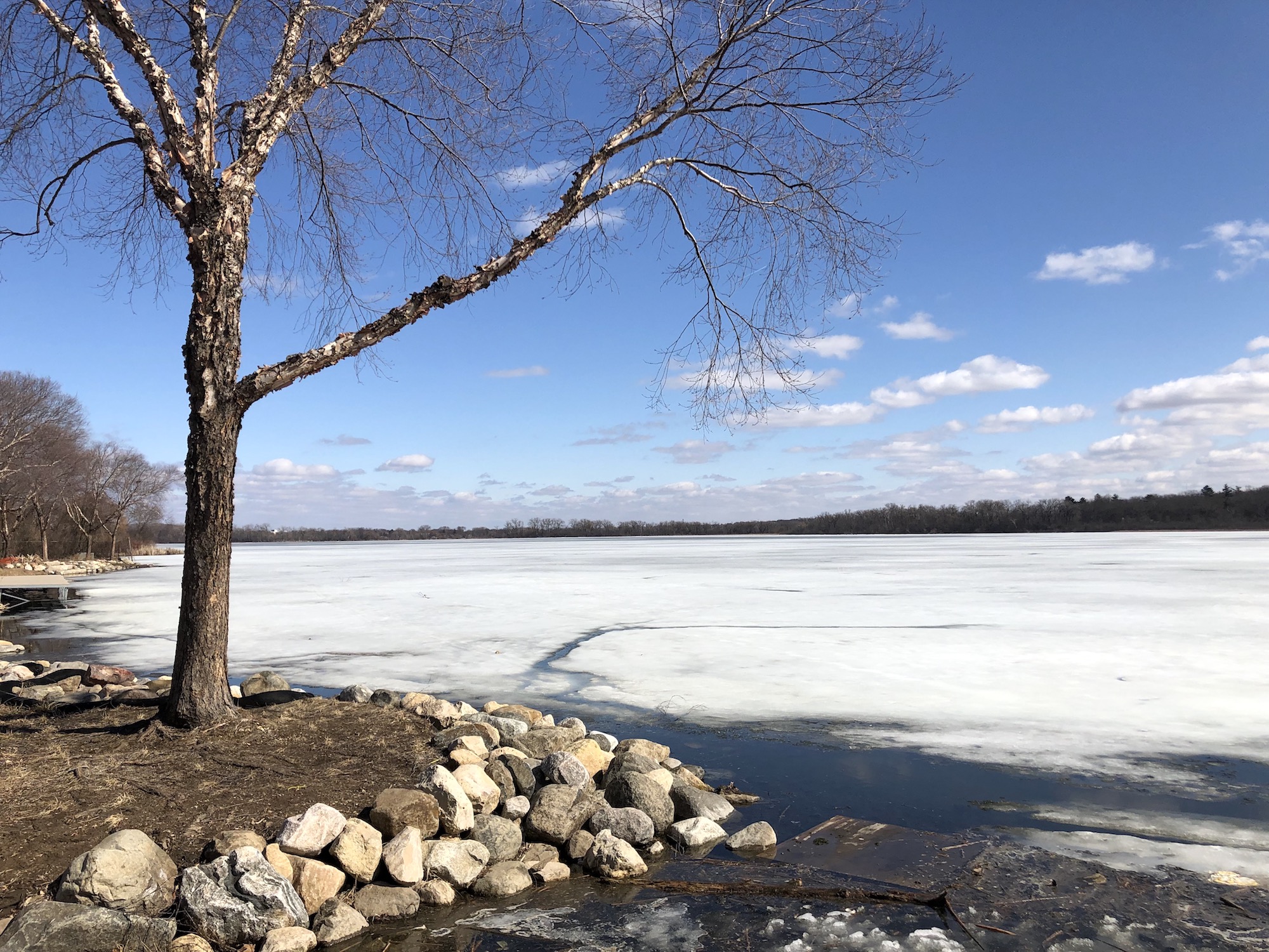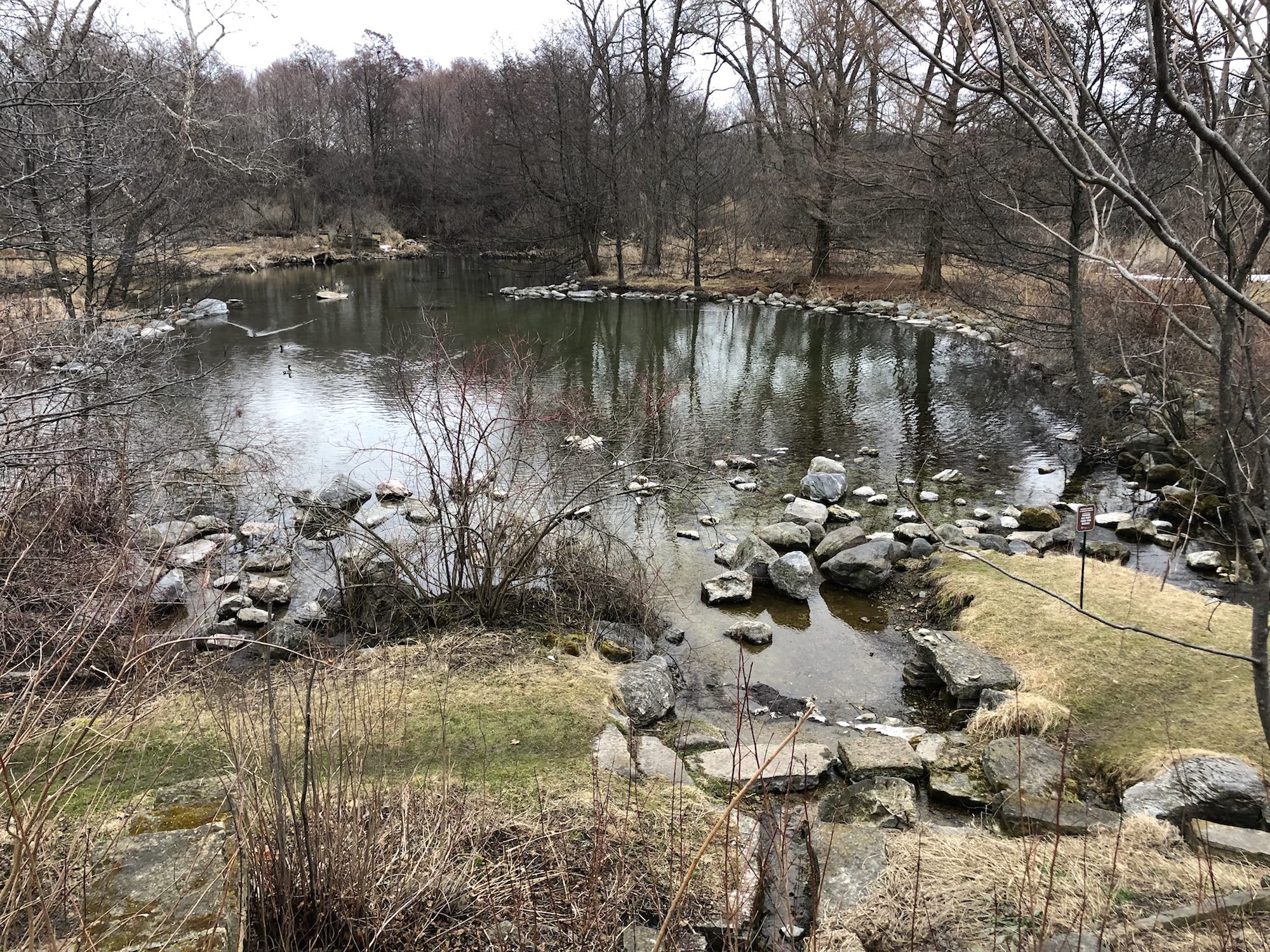 Above: Retaining pond on corner of Nakoma Road and Manitou Way on March 21, 2019 (35°).