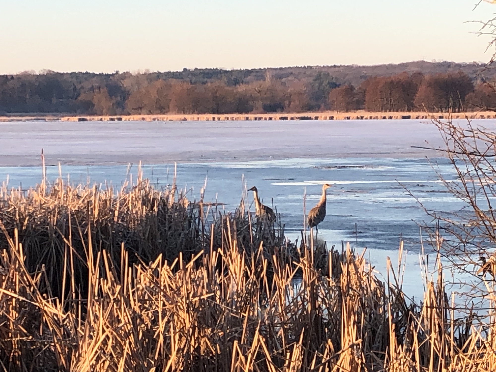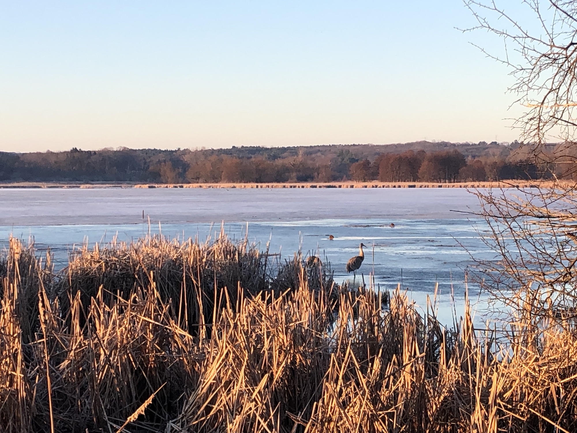 Above: Lake Wingra cattails. Two Sandhill Cranes. Redwing Blackbirds. Canada Geese. Mallards. Muskrat on edge of receeding ice.