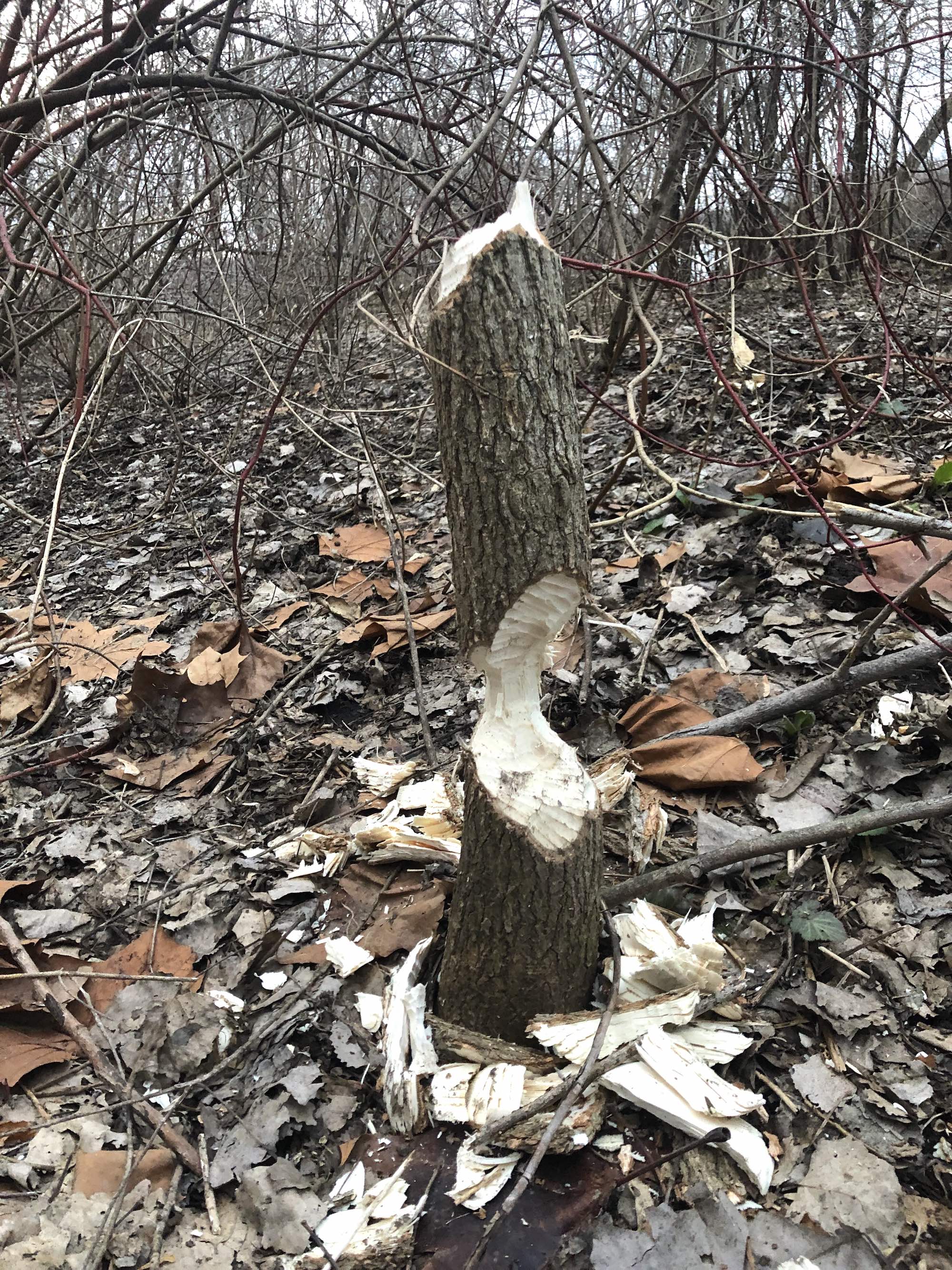 Below: Trees by Ho-Nee-Um Pond carved and felled by beaver.