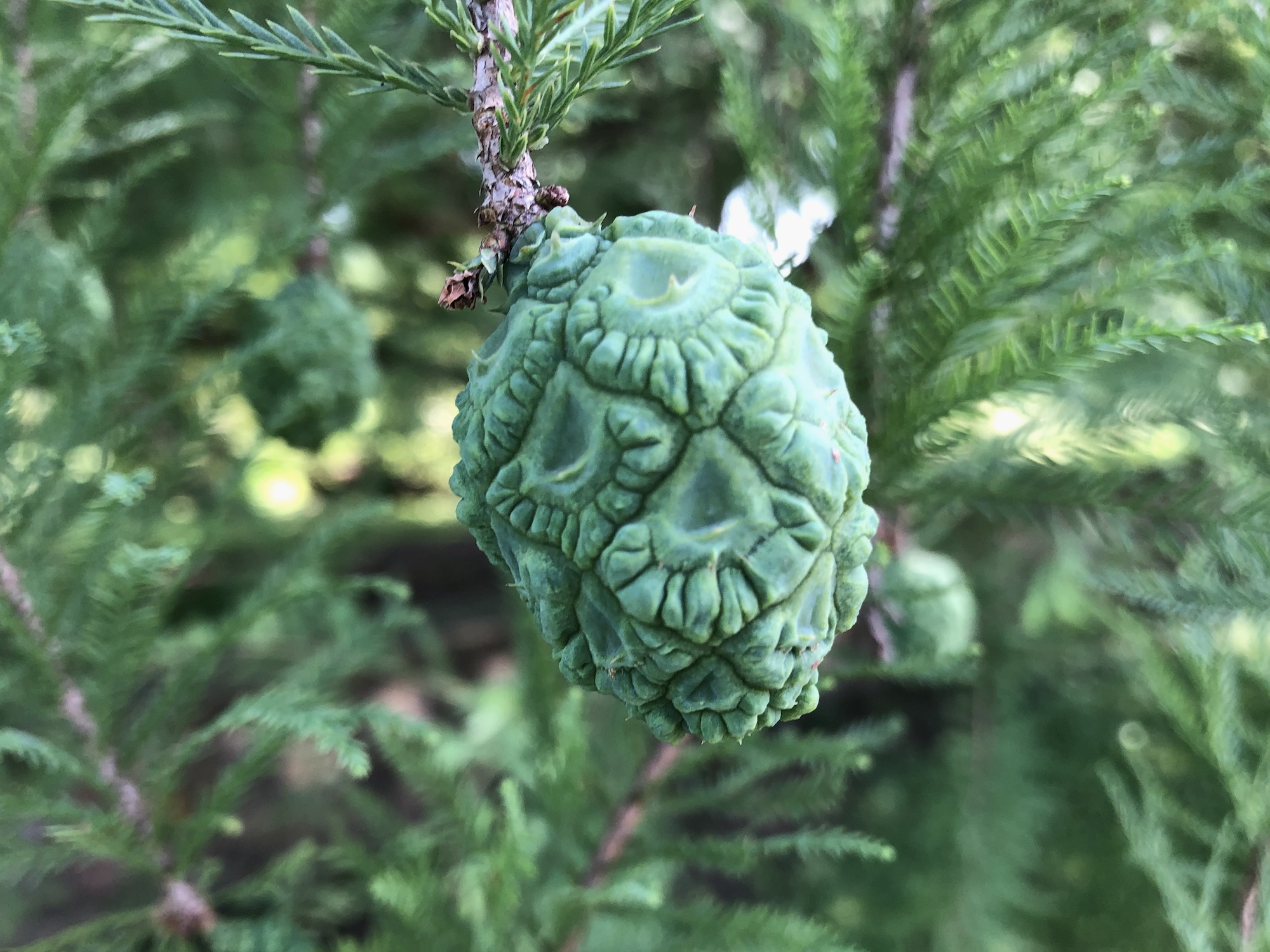Below: Immature Bald Cypress pine cone along CCC stone wall in UW Arboretum's Viburnum Garden off of Manitou Way.