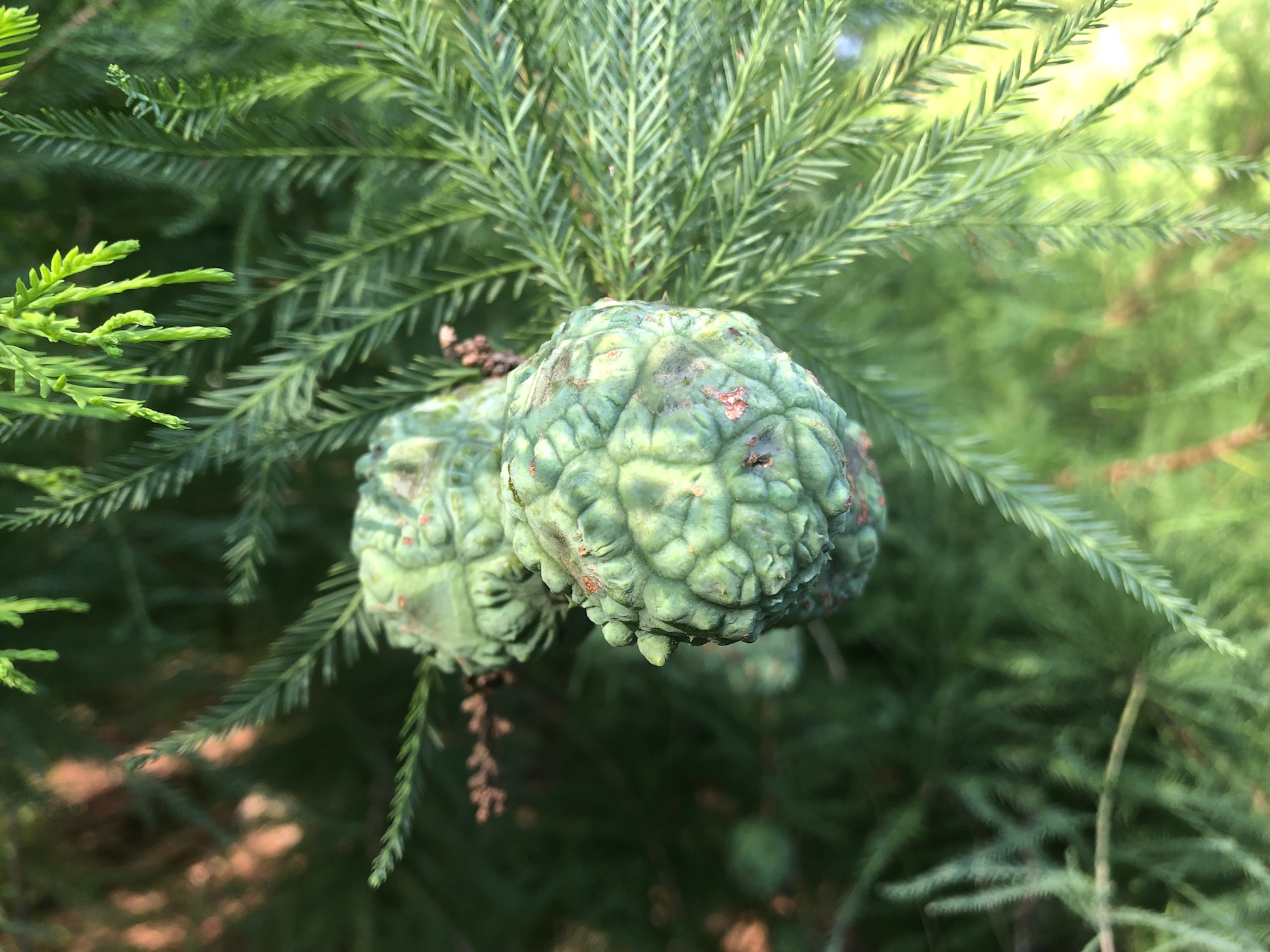 Above: Bald Cypress cones in UW Arboretum's Viburnum Garden off of Manitou Way on August 21, 2019. Note: longer spur at back of flower that curves back to front. (71°).