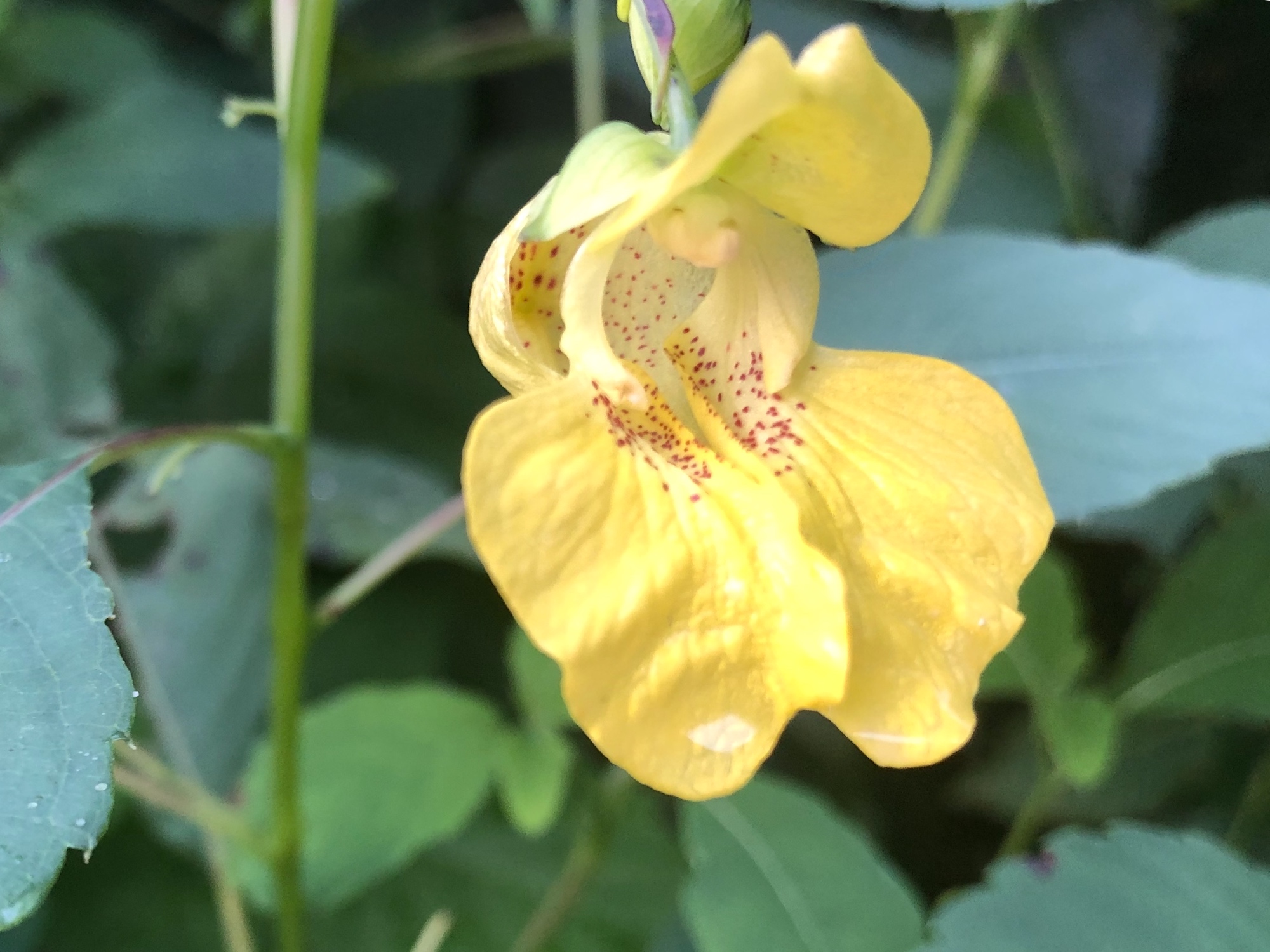 Above: Yellow Jewelweed on bank of Duck Pond on August 21, 2019. Note: Shorter spur at back of flower that curves back to front. (71°).