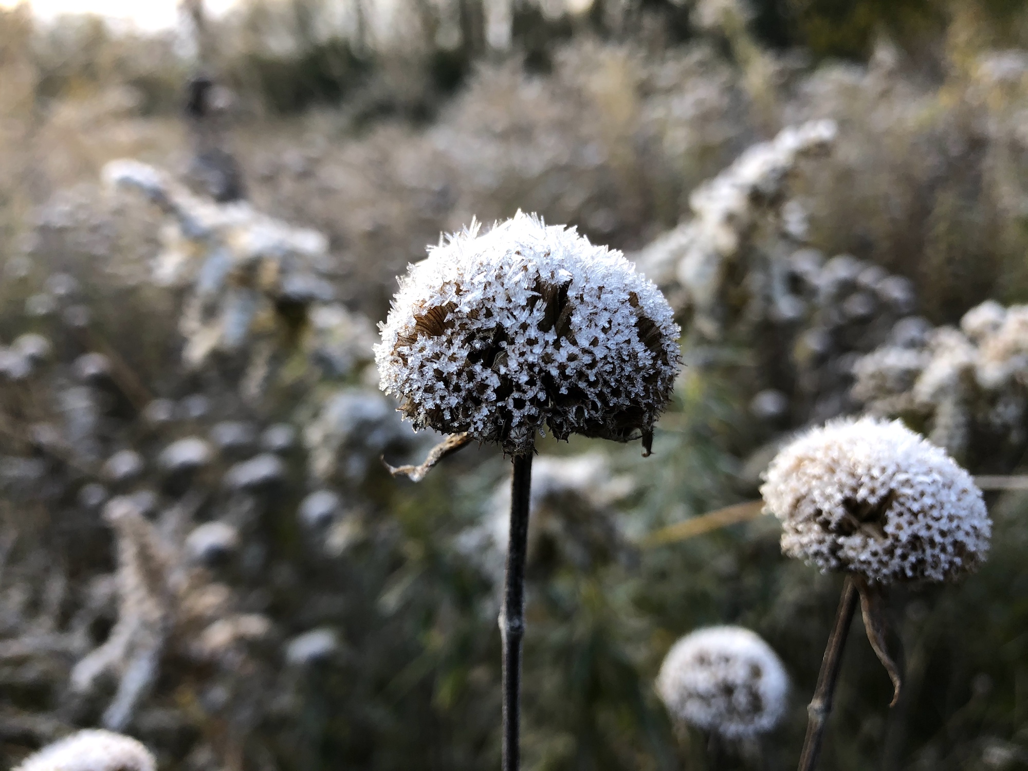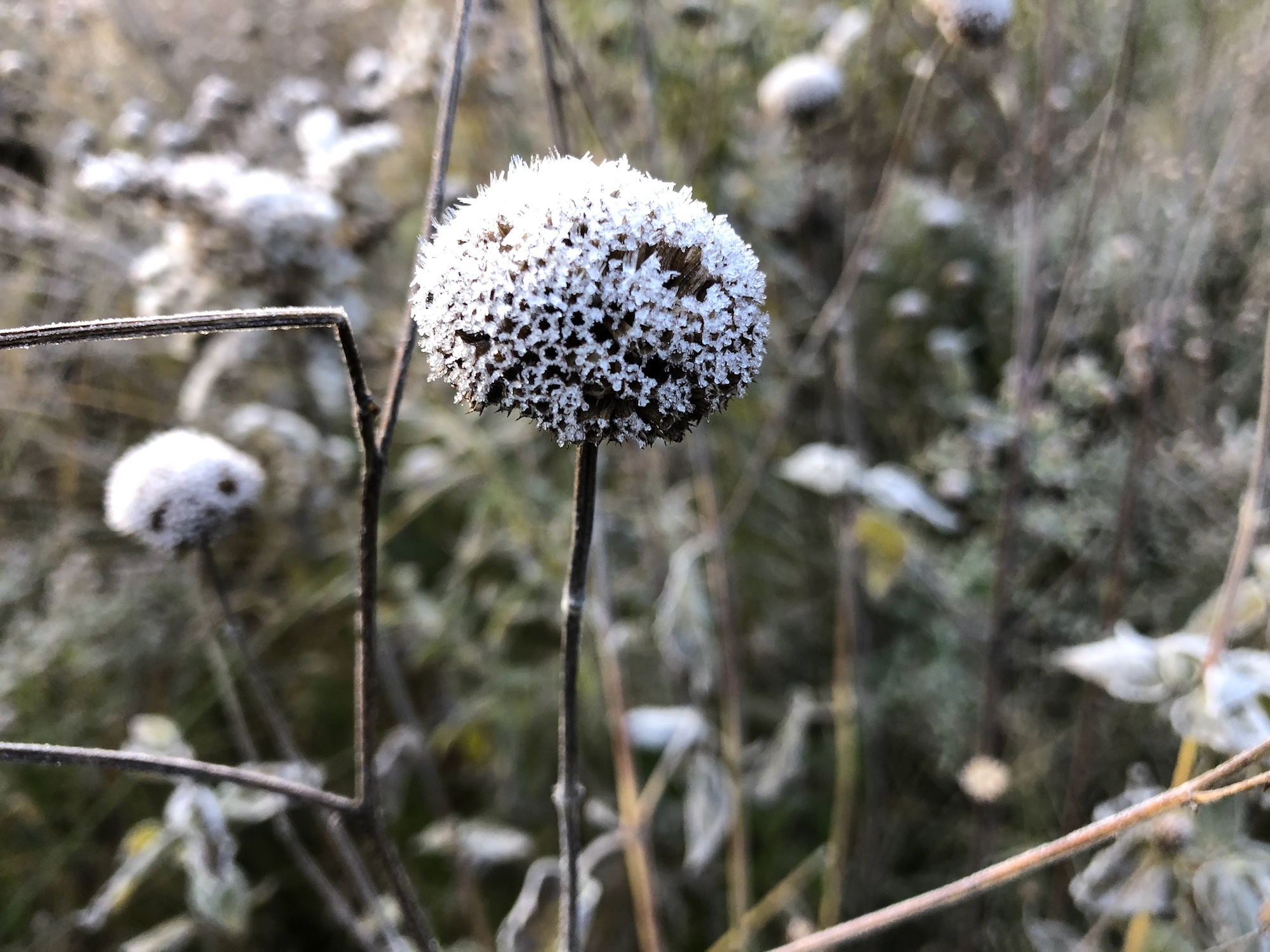 Above: Bergamot seed pods with morning frost along banks of Marion Dunn Pond (10/25/19)