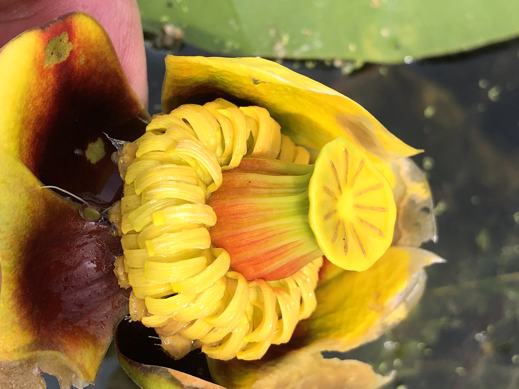 Above: The inside of the Bull-head pond-lily flower (was dying back inder the water) in Lake Wingra in Madison, Wisconsin on June 10, 2023.
