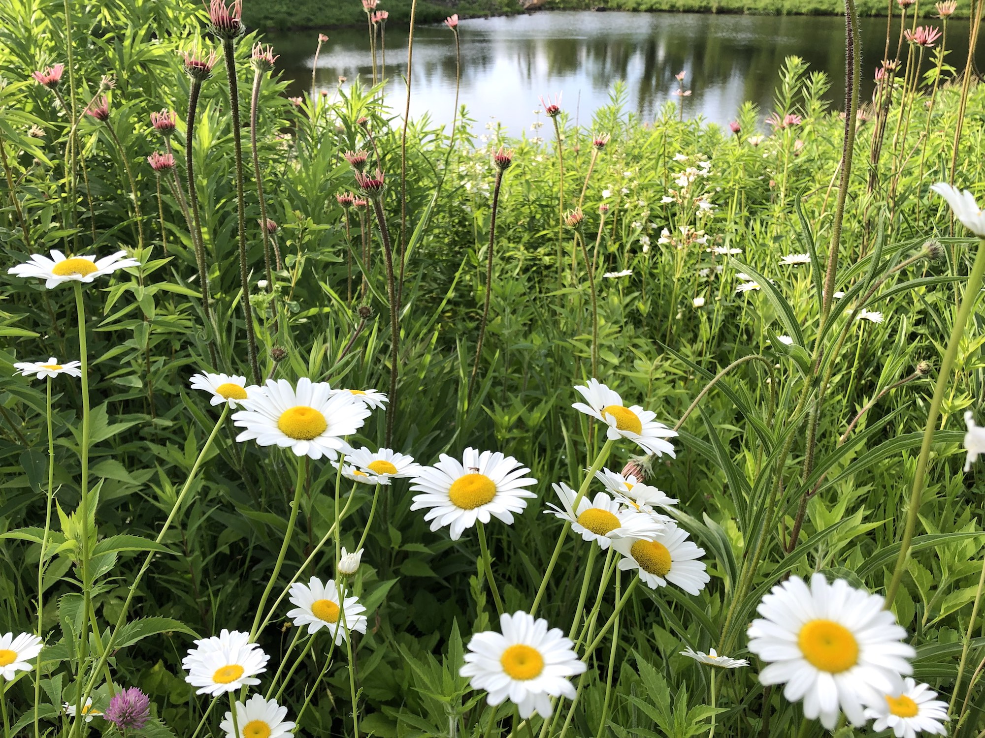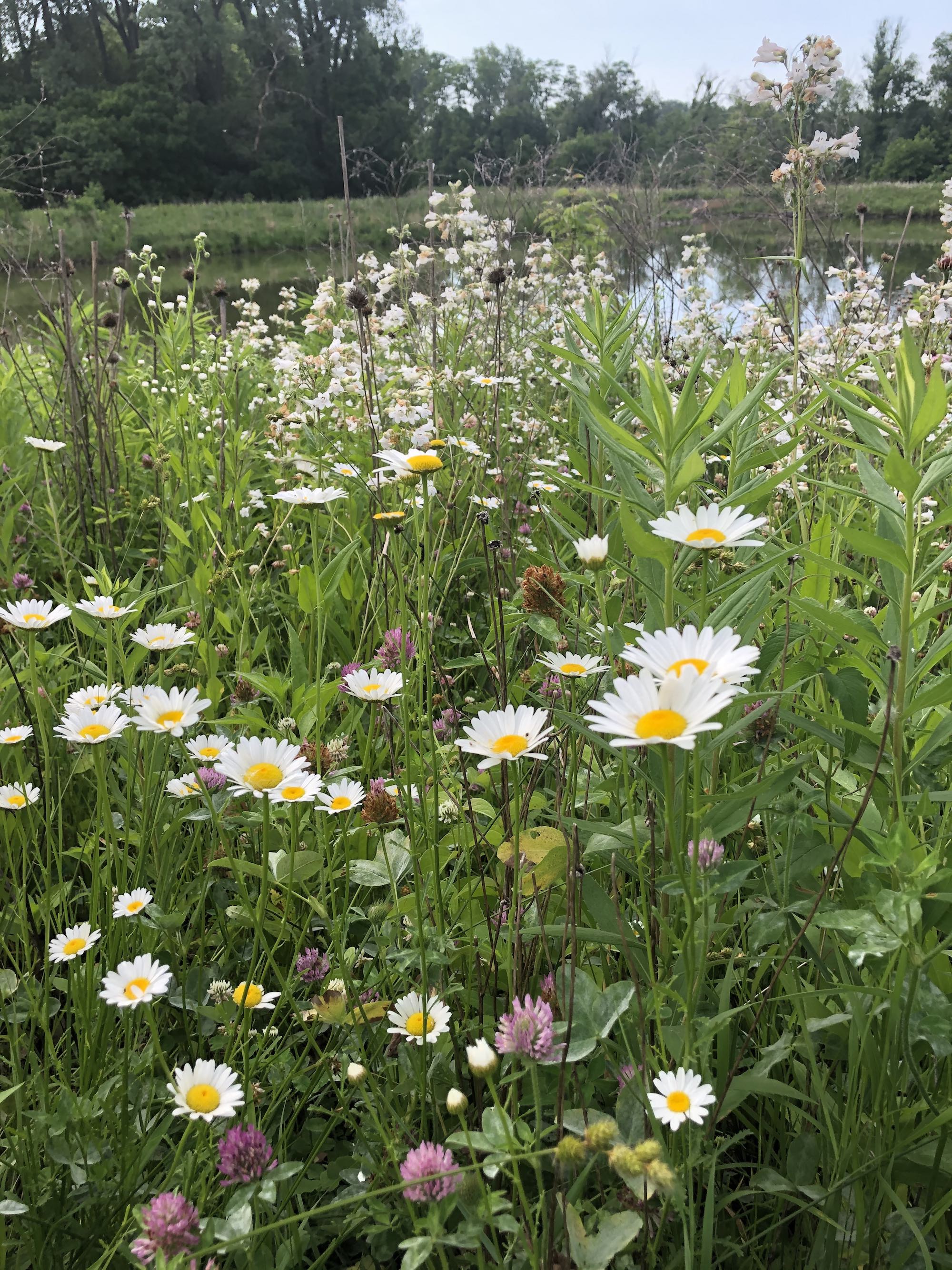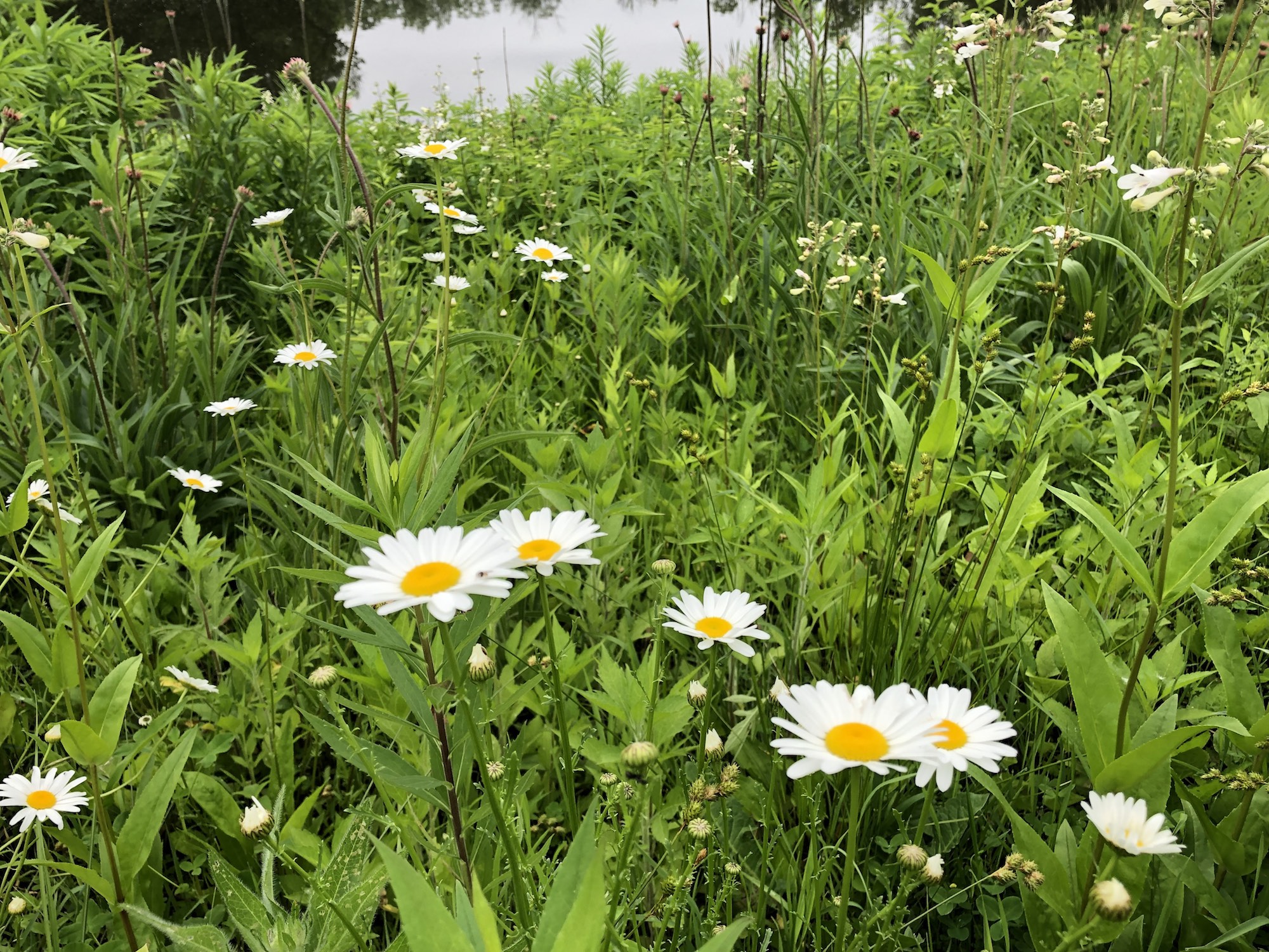 Above: Daisies on bank retaining pond at the corner of Manitou Way and Nakoma Road in Madison, Wisconsin on June 20, 2019.