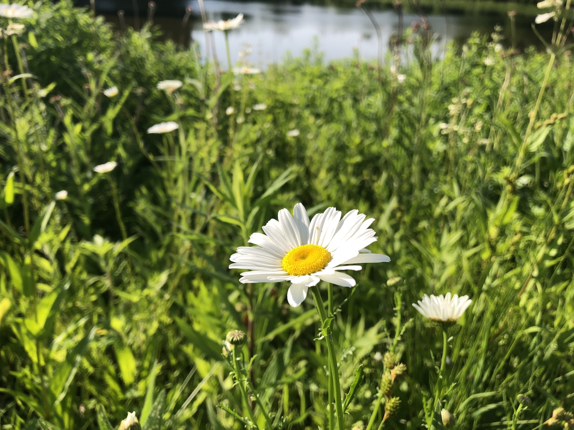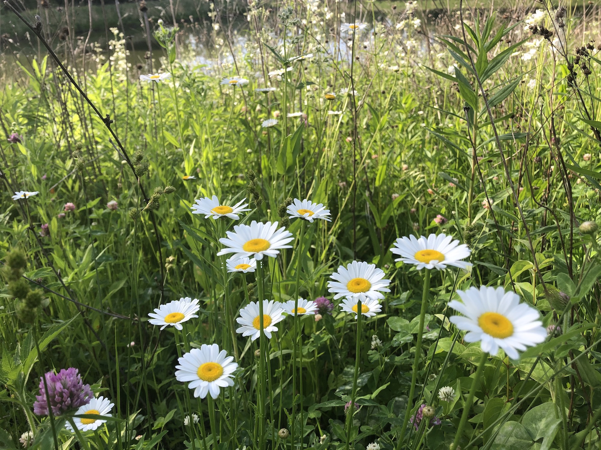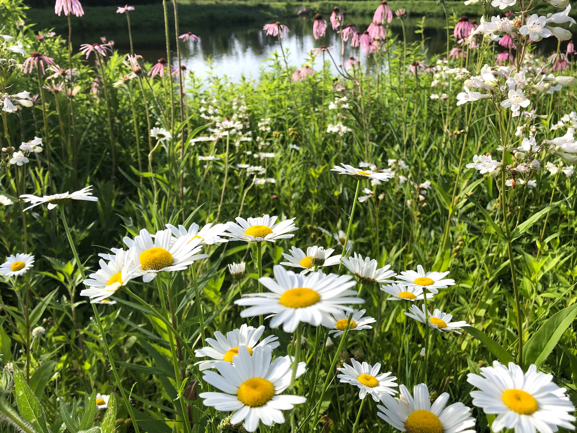 Above: Daisies on bank retaining pond at the corner of Manitou Way and Nakoma Road in Madison, Wisconsin on June 20, 2019.
