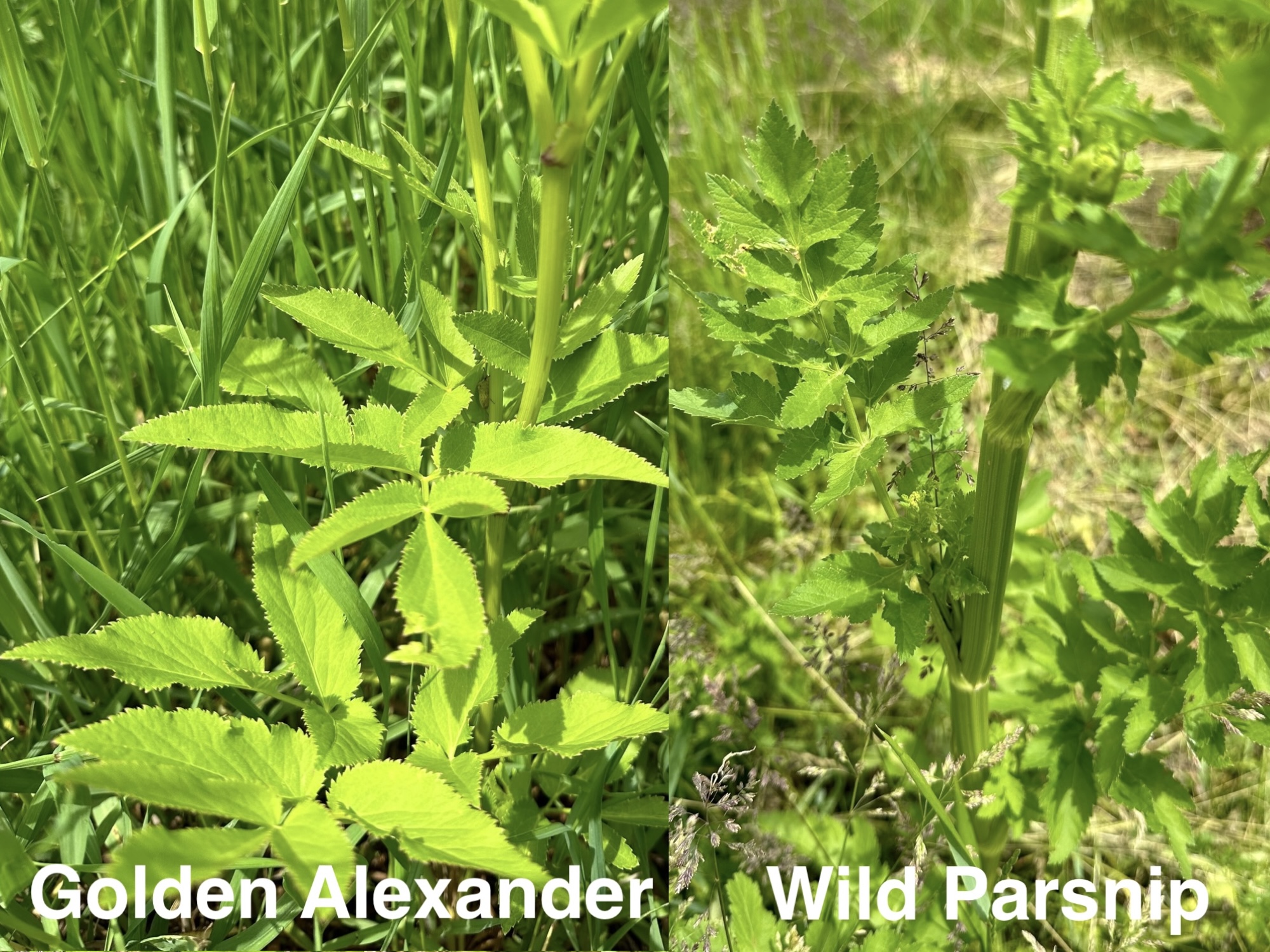 Golden Alexander leaves have small teeth along the edge and an overall palm-shaped or maple-leaf outline. Wild Parsnip leaves are oval to oblong, feather-shaped, with many large-toothed leaflets growing from a central vein.