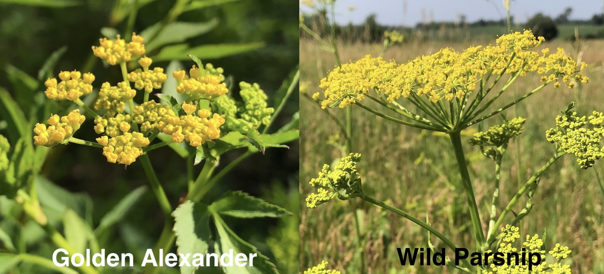 Above: On the left, Golden Alexander umbel, stem and leaves (the stem light green, hairless, and shiny). On the right, Wild Parsnip umbel, stem and leaves (the stem is angular and furrowed).