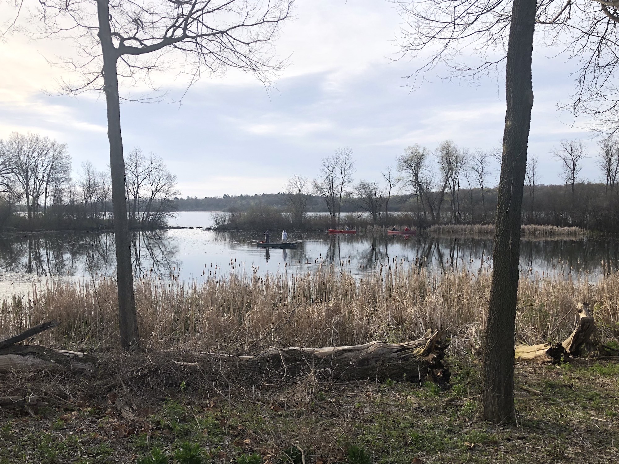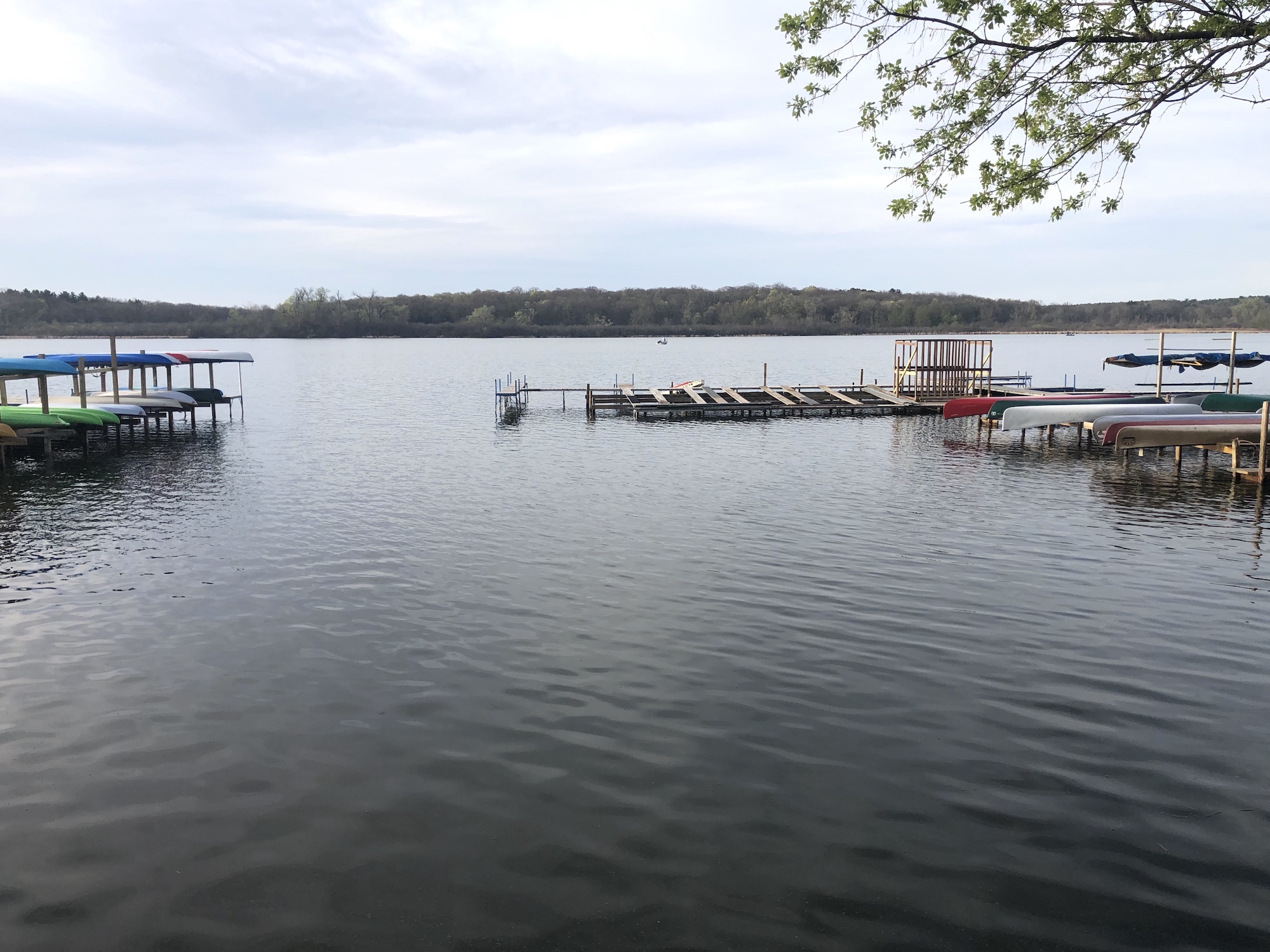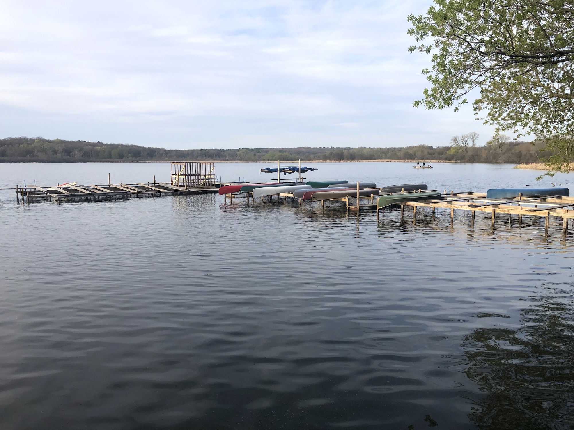 Fifteen boats dispersed on lake.