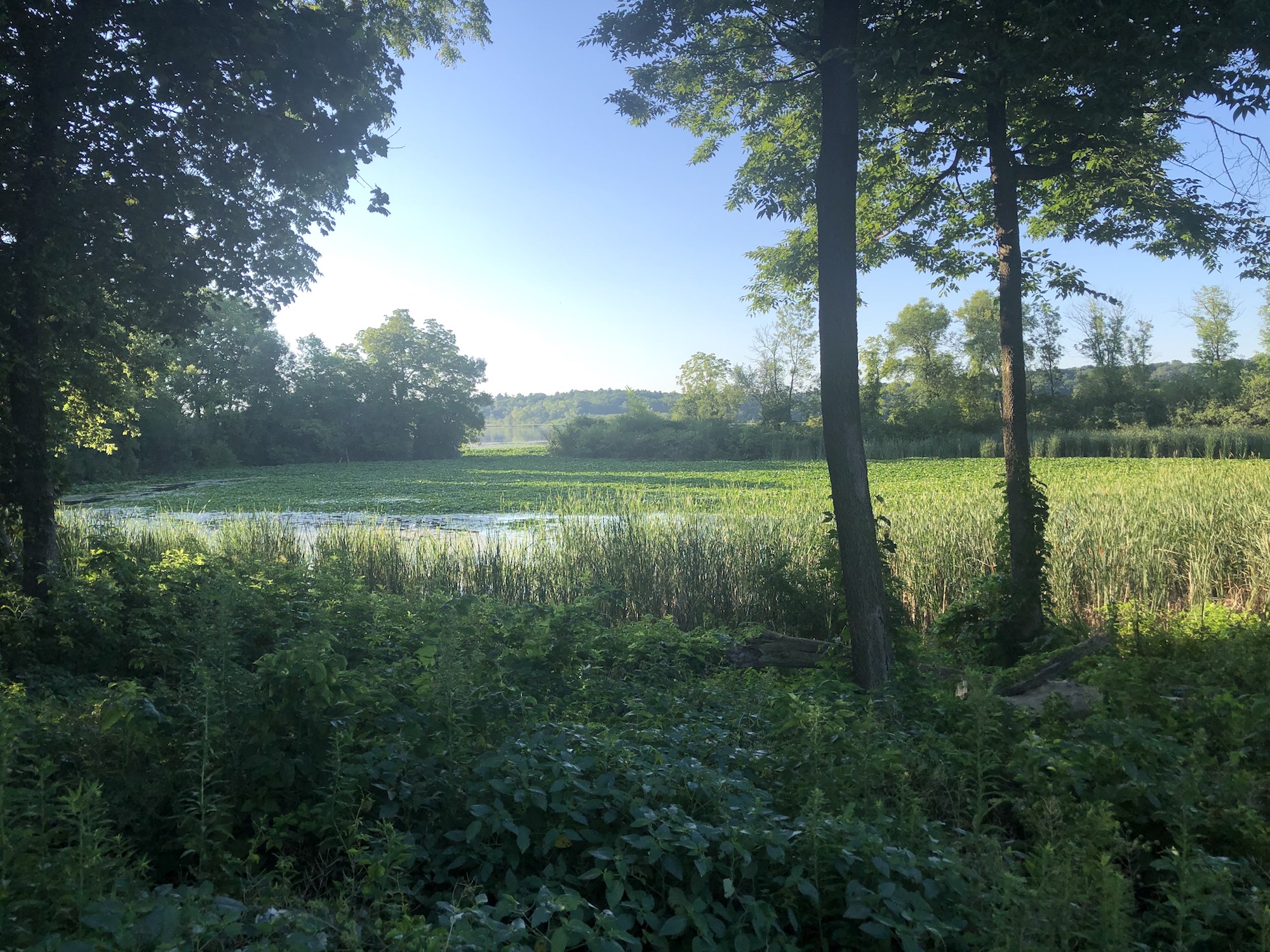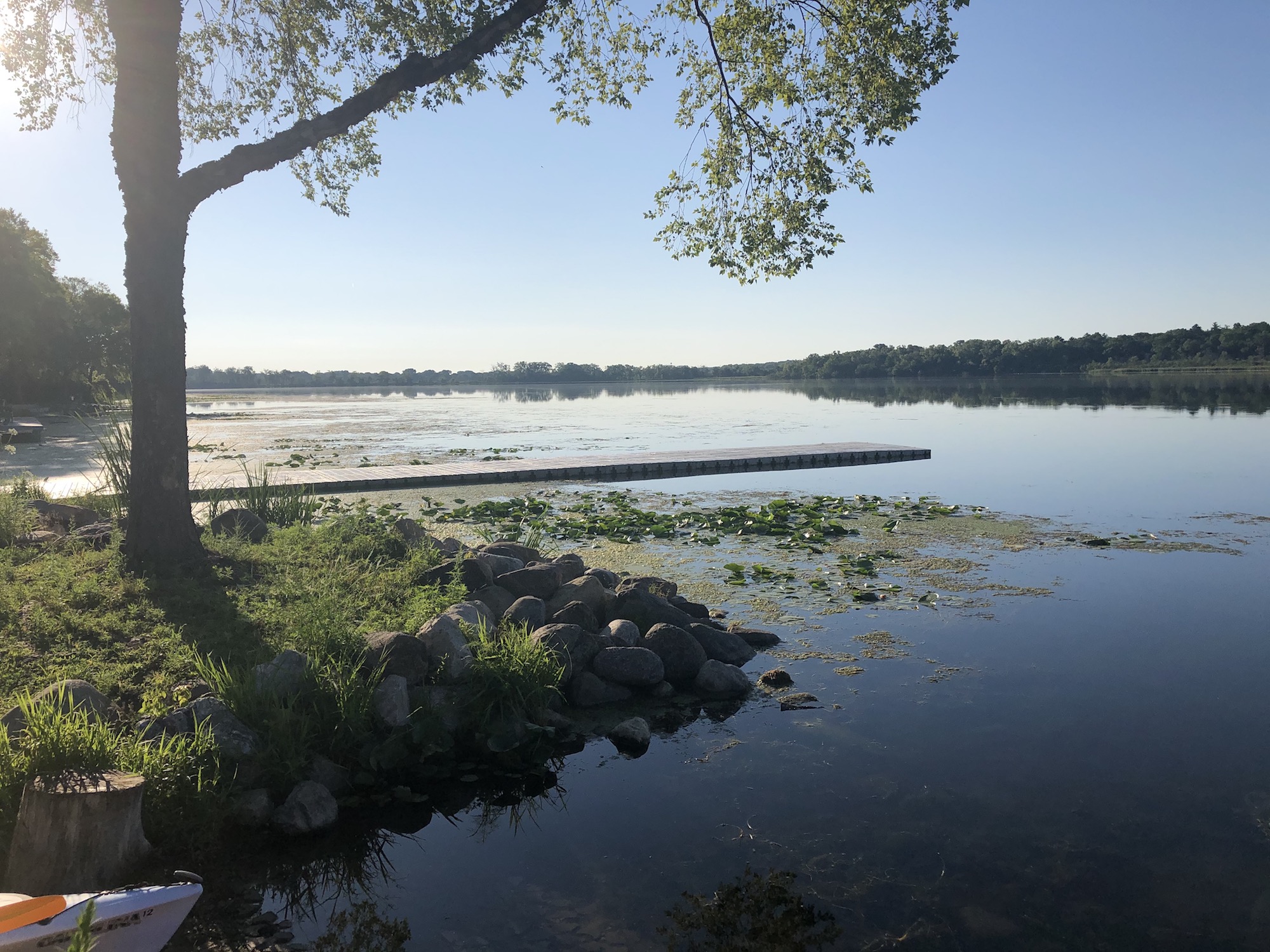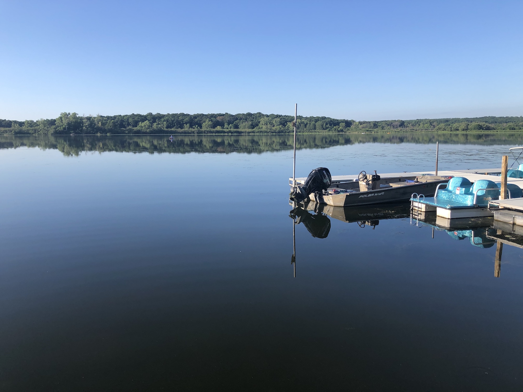 Clear sky, refelecting lake.