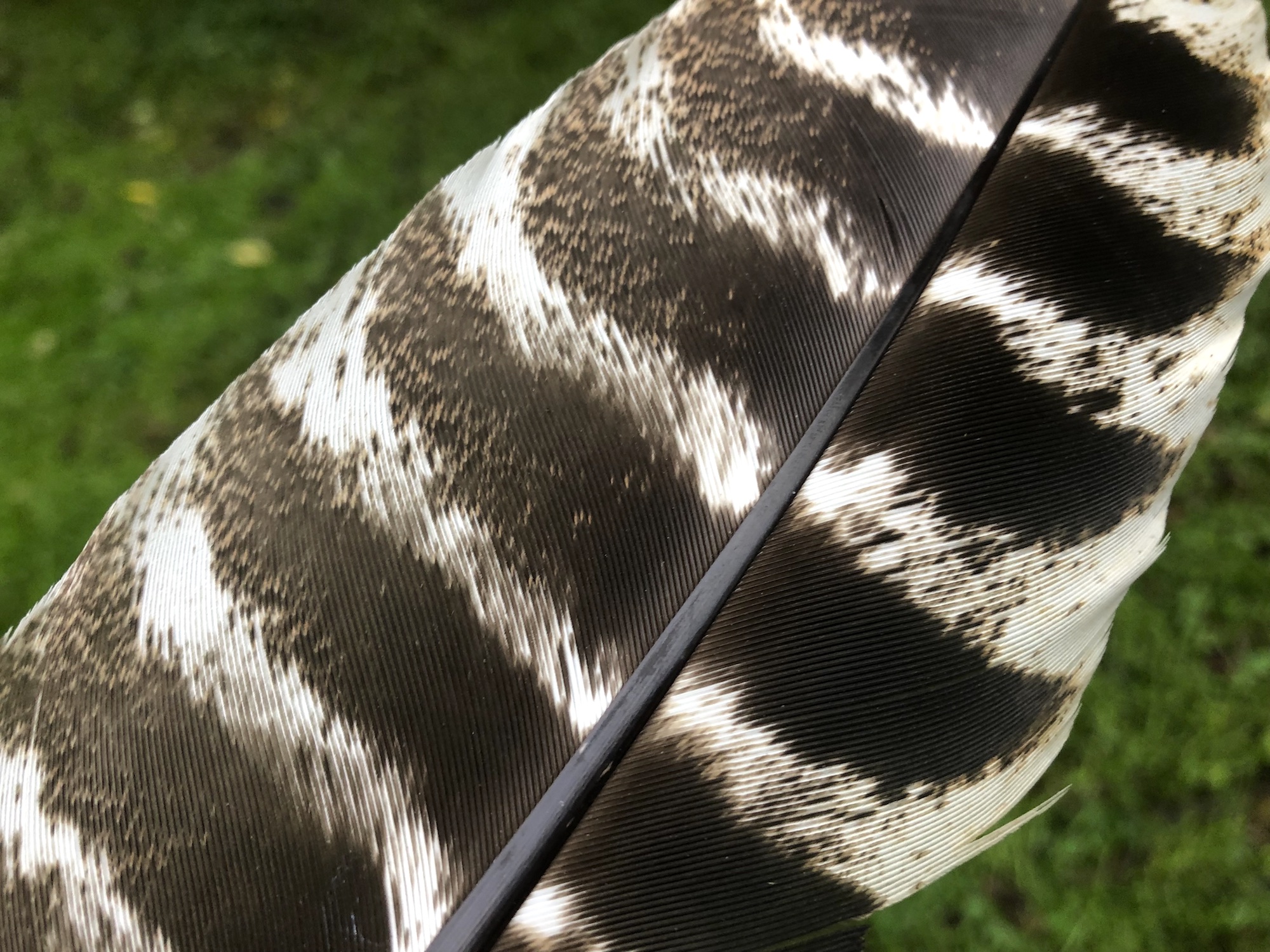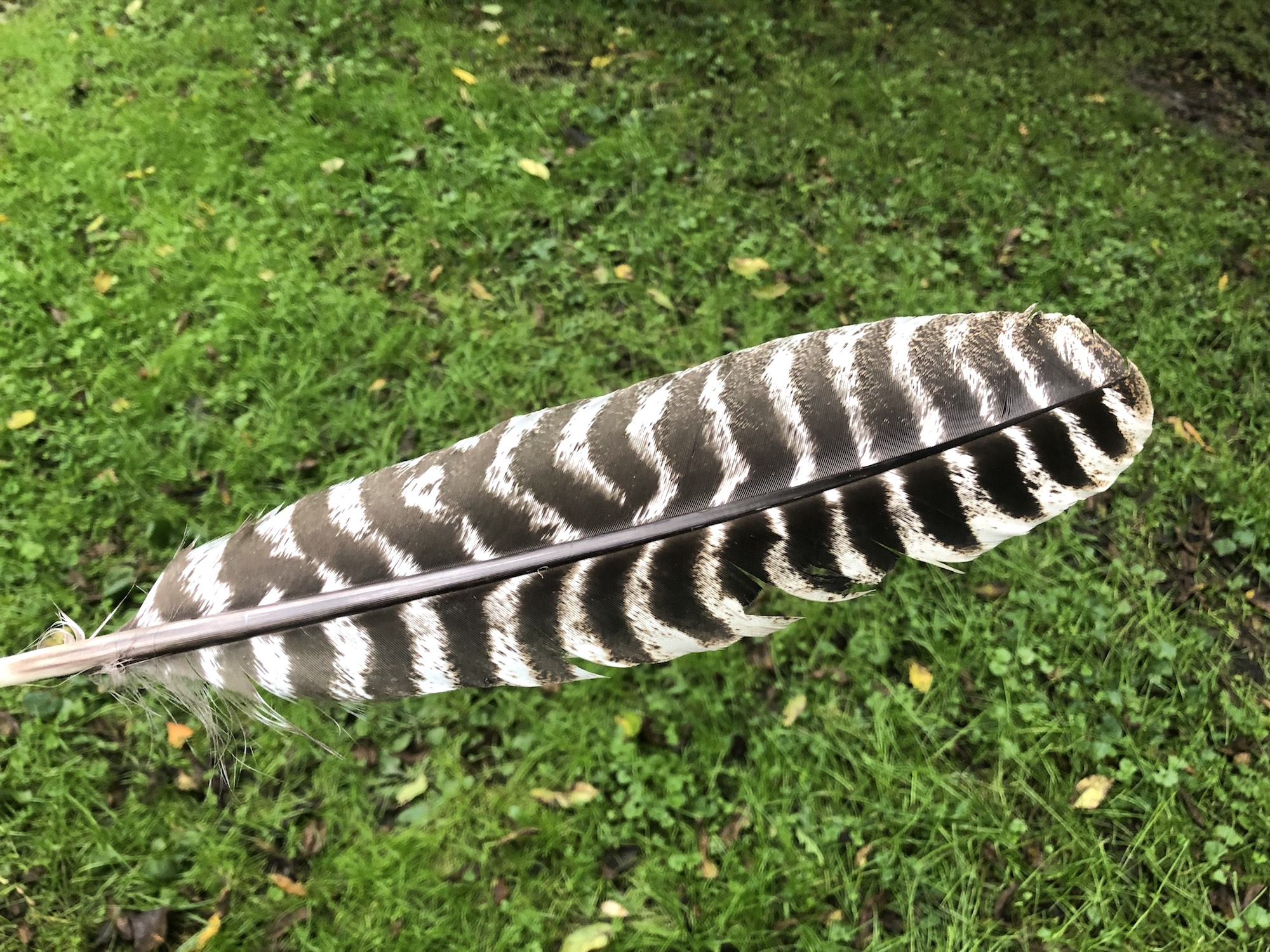 Above: Wild Turkey feather by Stevens Pond on October 4, 2019 (46°).