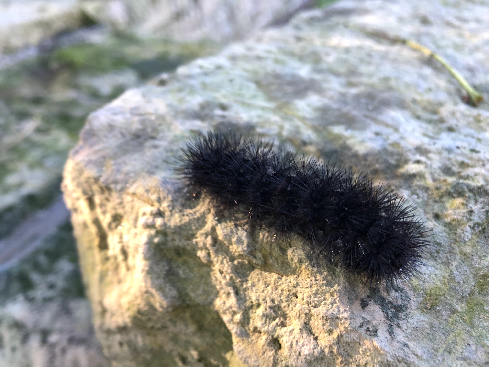 Below: Giant Leopard Moth Caterpillar on stone wall by Duck Pond.