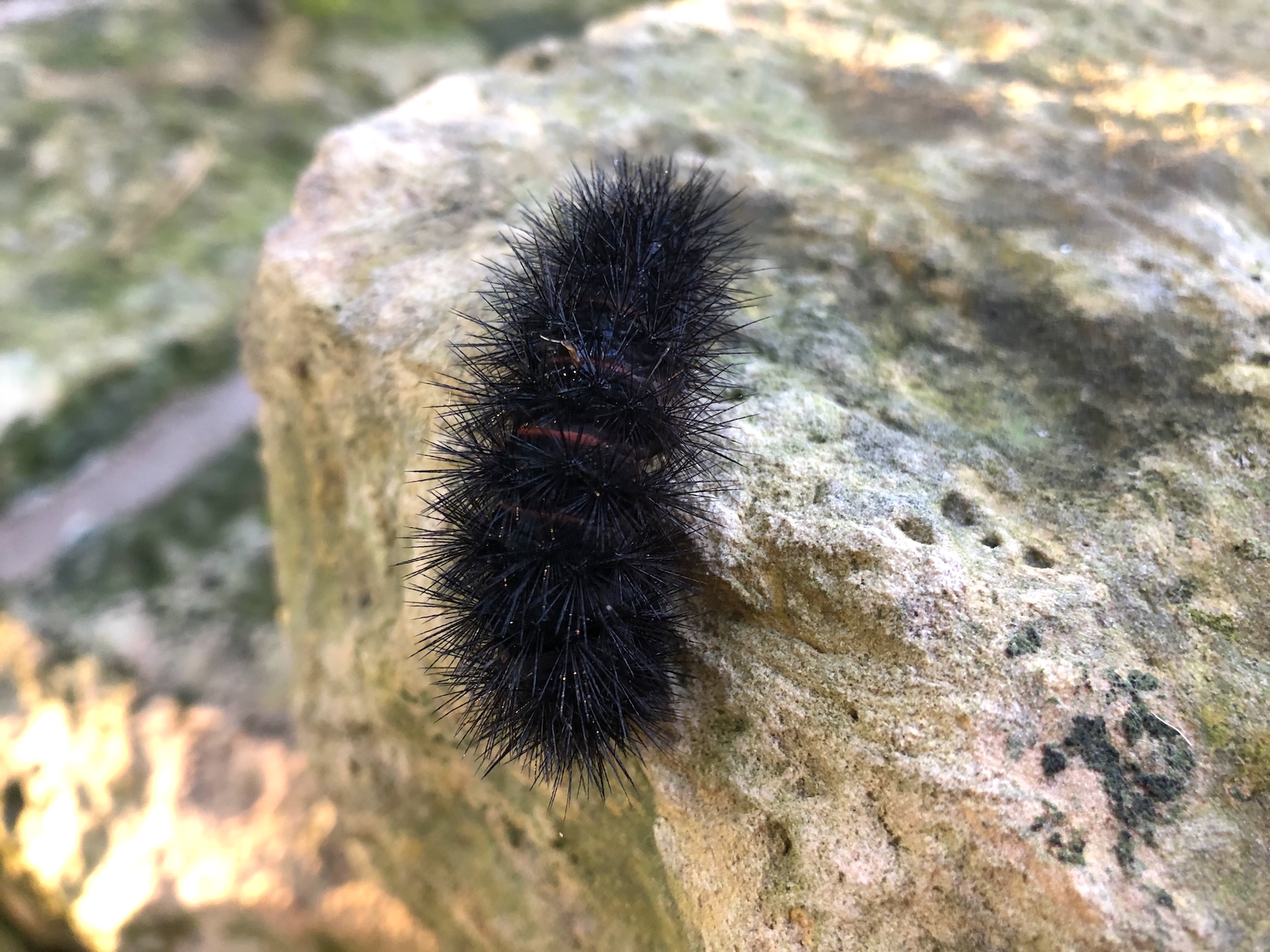 Above: Giant Leopard Moth Caterpillar on stone wall by Duck Pond on October 14, 2019 (35°).