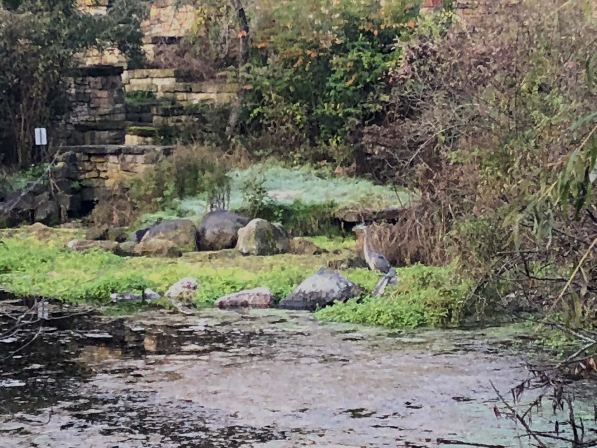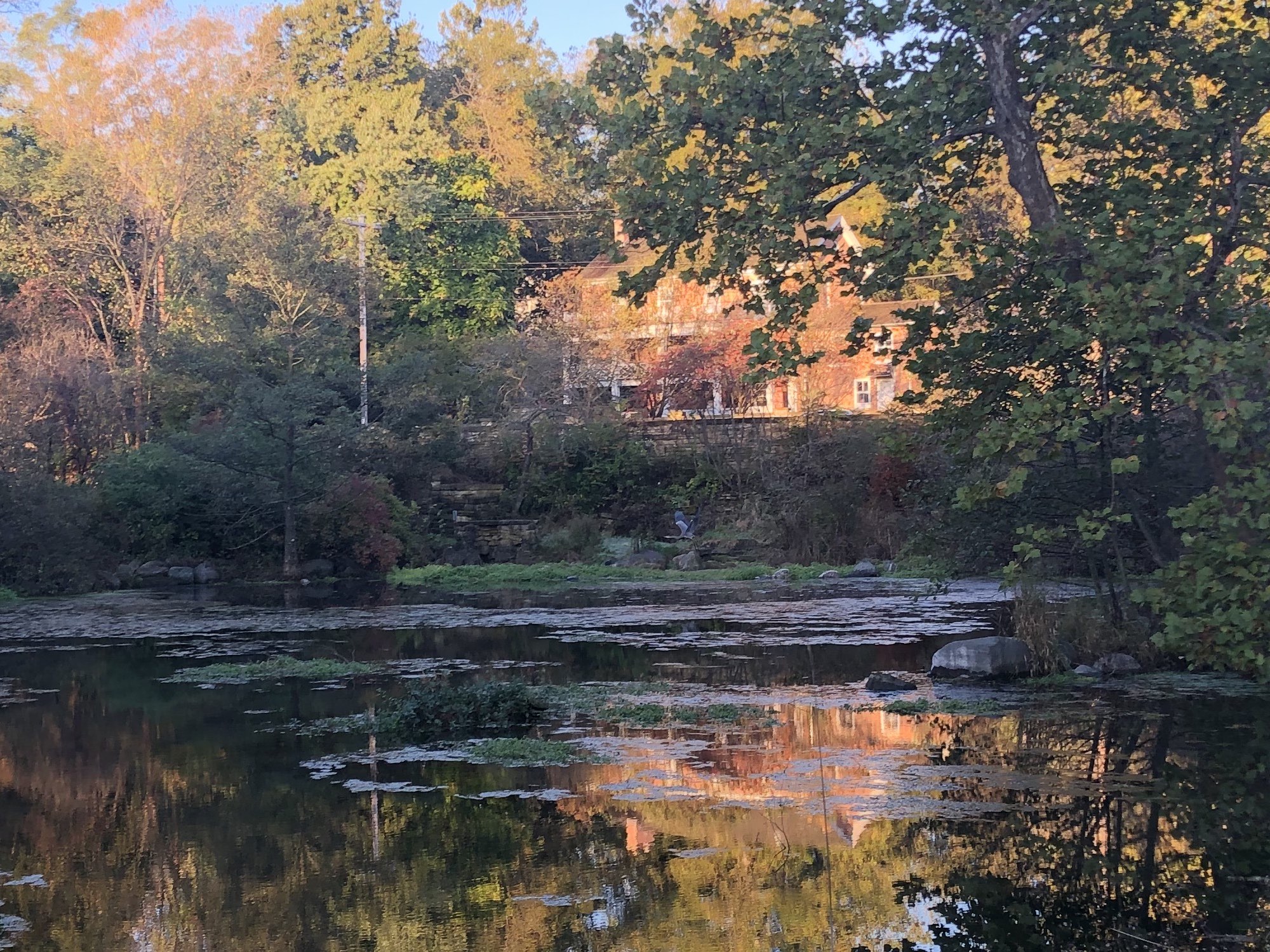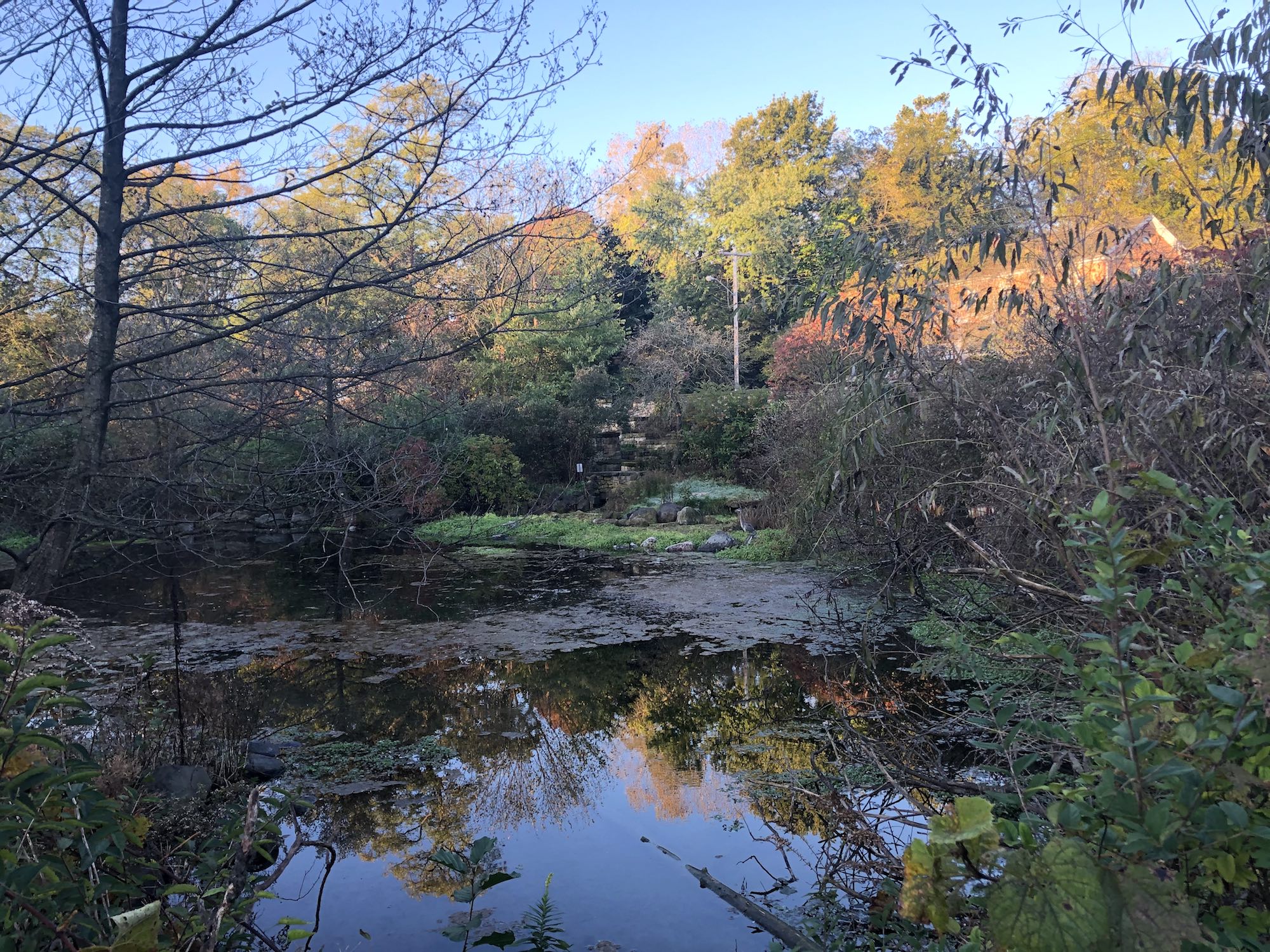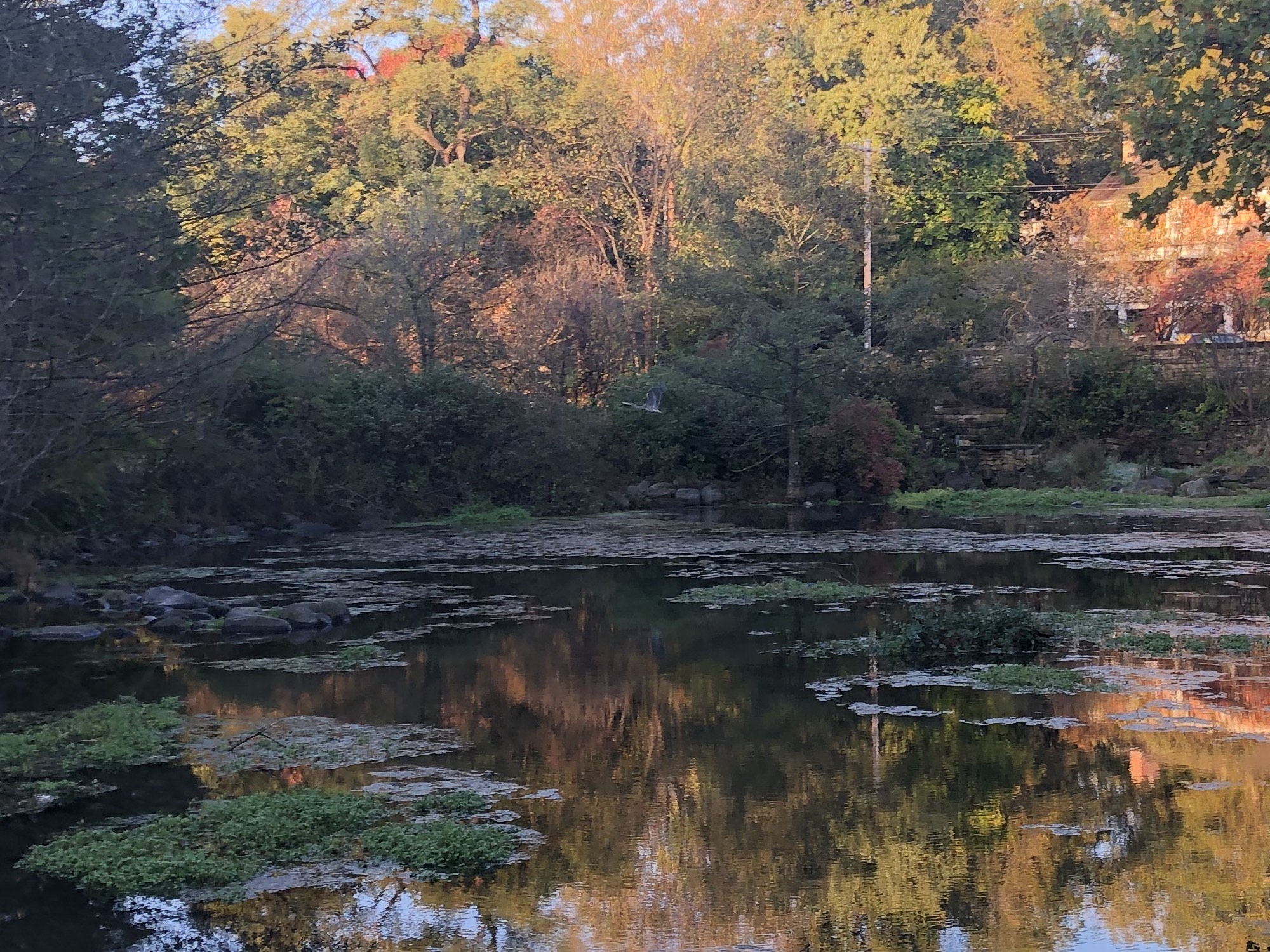 Above: Duck Pond on October 14, 2019 (35°). Great Blue Heron in Duck Pond near stone wall.