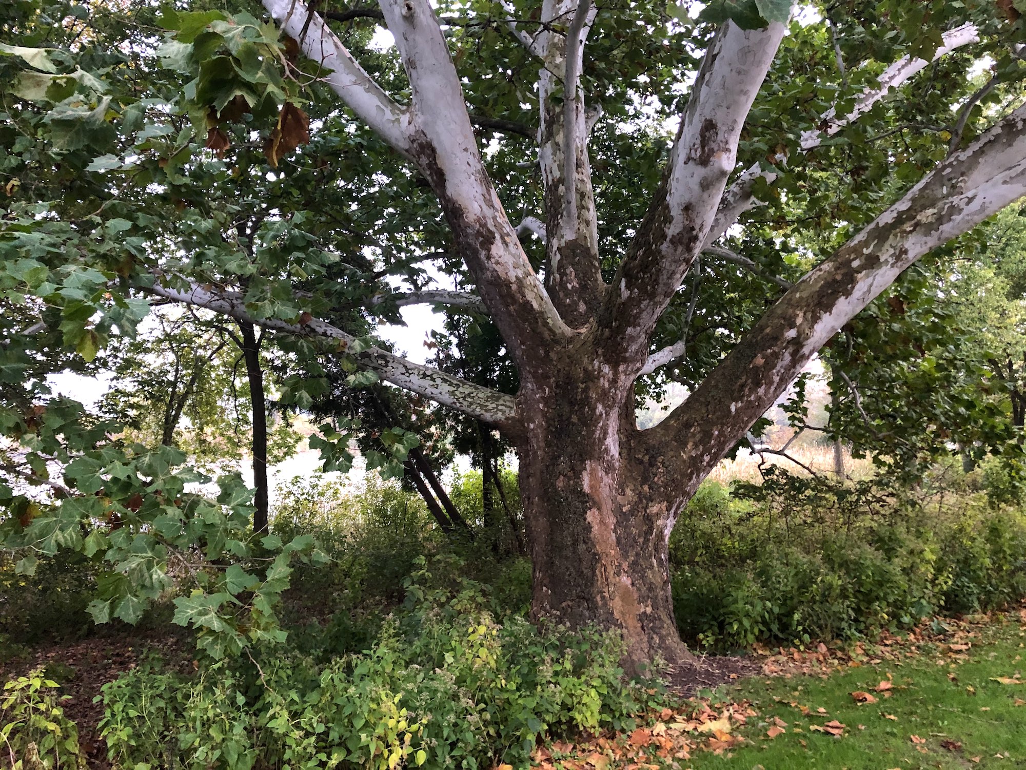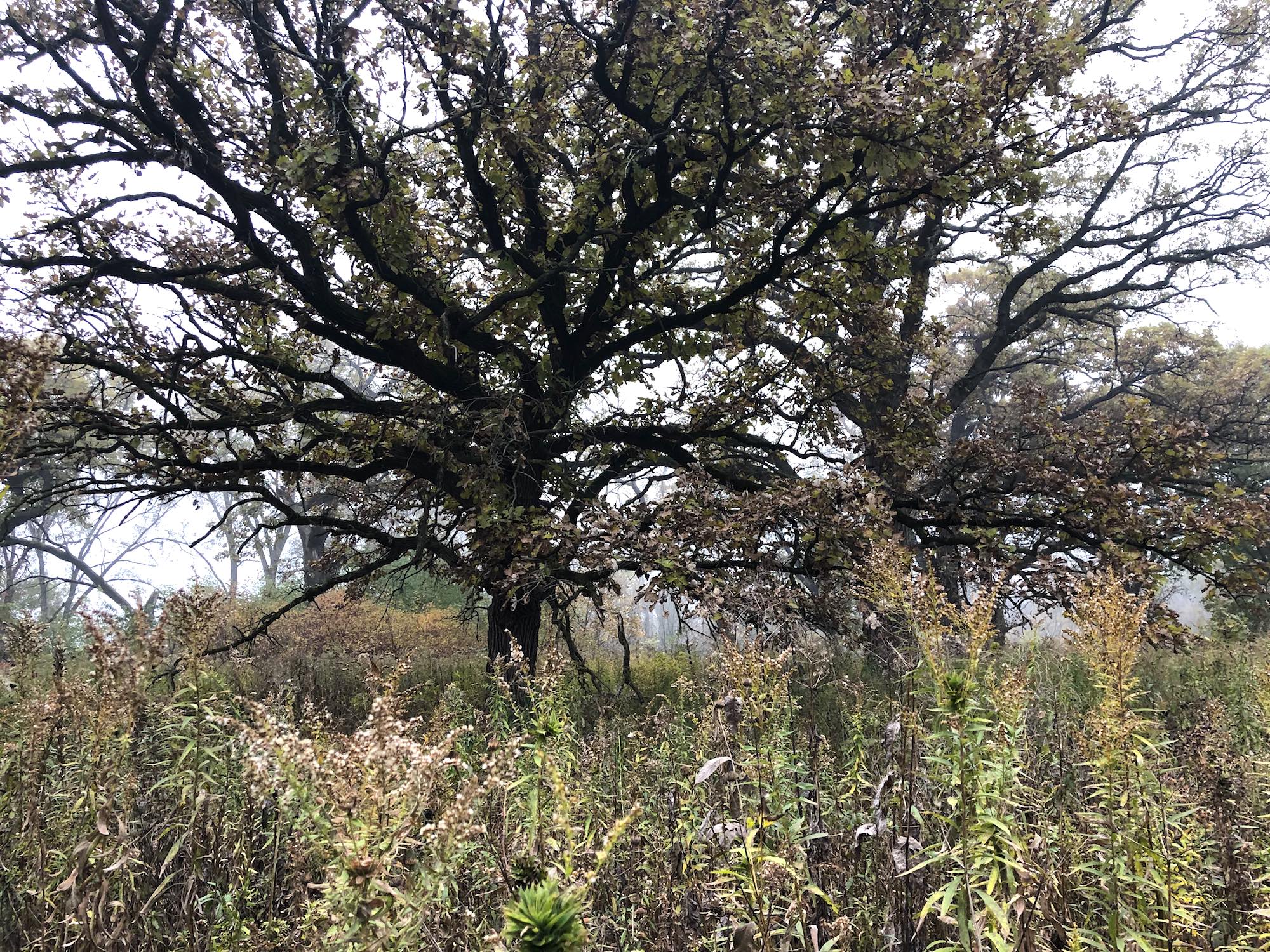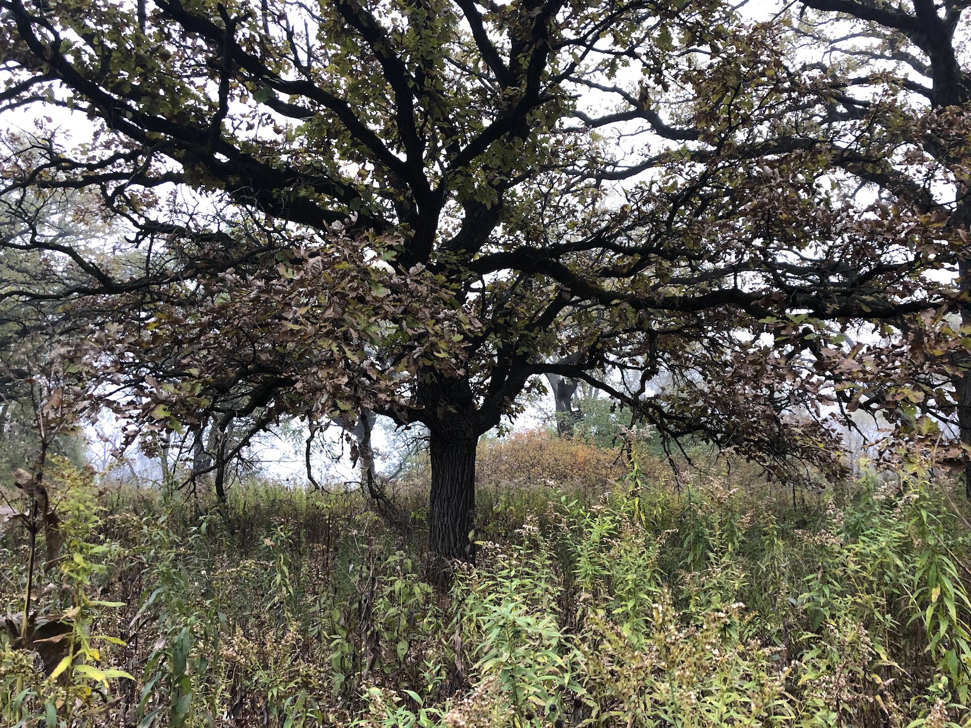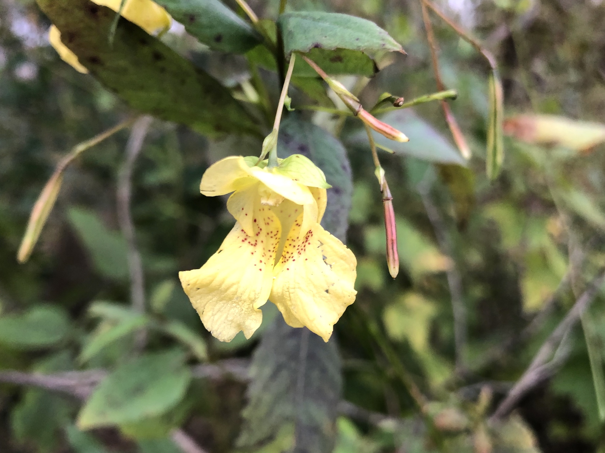 Above: Yellow Jewelweed (Impatiens pallida) at edge of woods between Oak Savanna and Marion Dunn on October 20, 2019 (49°). Seed pods are long cylinders drooping next to blossom. Also known as pale jewelweed and pale touch-me-not.
