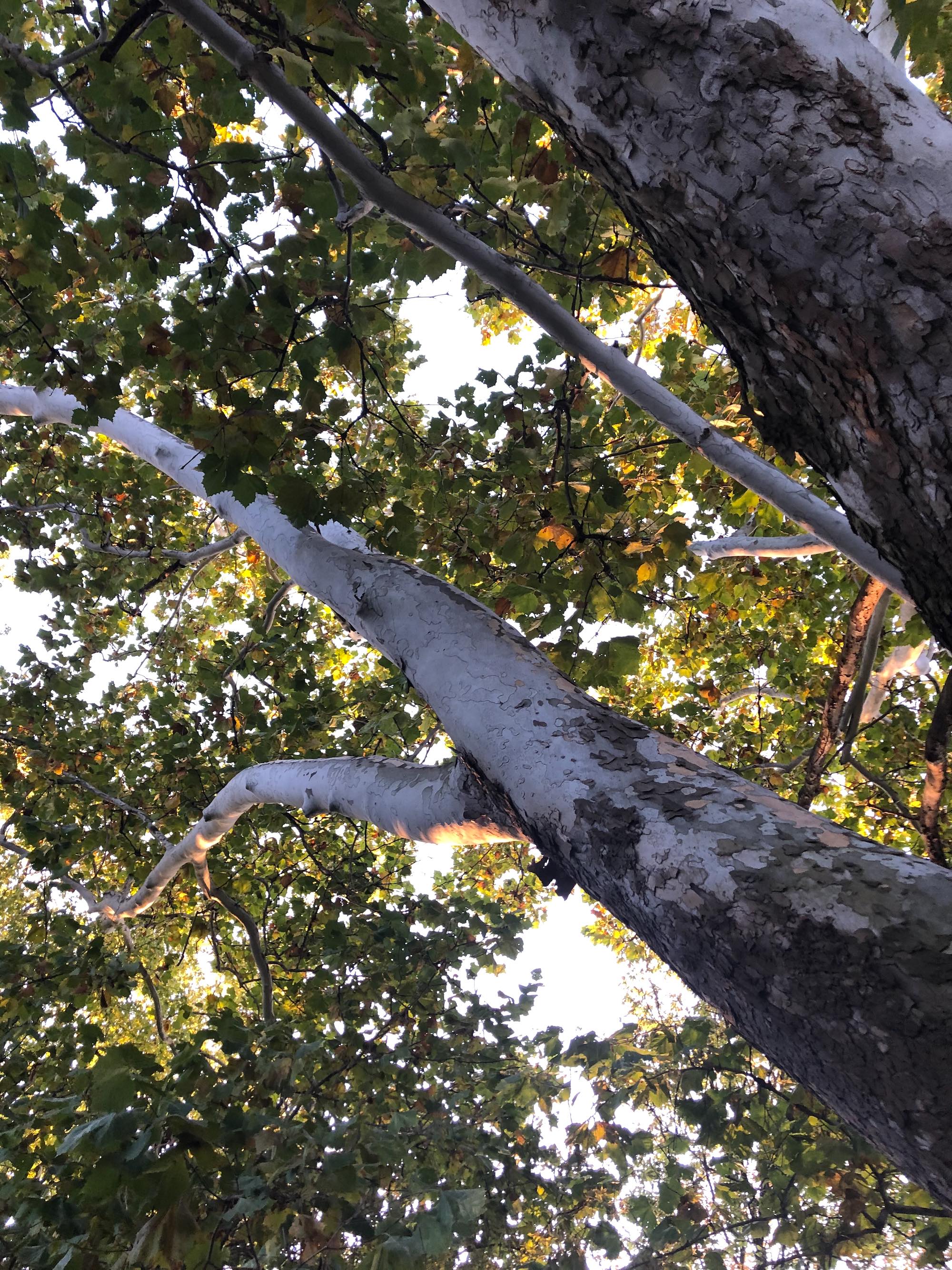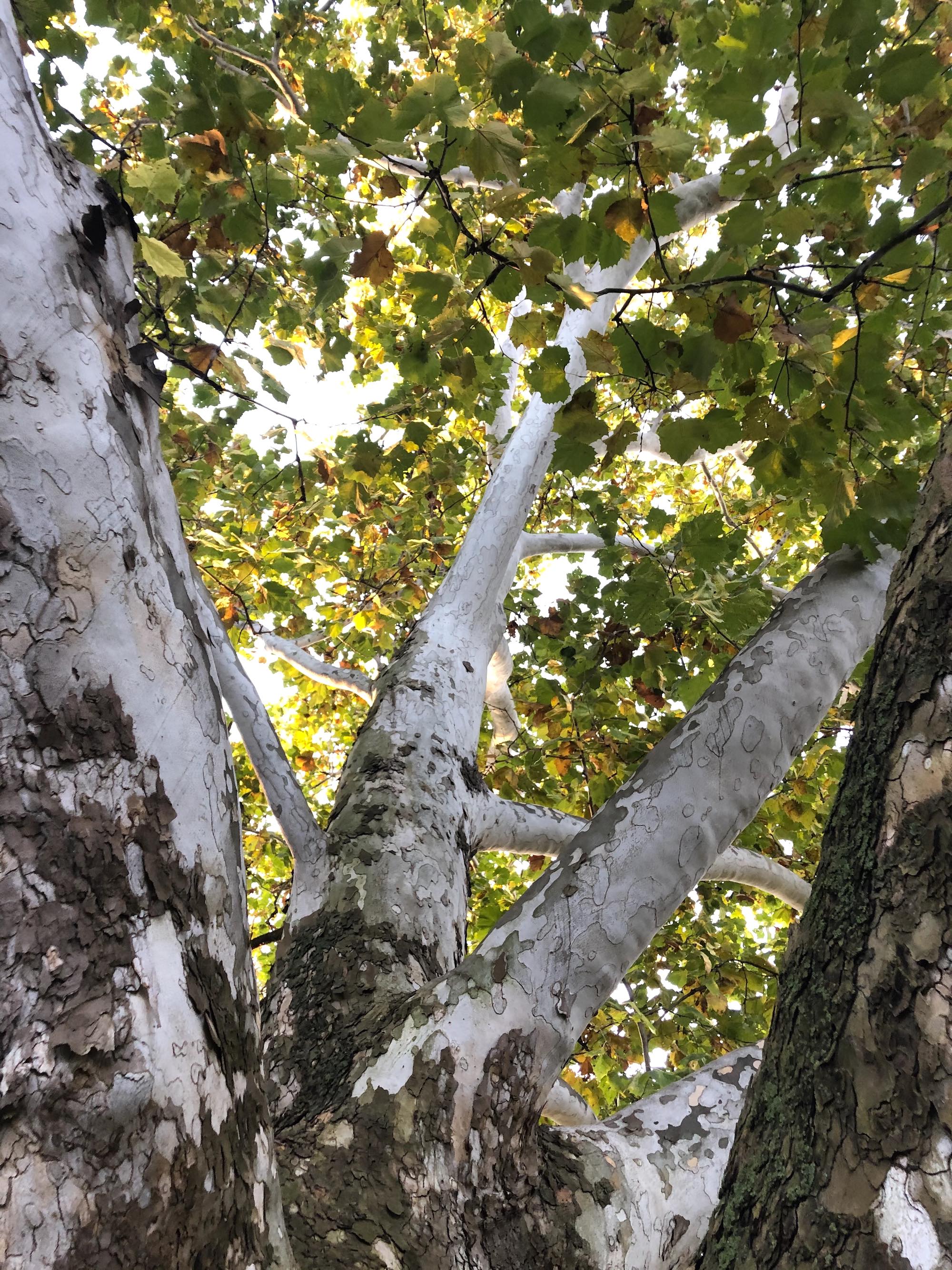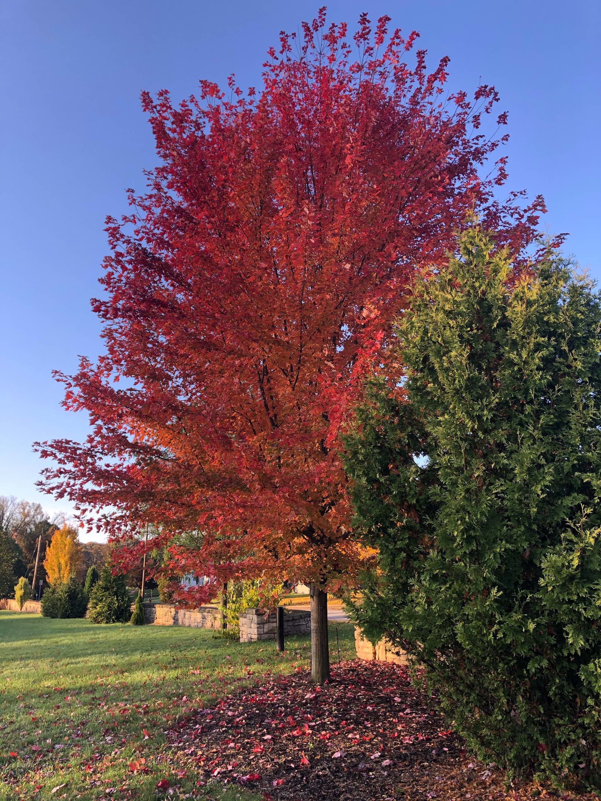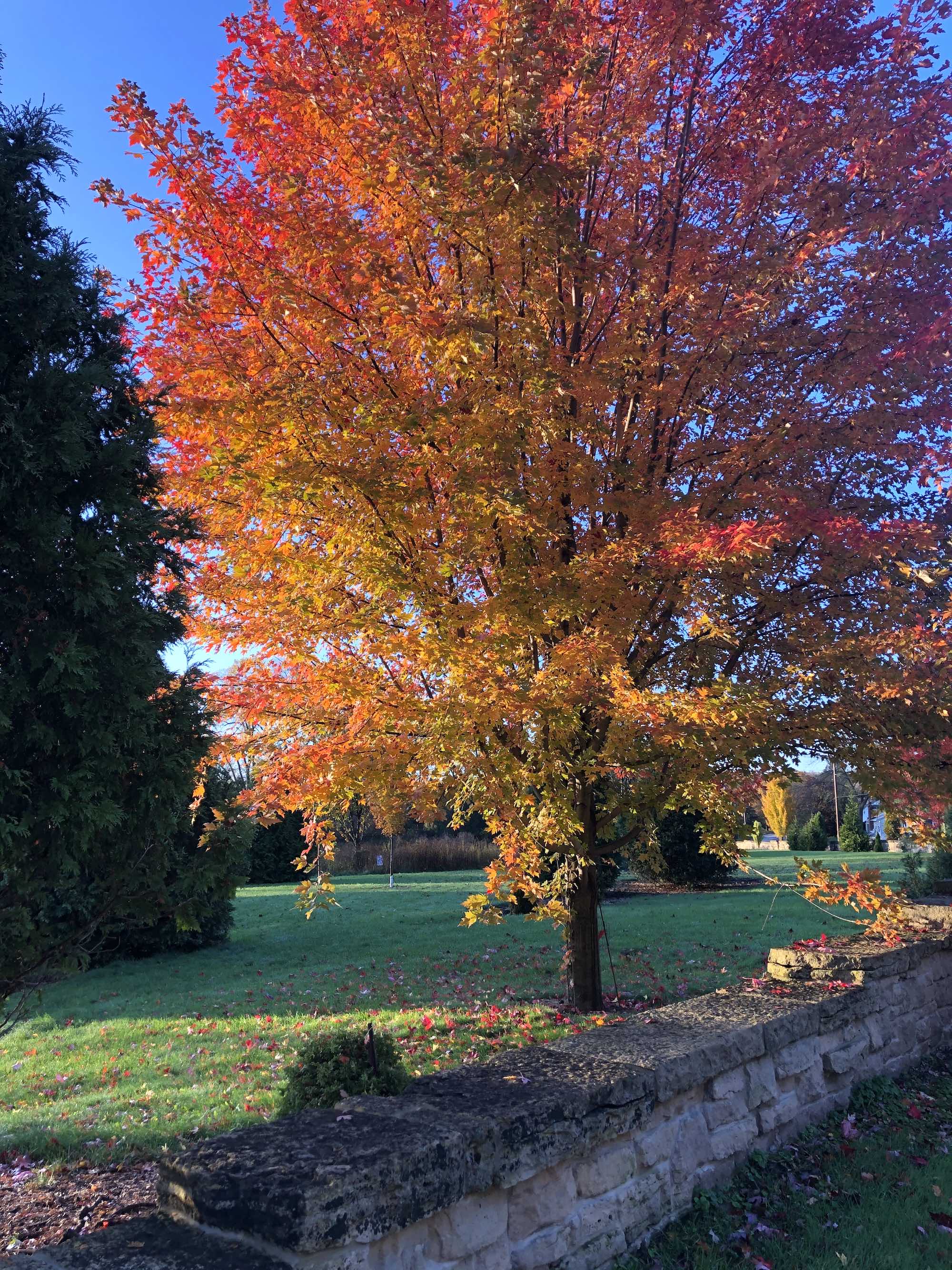 Above: Fall trees beside UW Arboretum stone wall along Nakoma Road and Manitou Way on October 24, 2019 (38°).