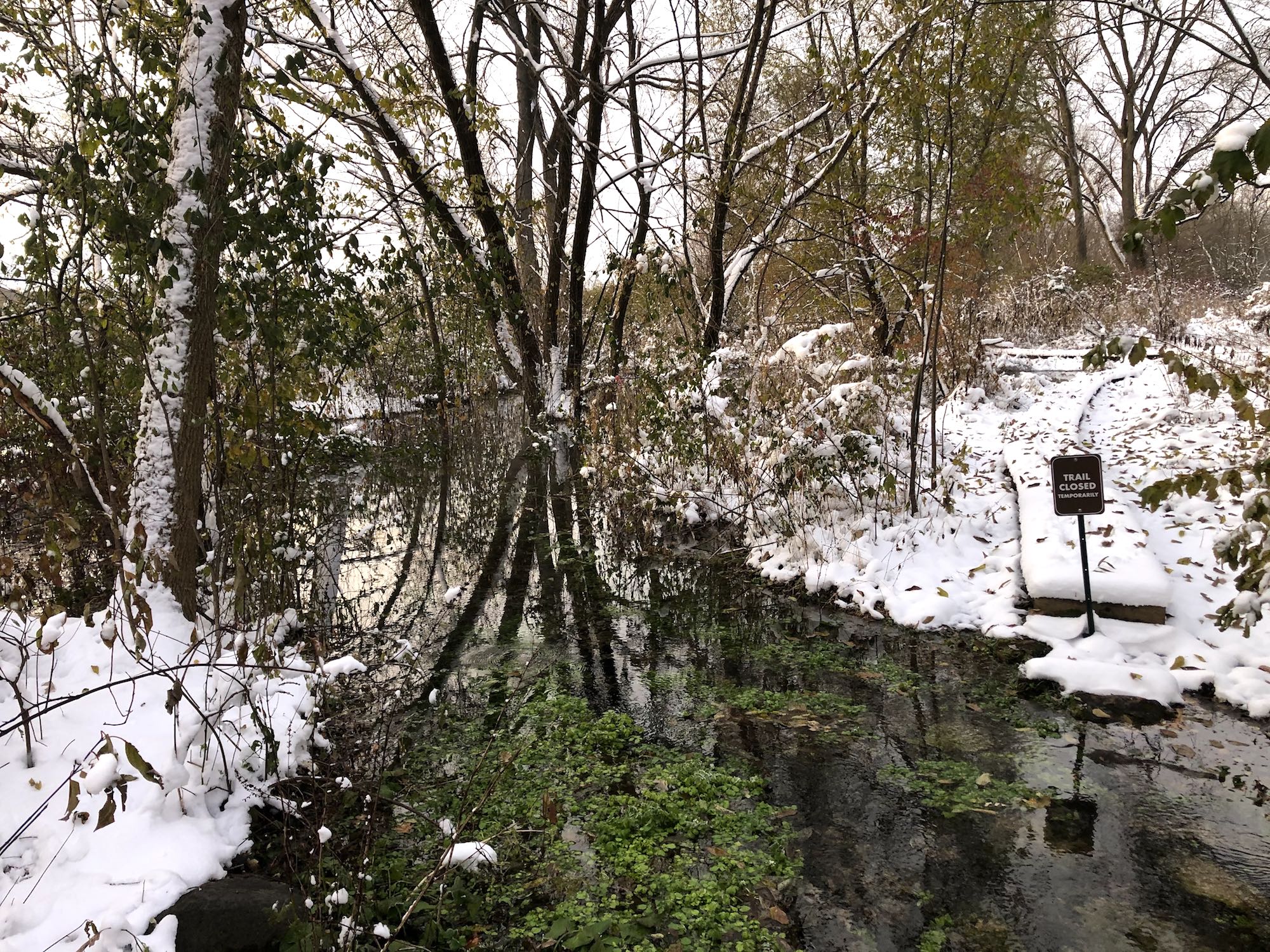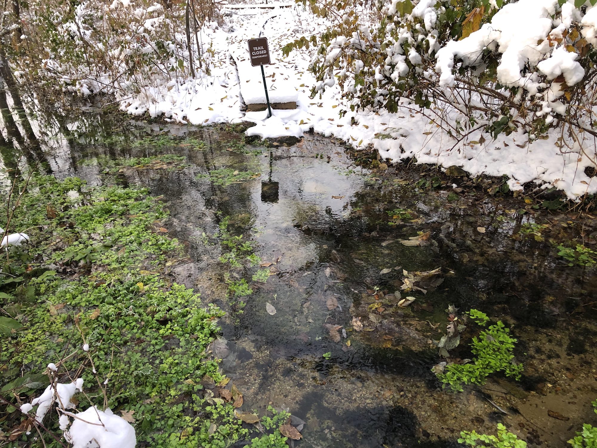 Above: Council Ring Spring on November 1, 2019. (23°). Stepping stones submerged. Water high and spreading beyond traditional channel. Outlet must be dammed up.