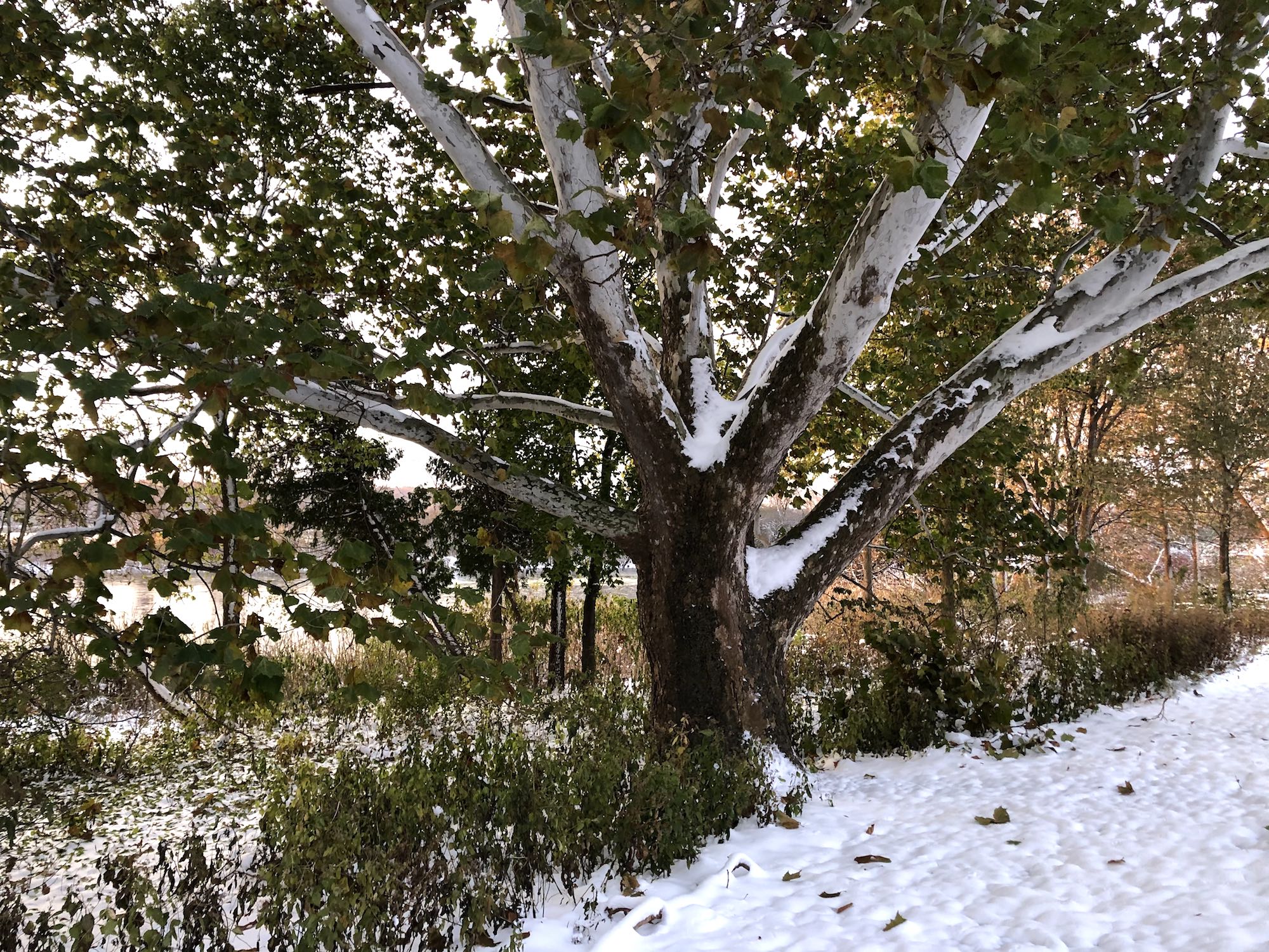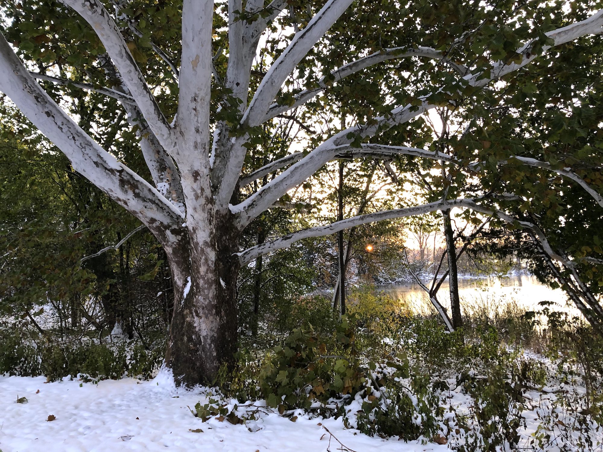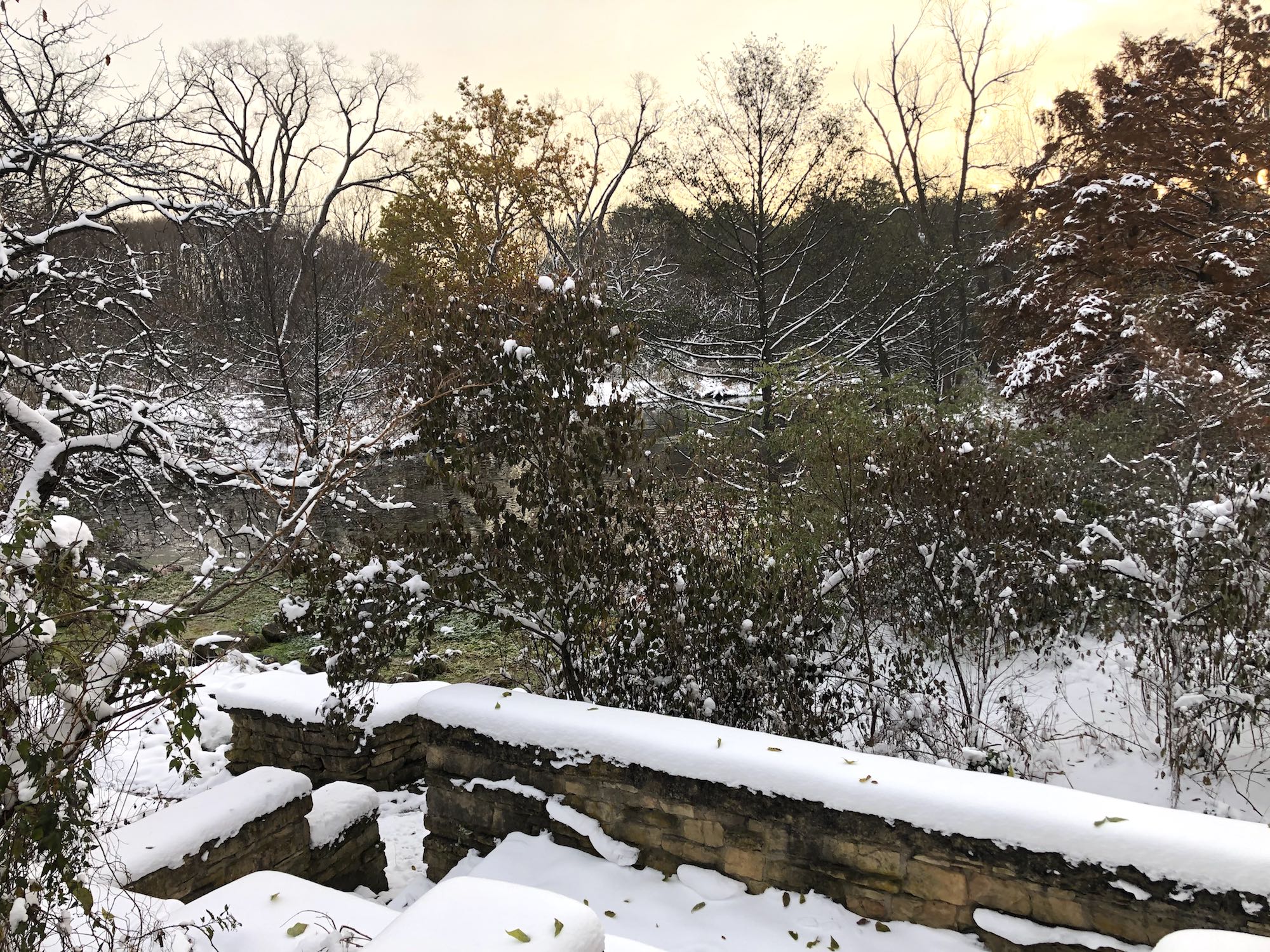 Note: Autumn got caught with its pants still up as an early winter hits Madison. With subfreezing cold, Mallards are returning to the Duck Pond. Many leaves still turning and clinging to trees. Falling green leaves speckle the snow. No coots.