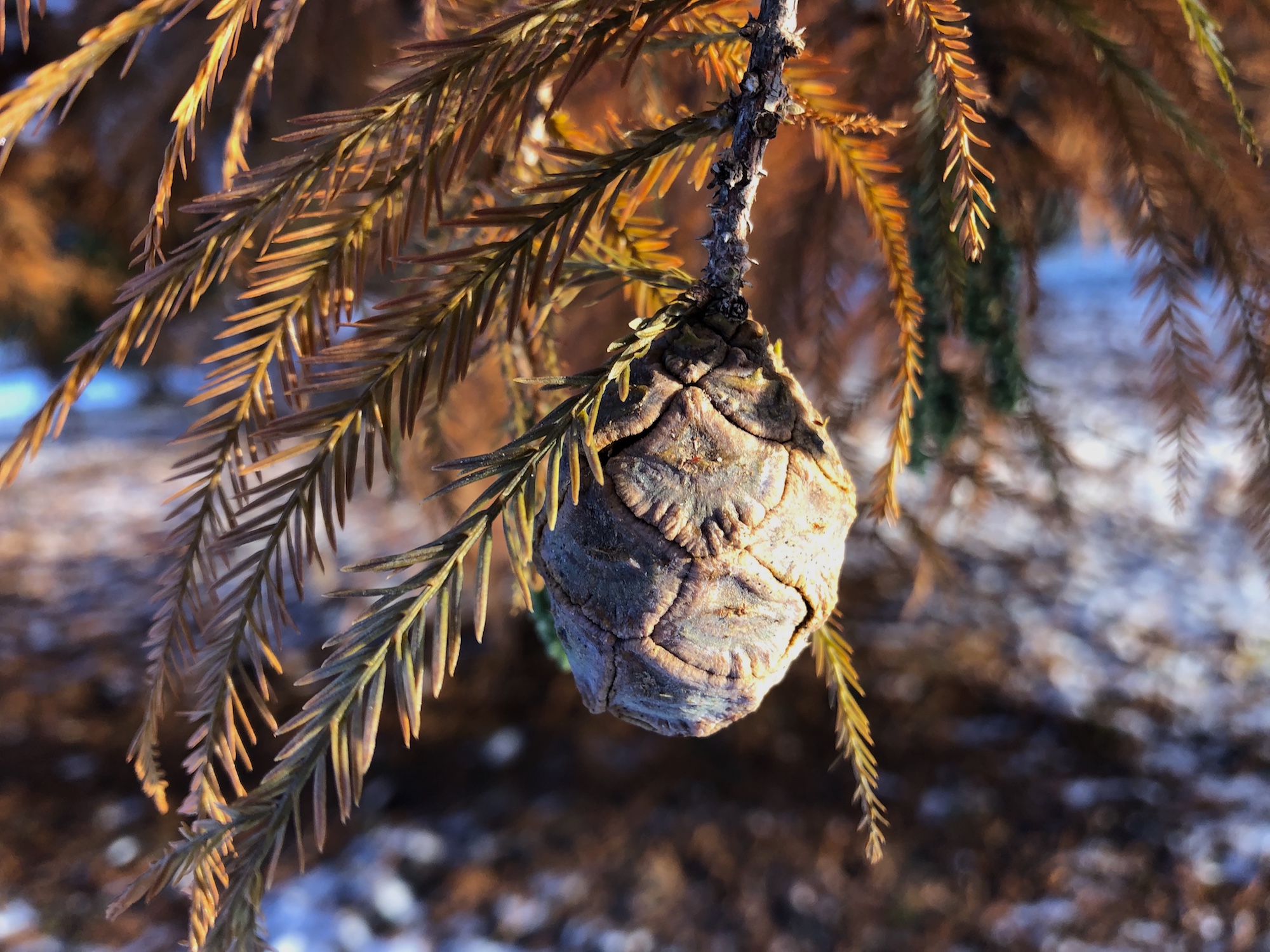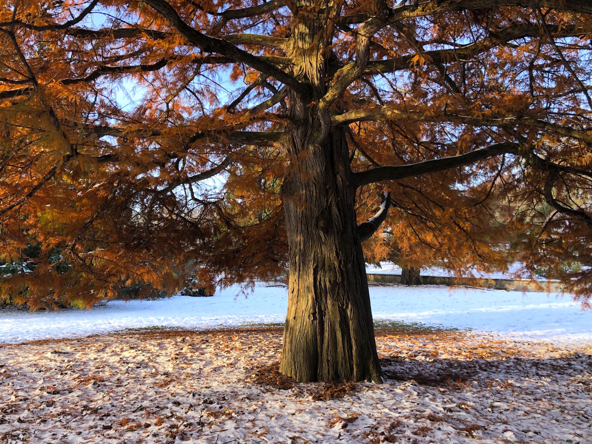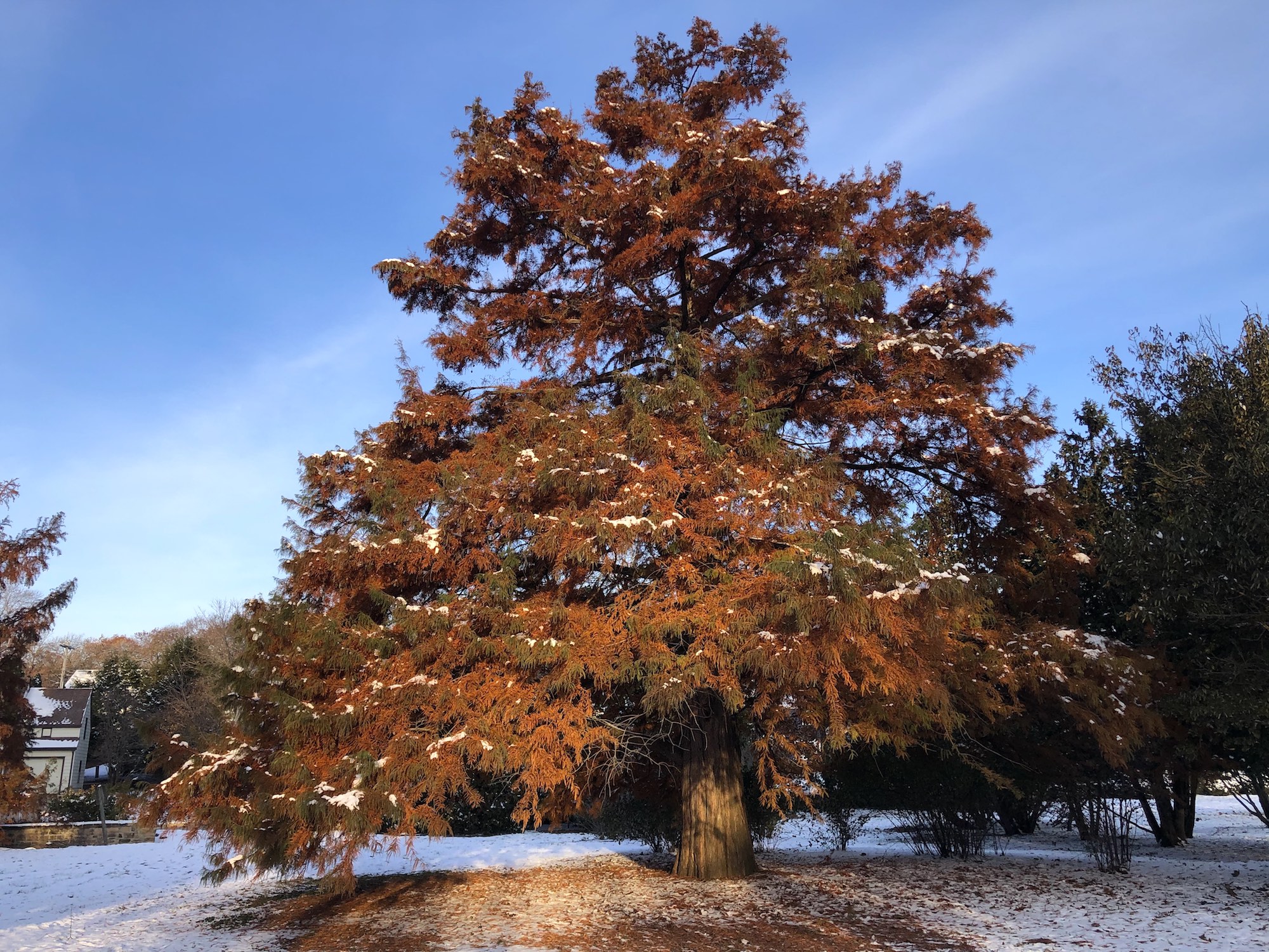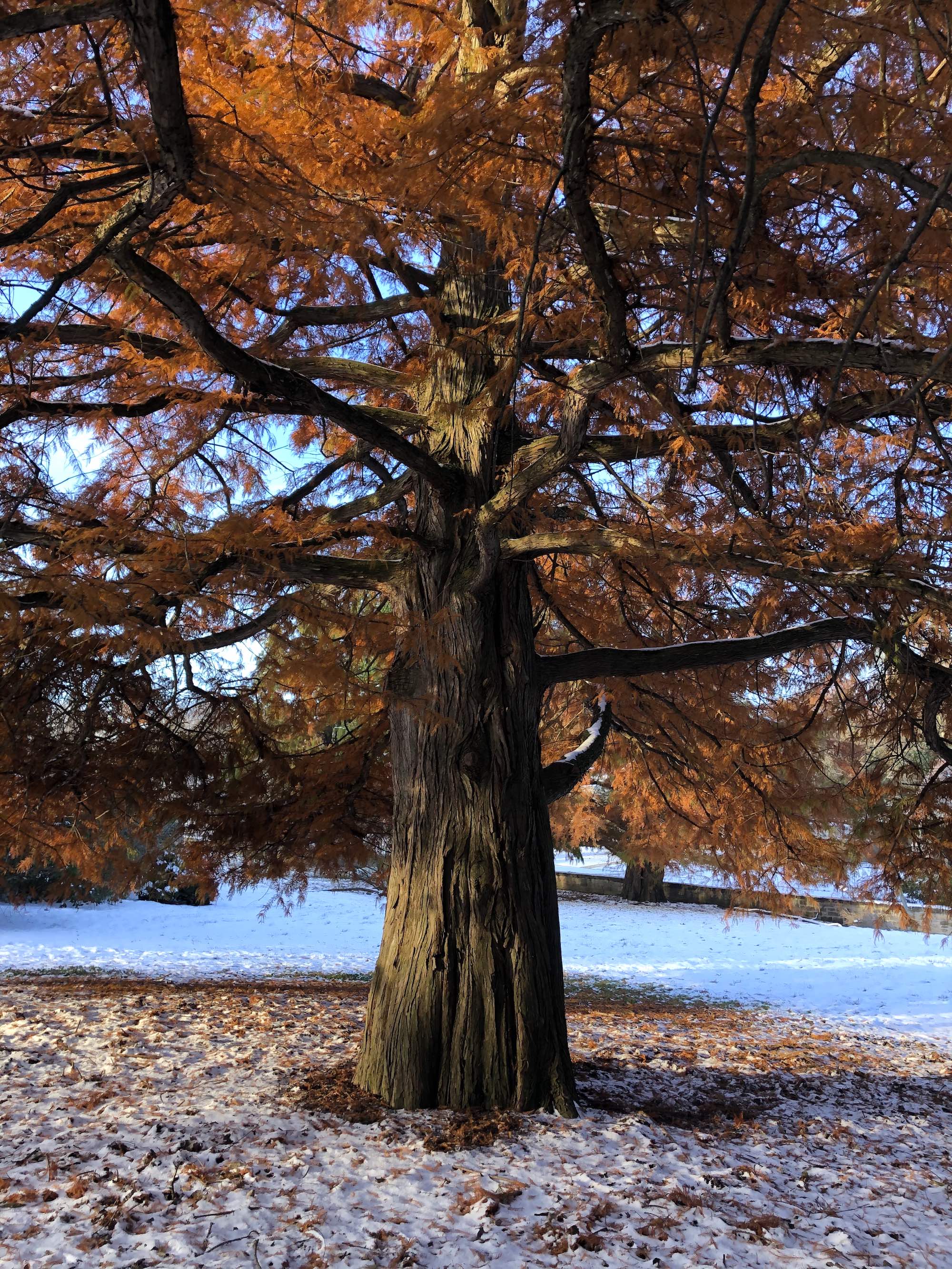 Above: Bald Cypress in the UW Arboretum's Viburnum Garden (East of the Nakoma Road and Manitou Way intersection. Between the retaining pond and the Nakoma Golf Course.) on November 8, 2019 (13°).