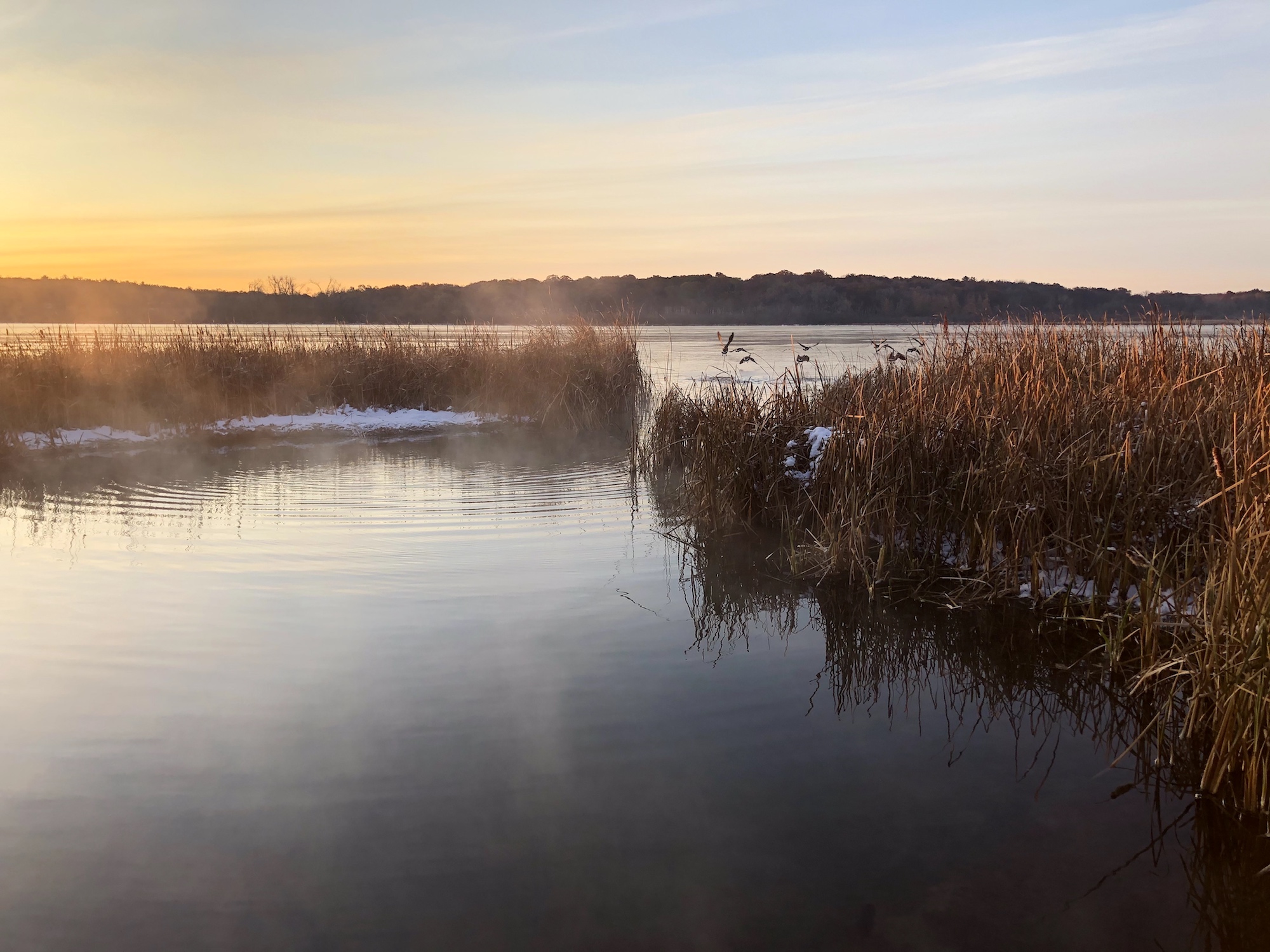Above: Lake Wingra Cattails. (13°). Geese taking flight just outside the cattails opening.