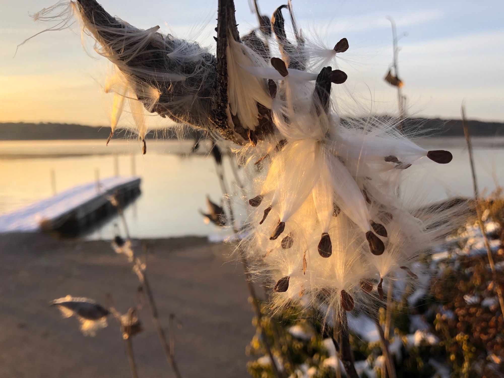 Below: Bursting milkweed seed pods by Wingra Boats at sunrise.