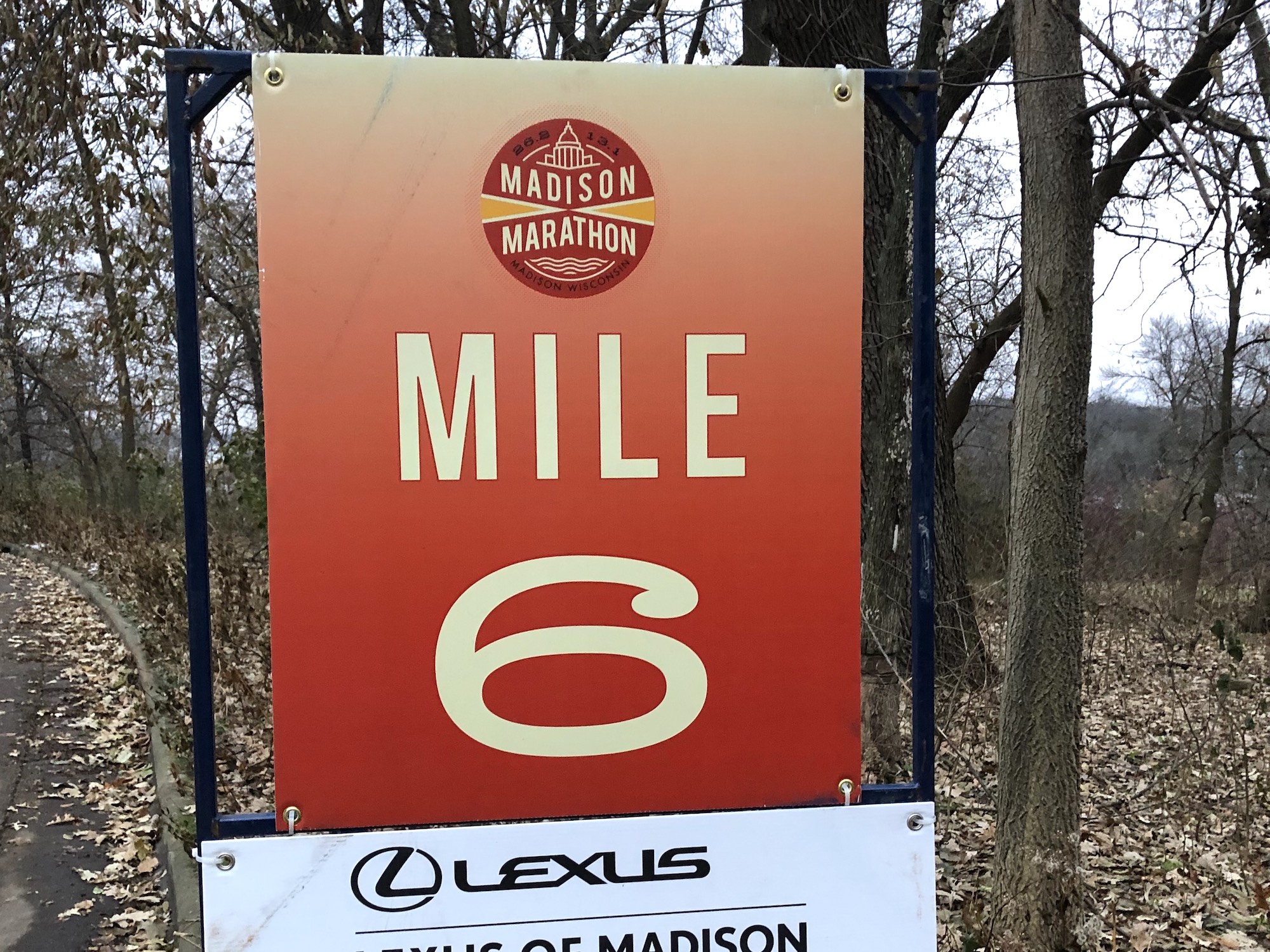 Above: Madison Marathon 6 Mile Marker on Arbor Drive at entrance to Oak Savanna Bike Path on November 10, 2019. (34°).