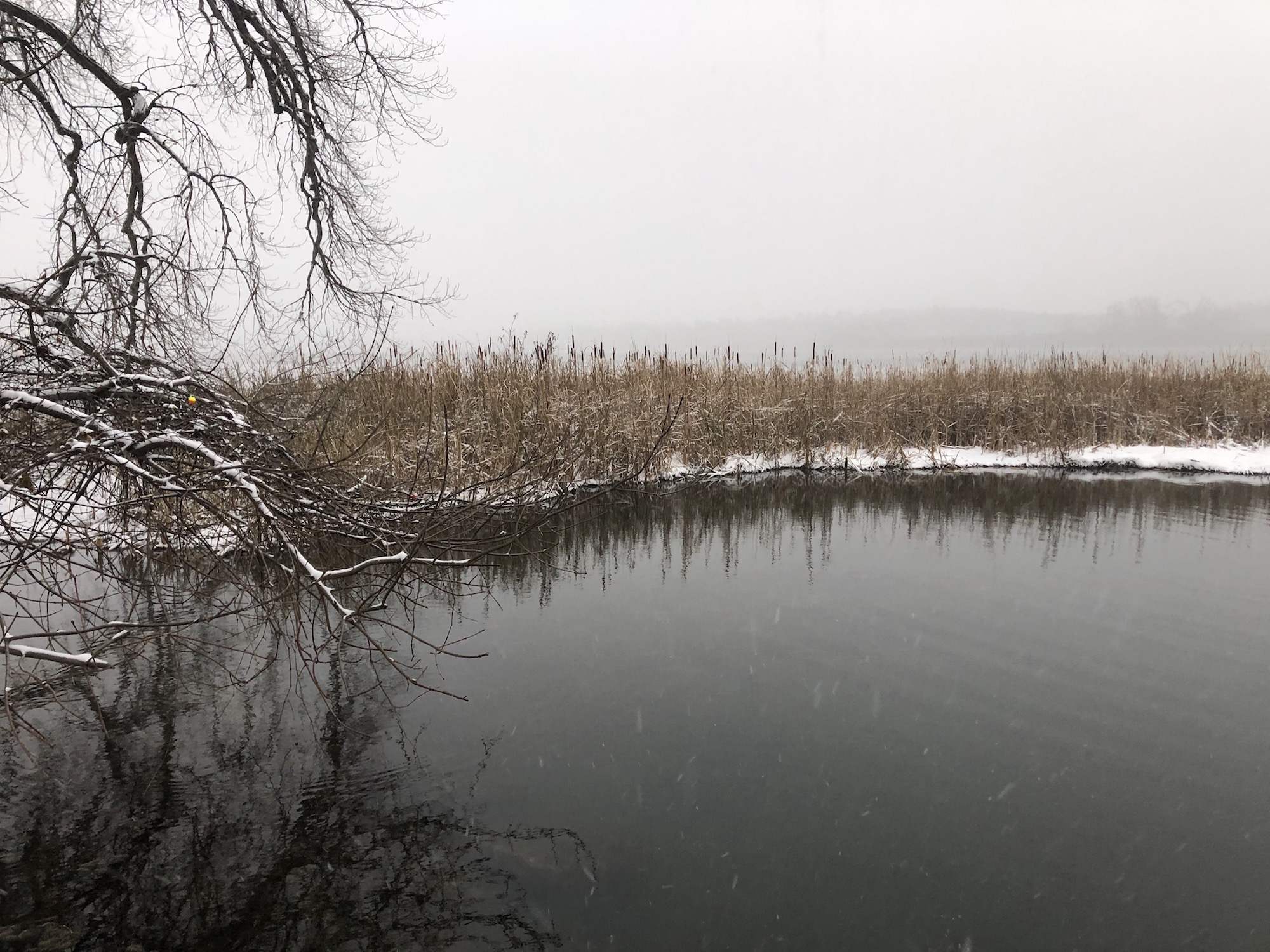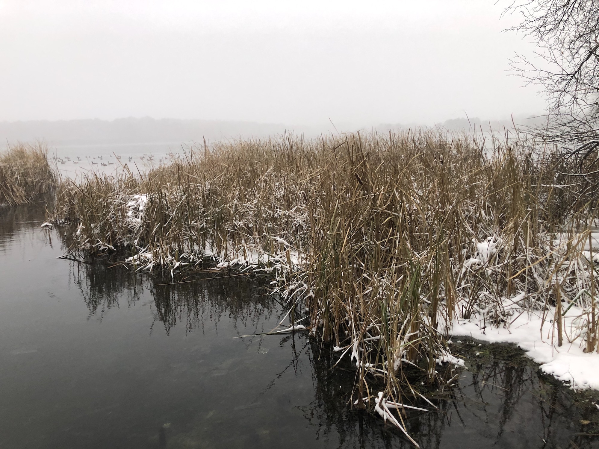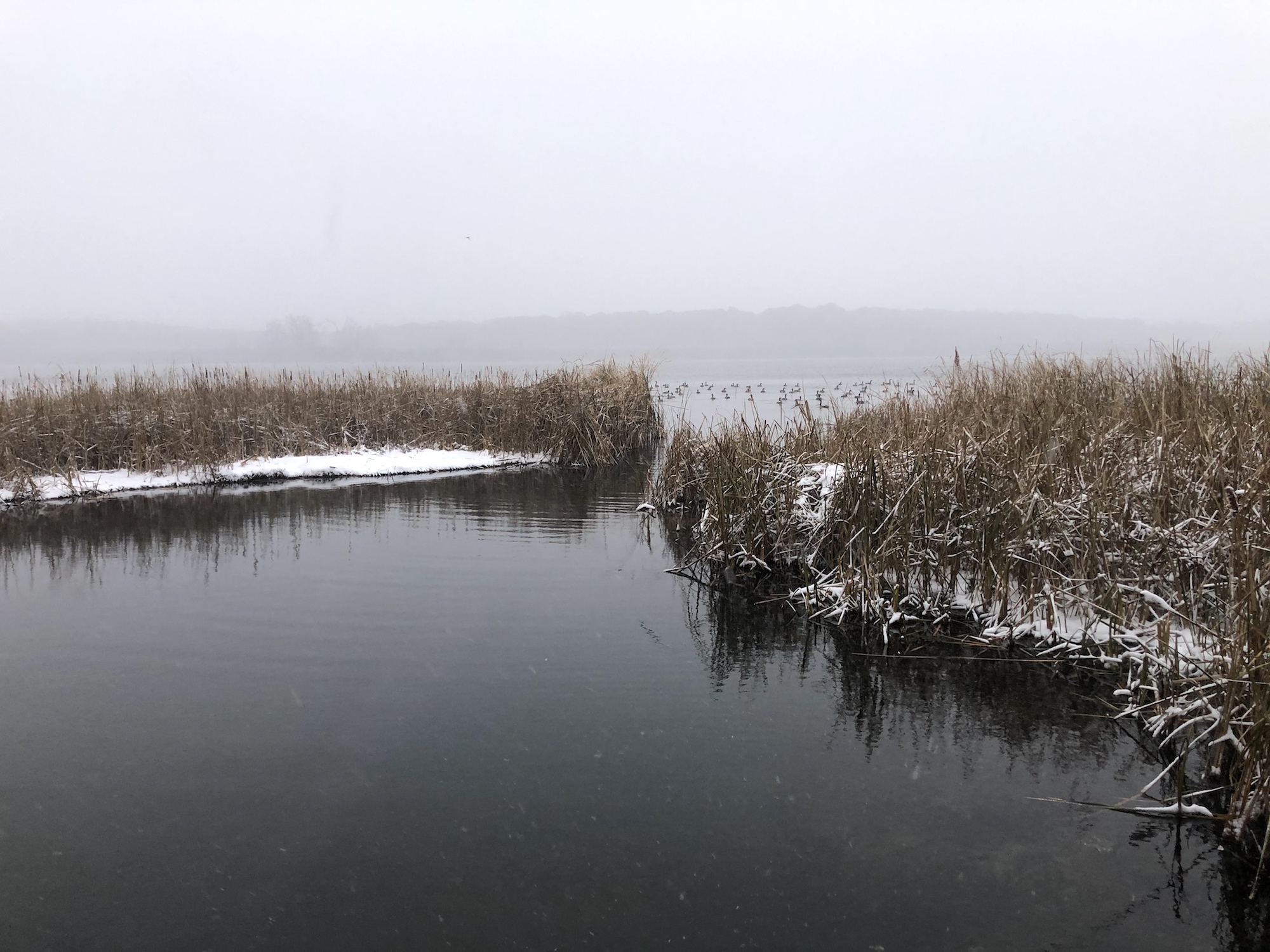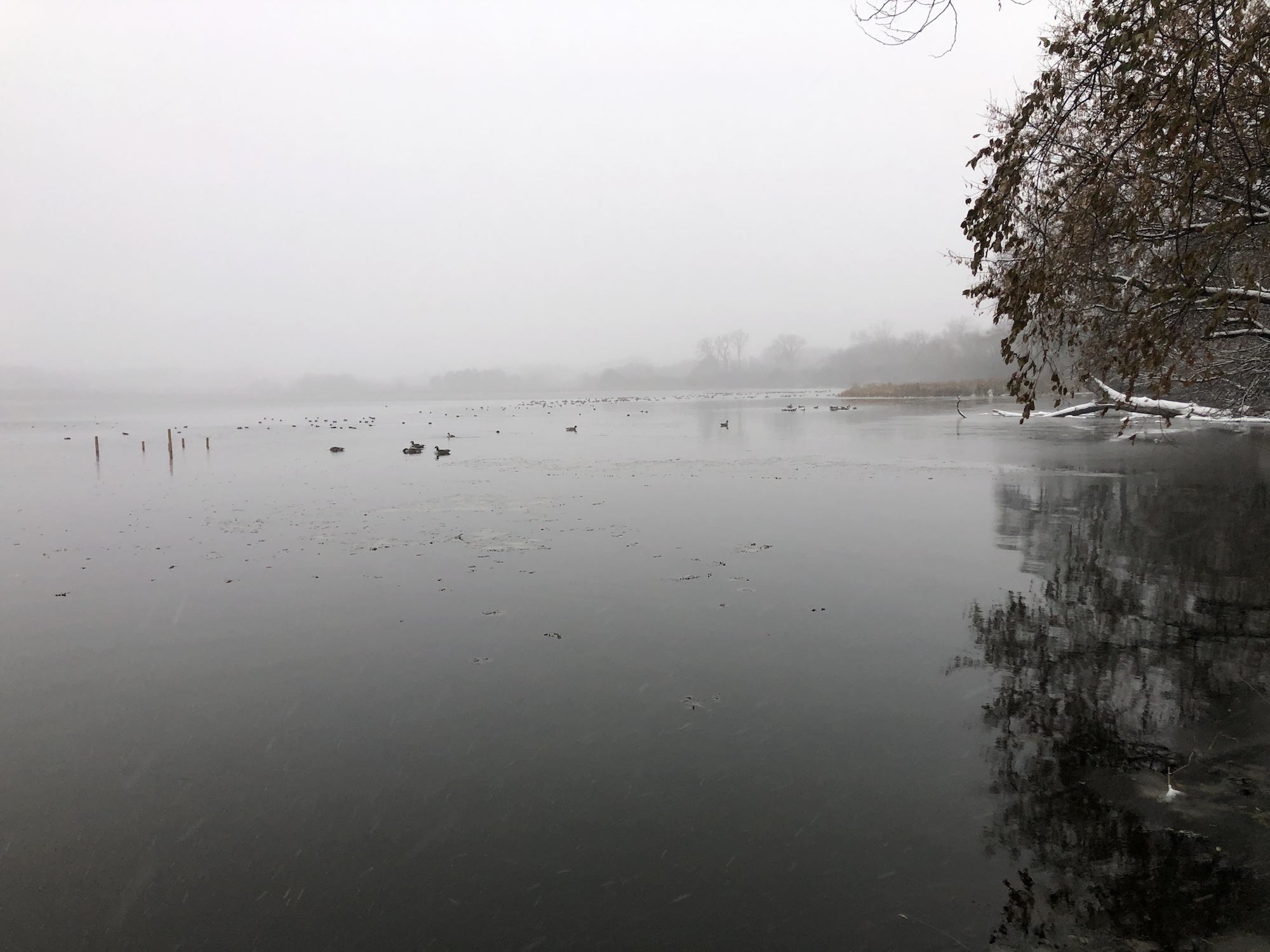 Note: Snowing. Canada Geese, Coots, Mallards and Gulls skirting the edges of the cattails and north shoreline of Lake Wingra.