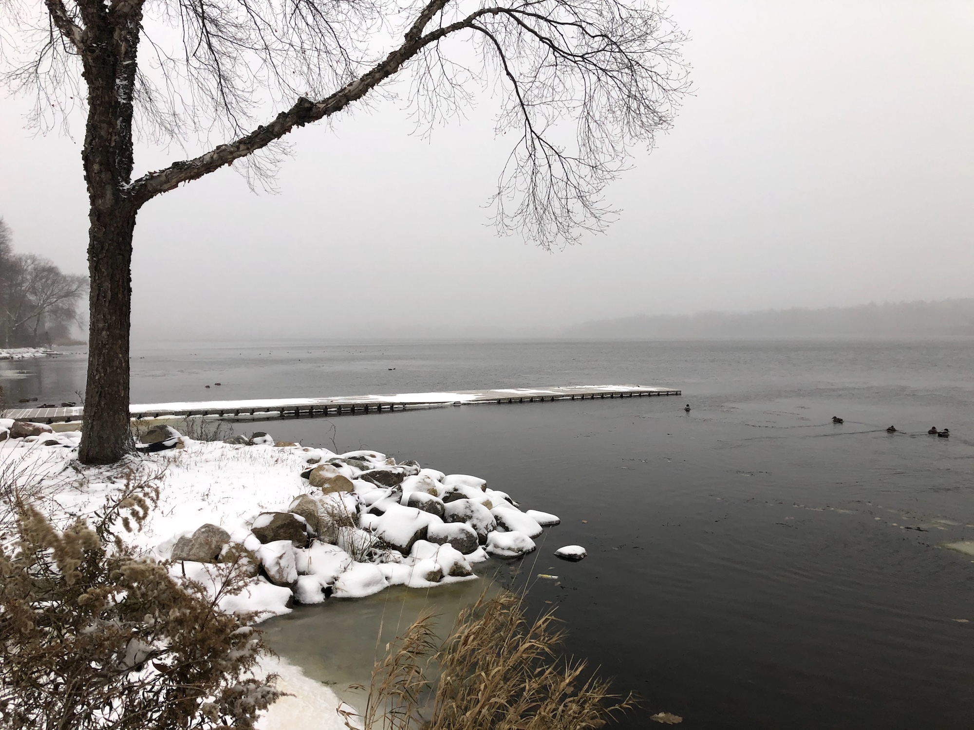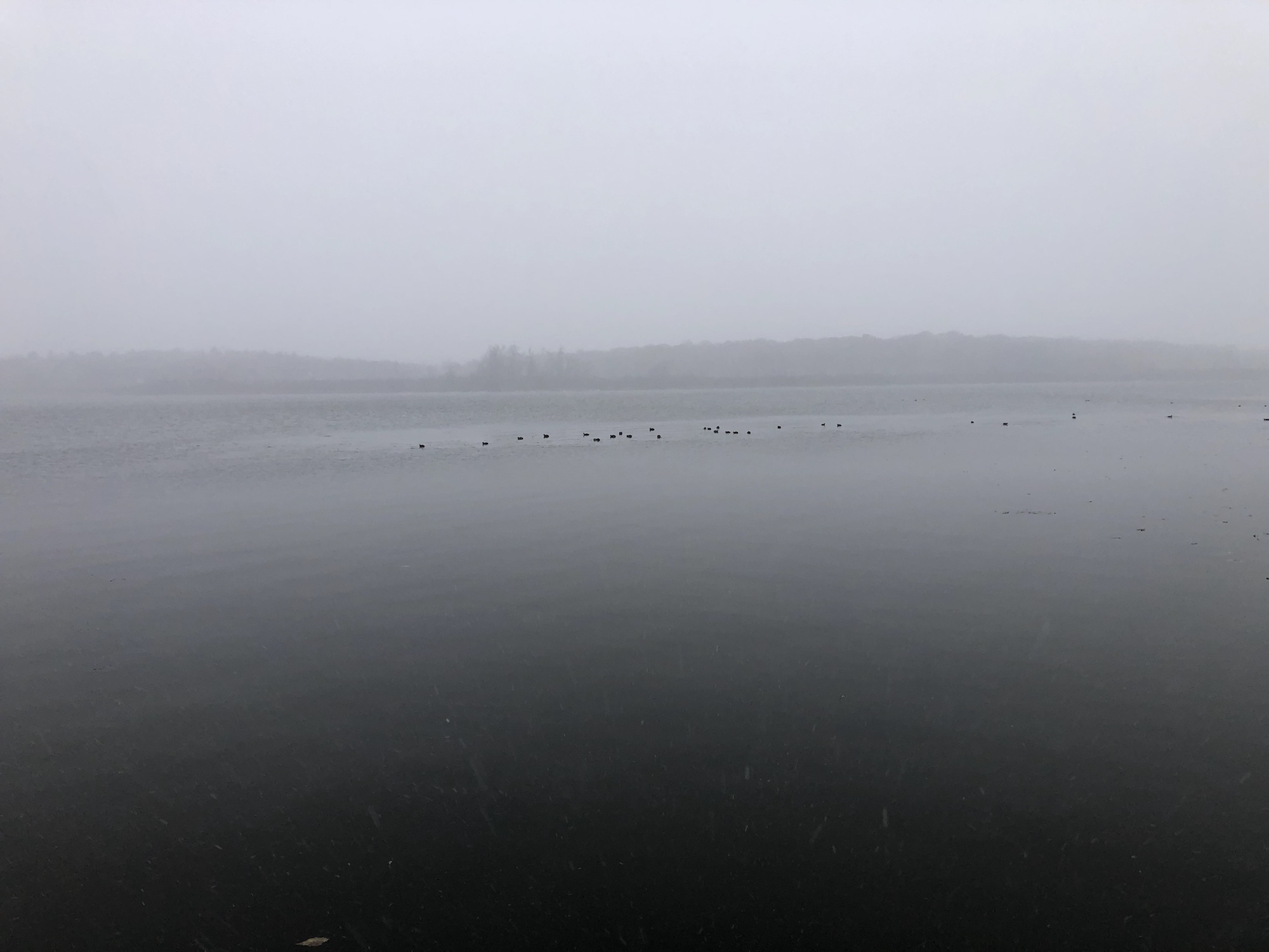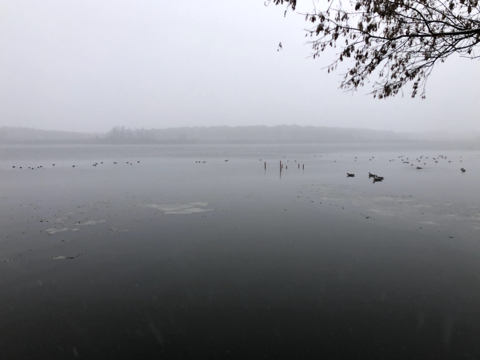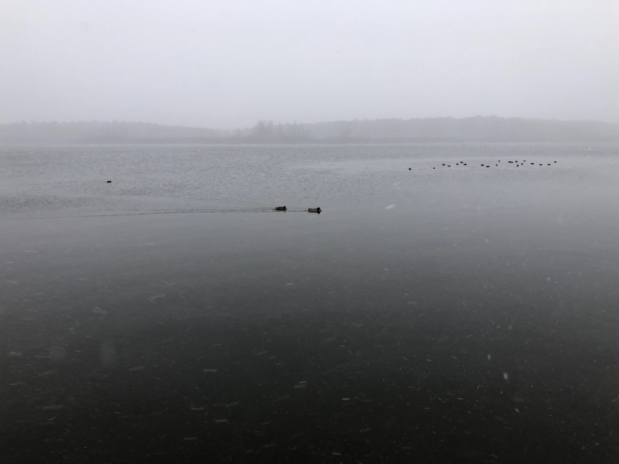 Note: Snowing. Canada Geese, Coots, Mallards and Gulls skirting the edges of the cattails and north shoreline of Lake Wingra.