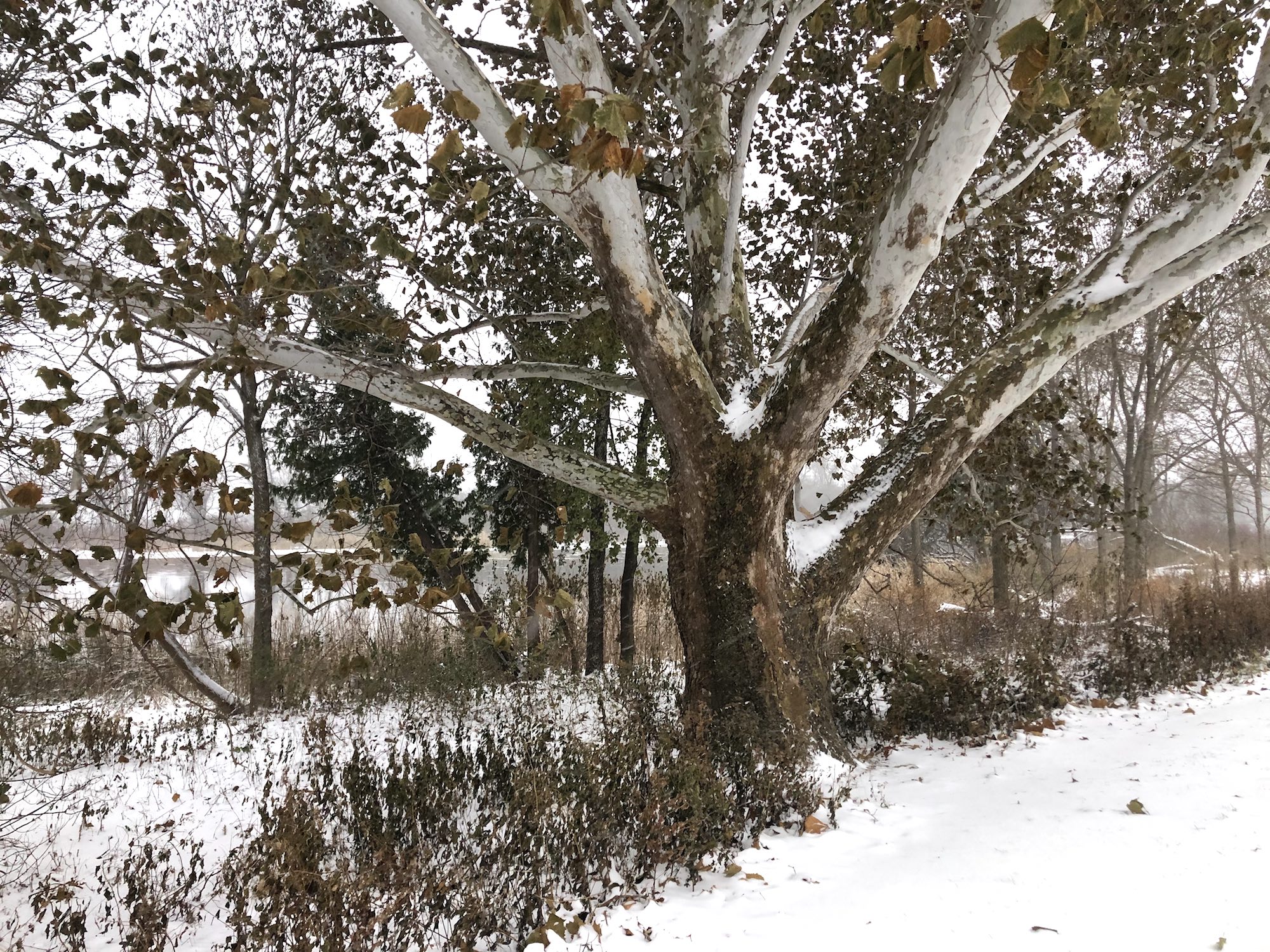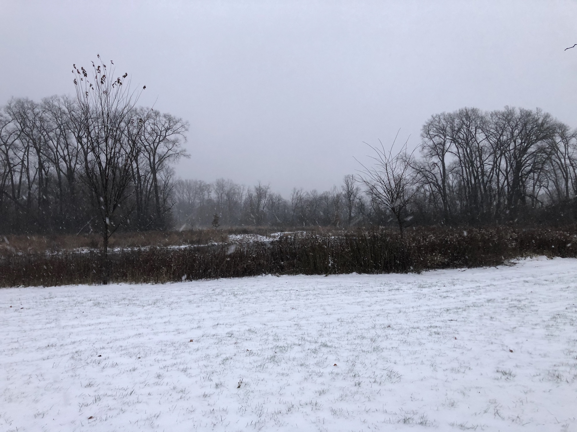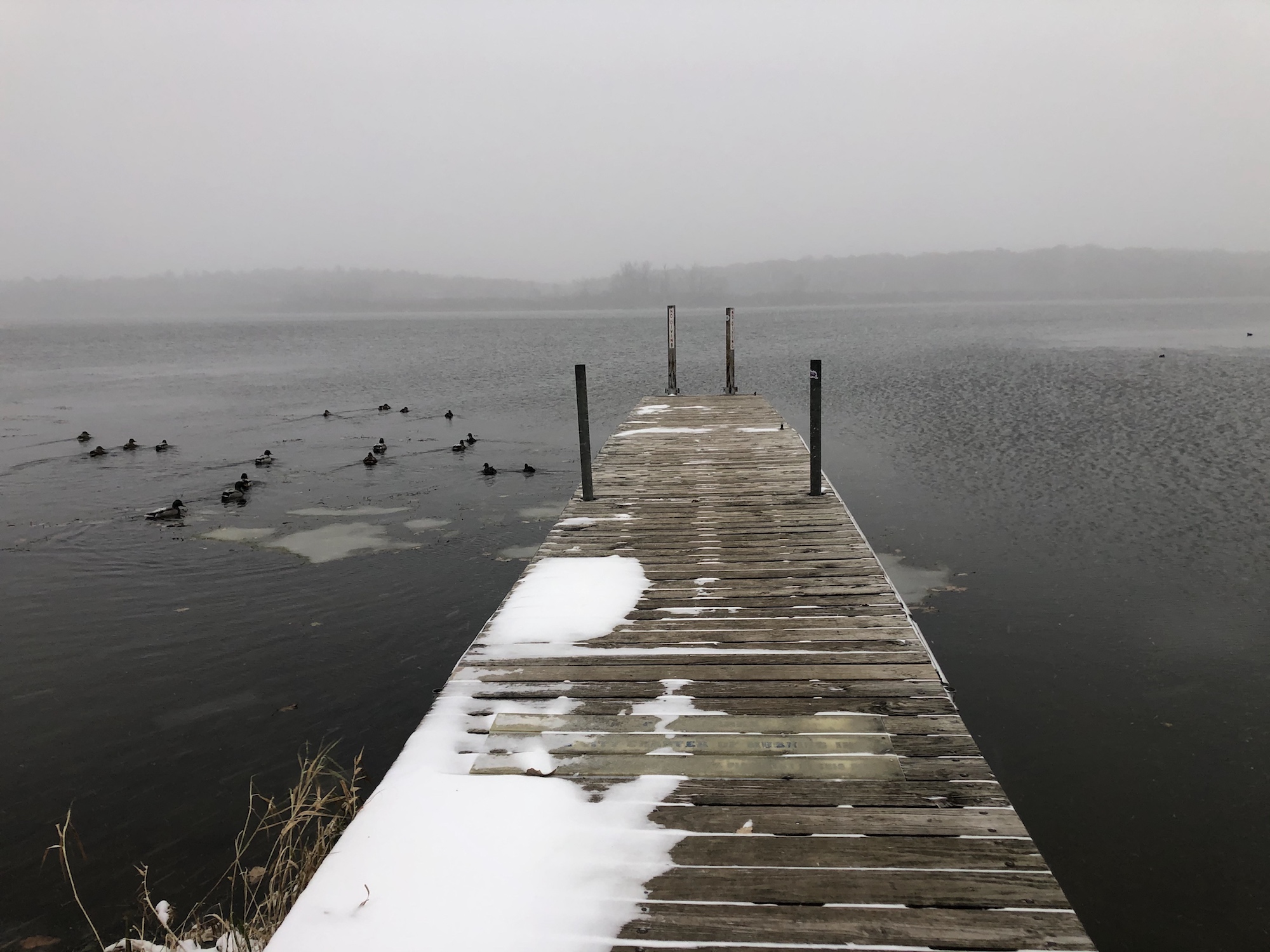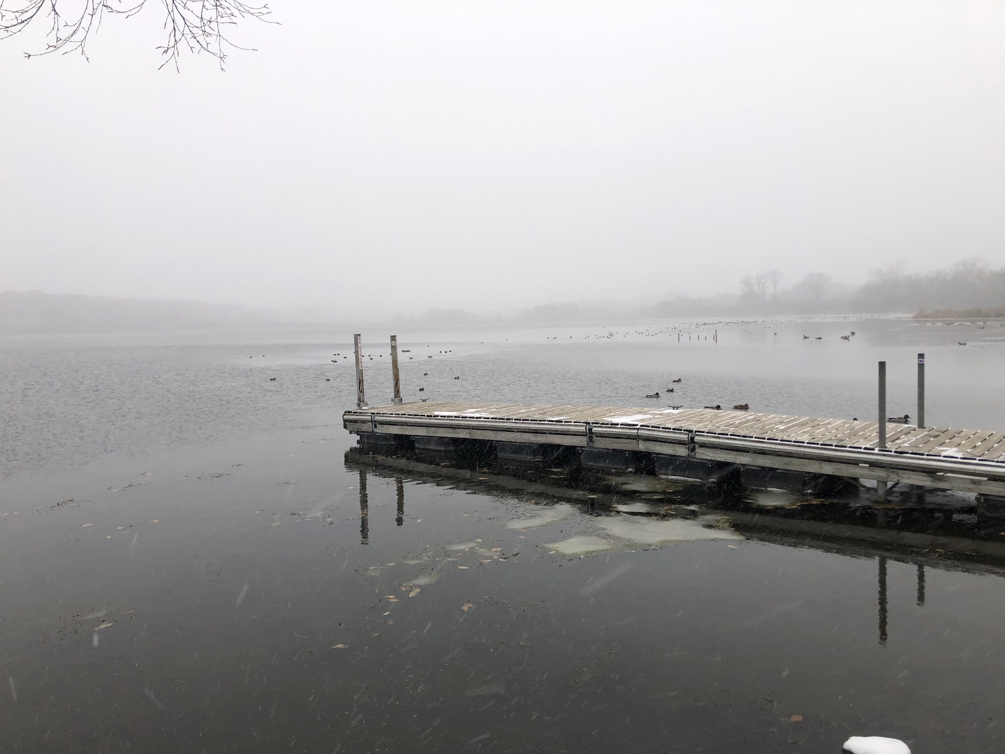Note: Snowing. Canada Geese, Coots, Mallards and Gulls skirting the edges of the cattails and north shoreline of Lake Wingra.