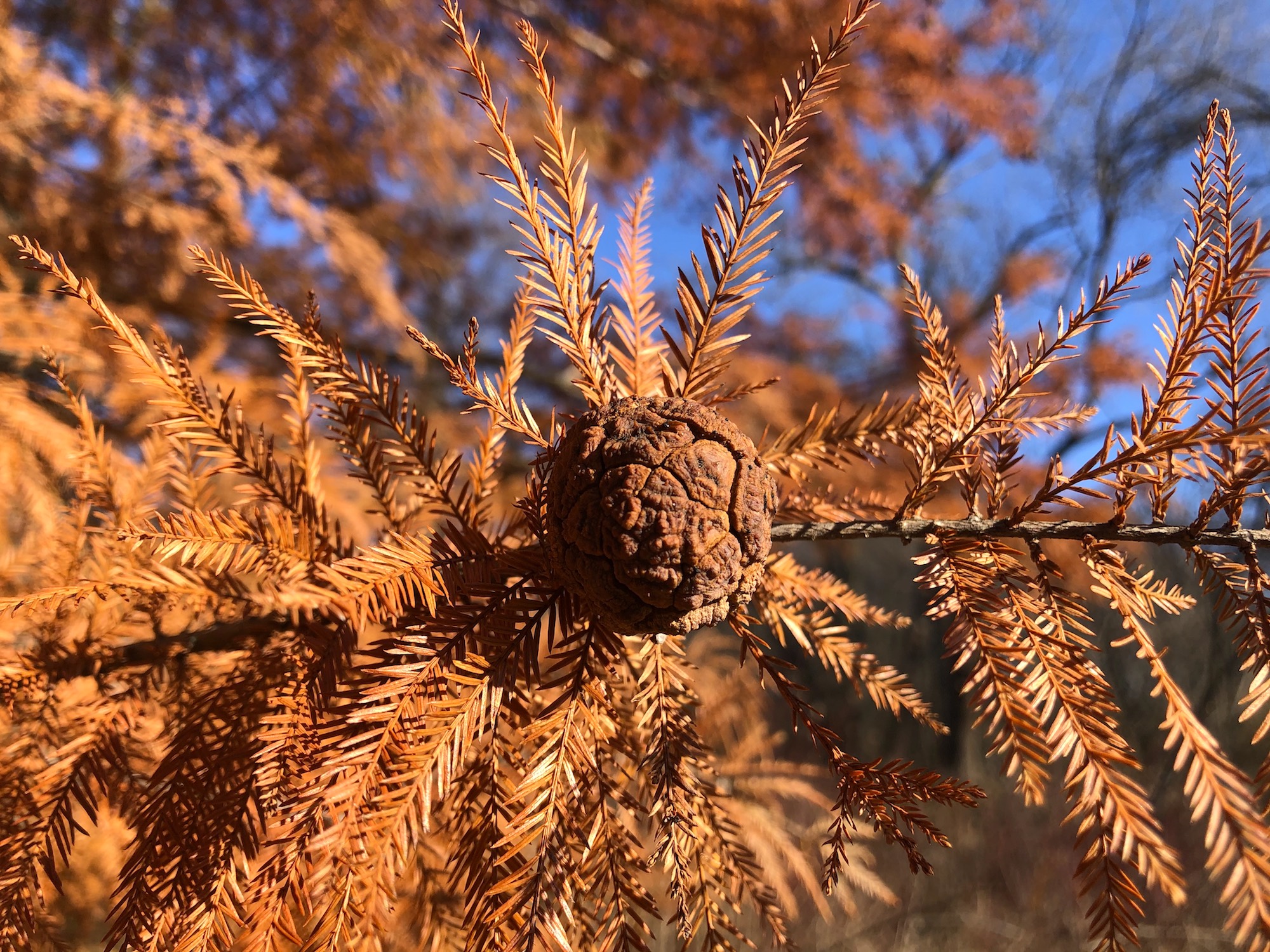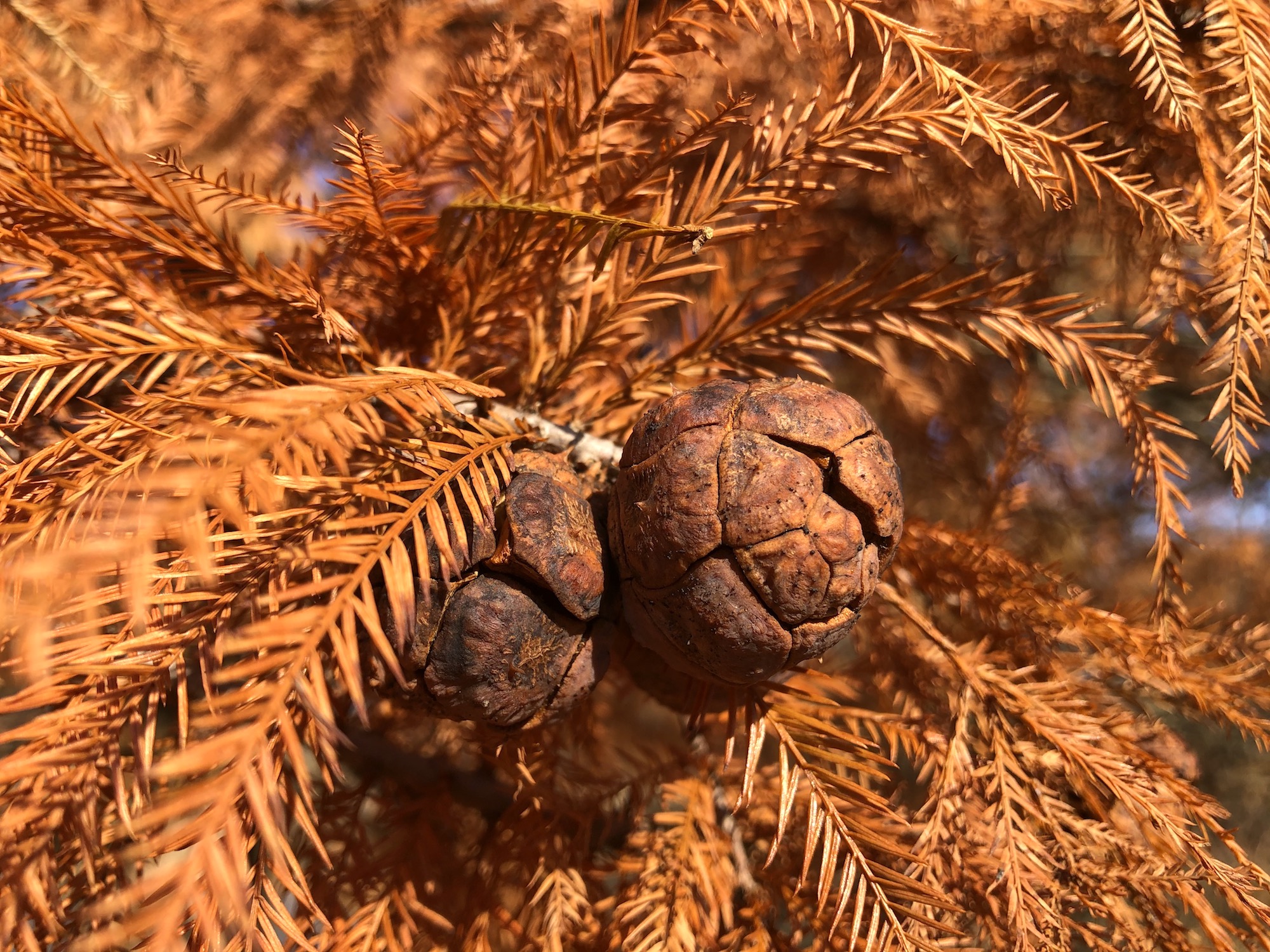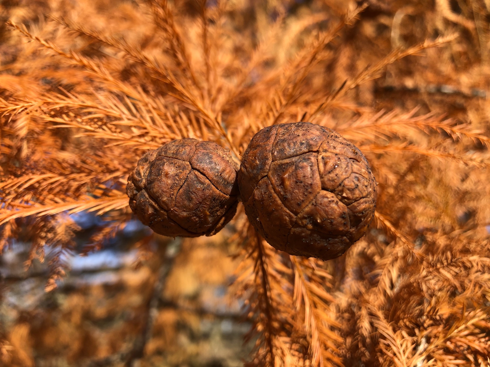 Above: Cones from Bald Cypress on shore of Duck Pond on November 22, 2019 (24°).