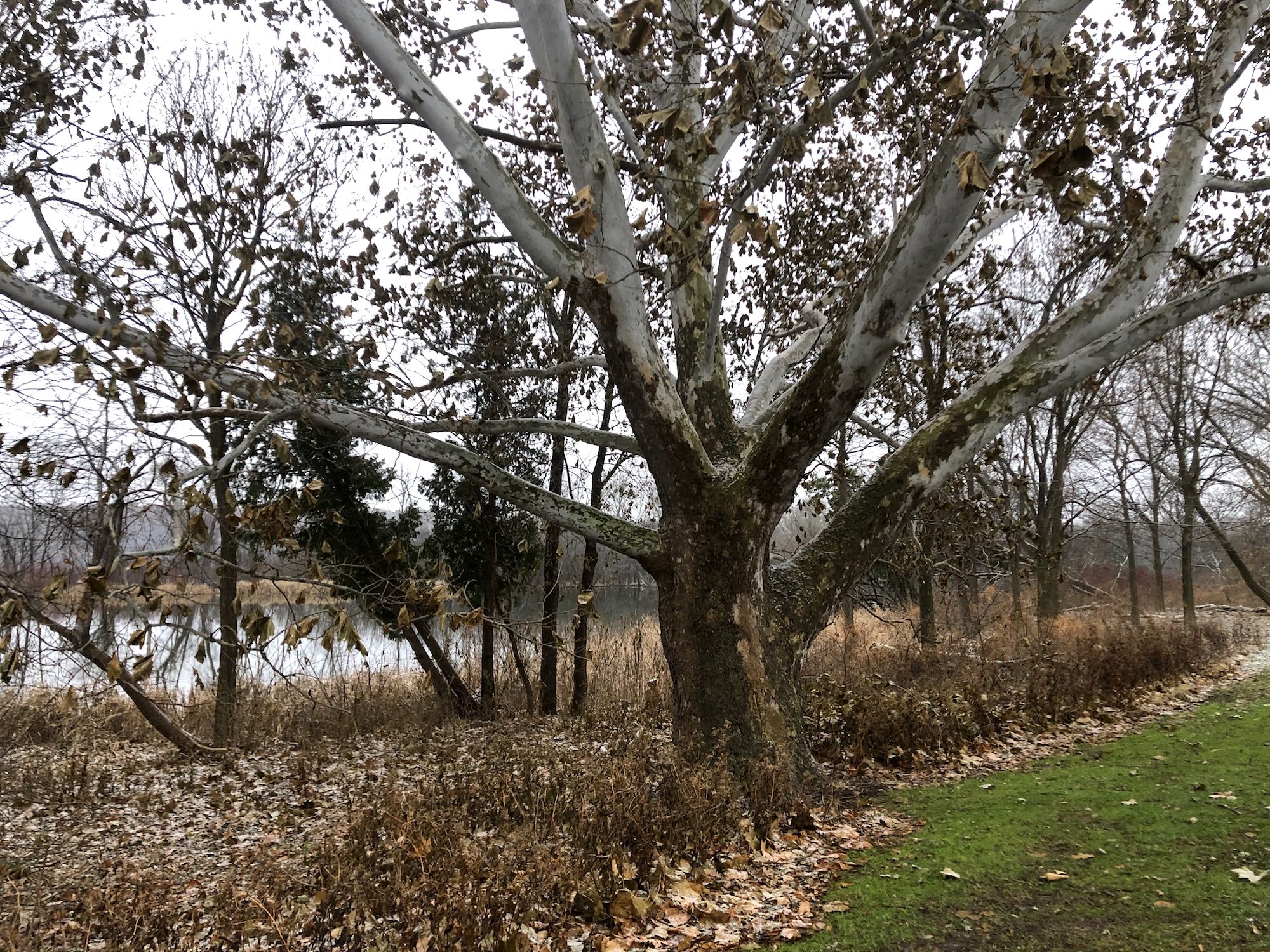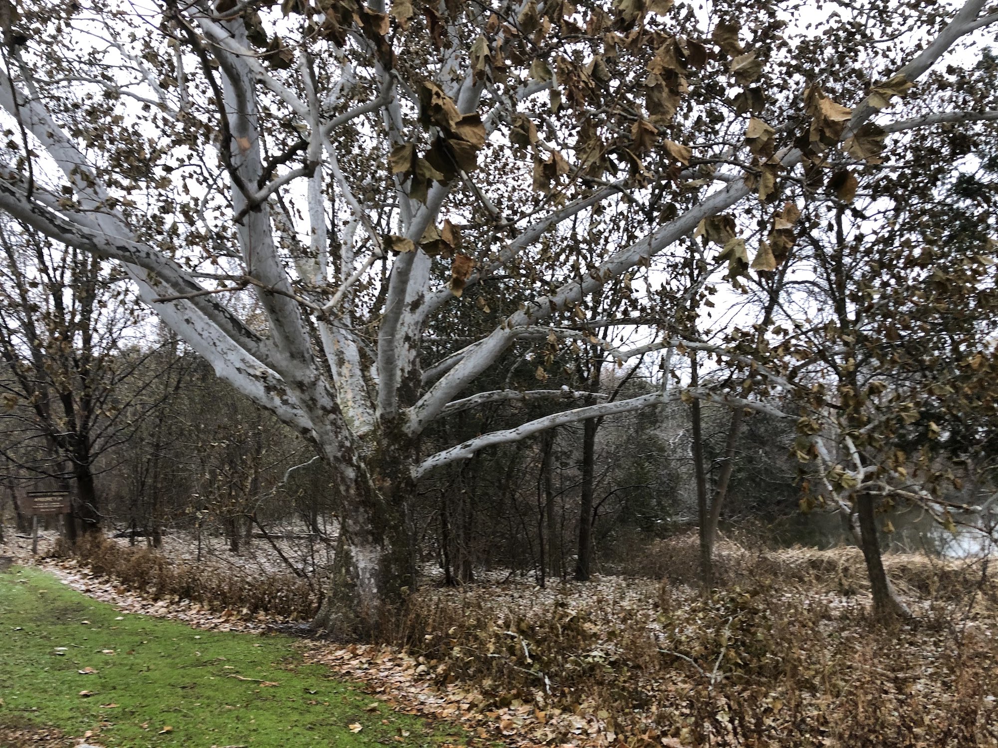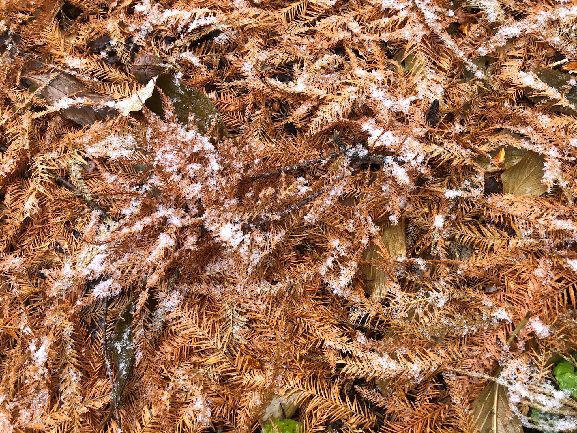 Above: Bald Cypress fronds carpeting the ground in the Viburnum Garden on November 29, 2019 (30°).