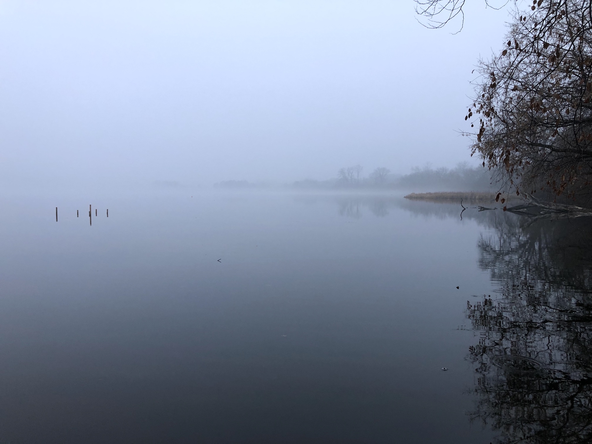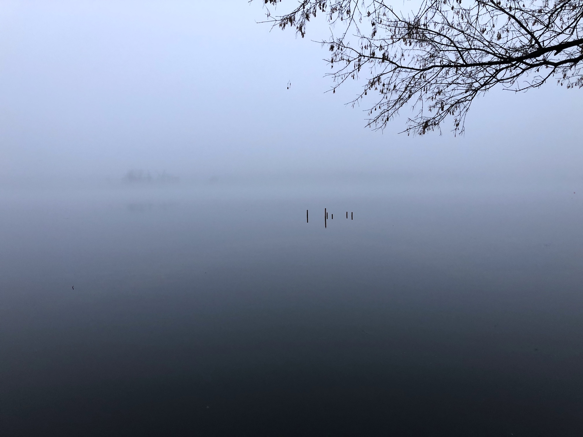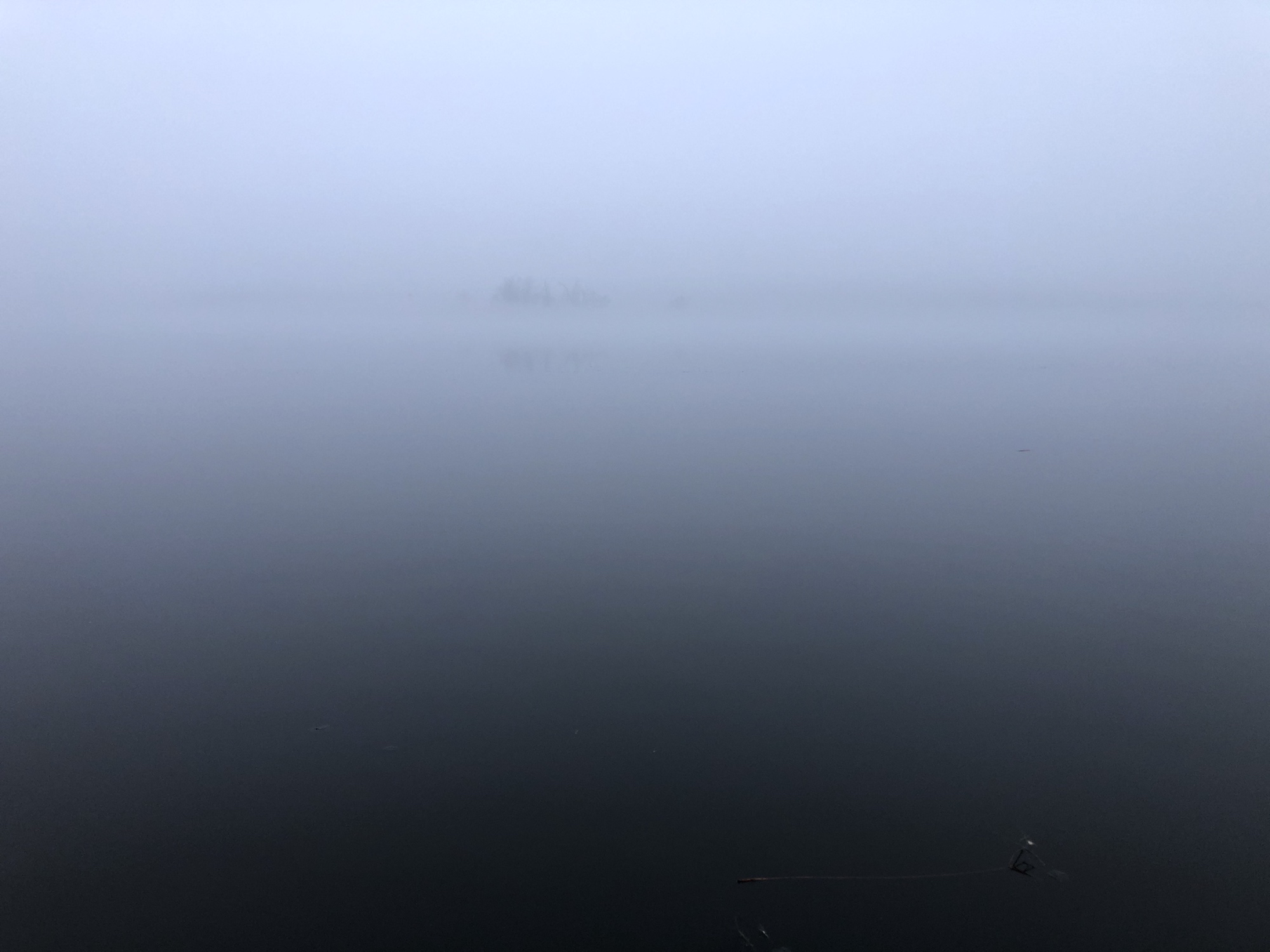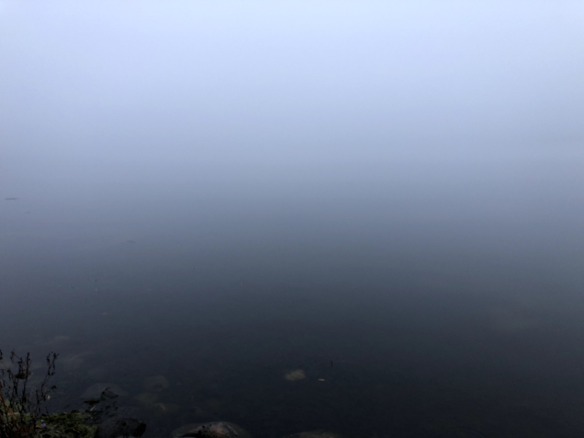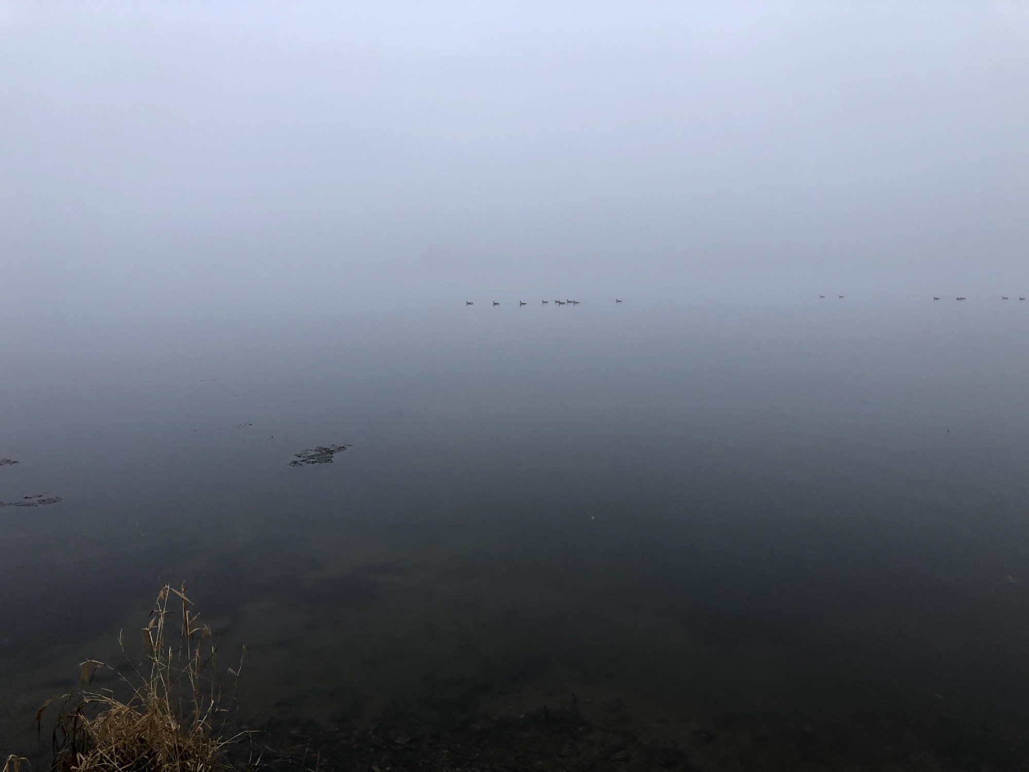 Note: Fog. Canada Geese swimming near shore.