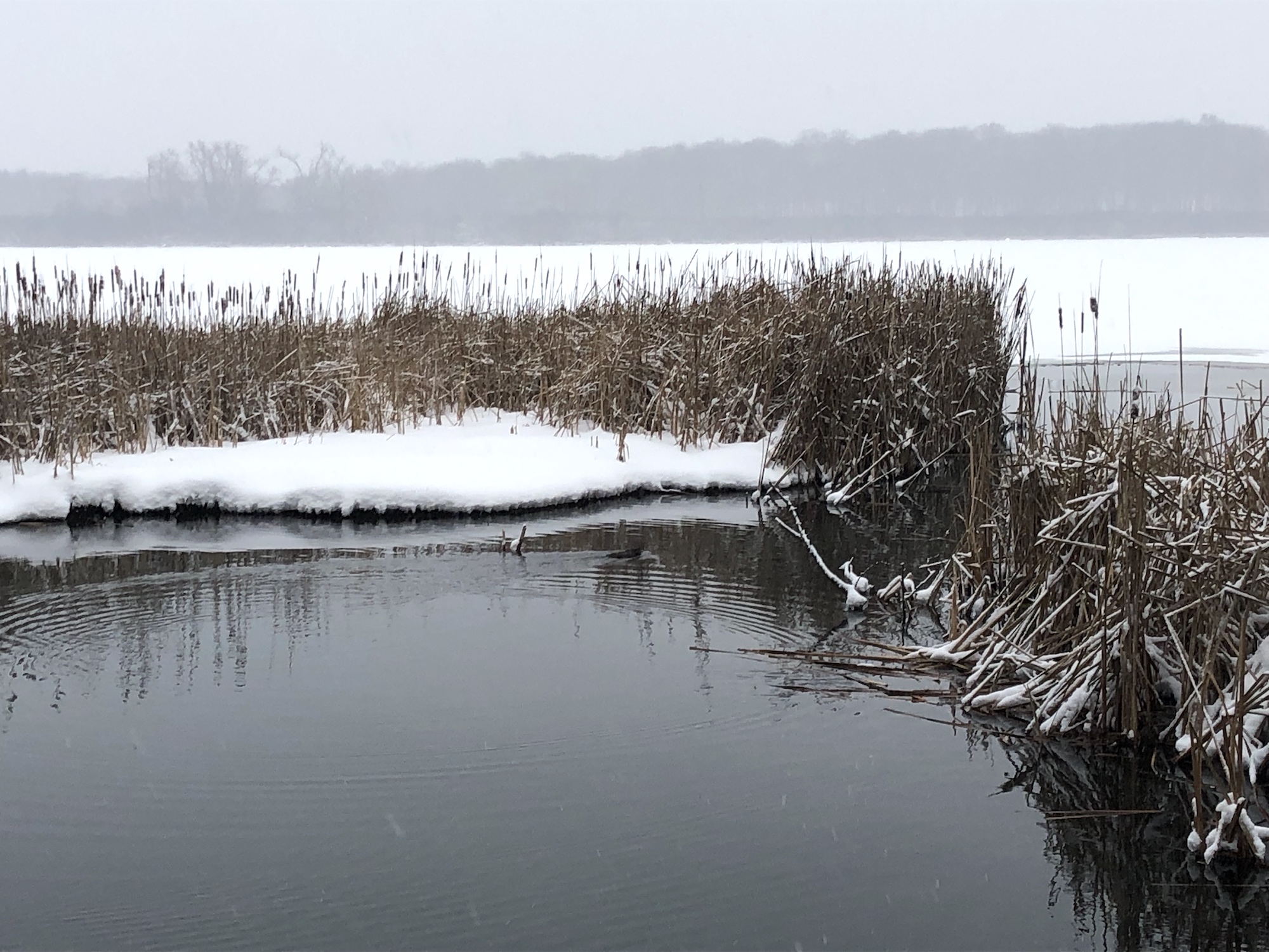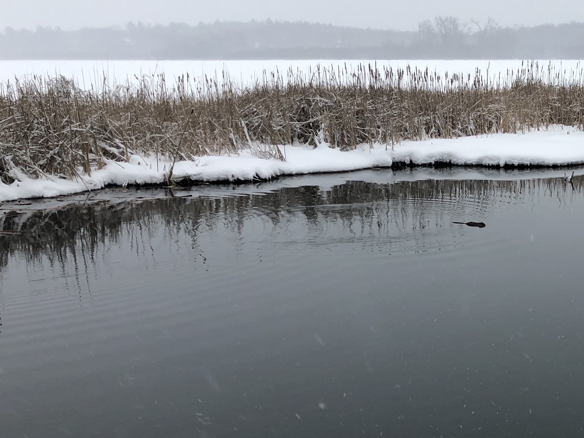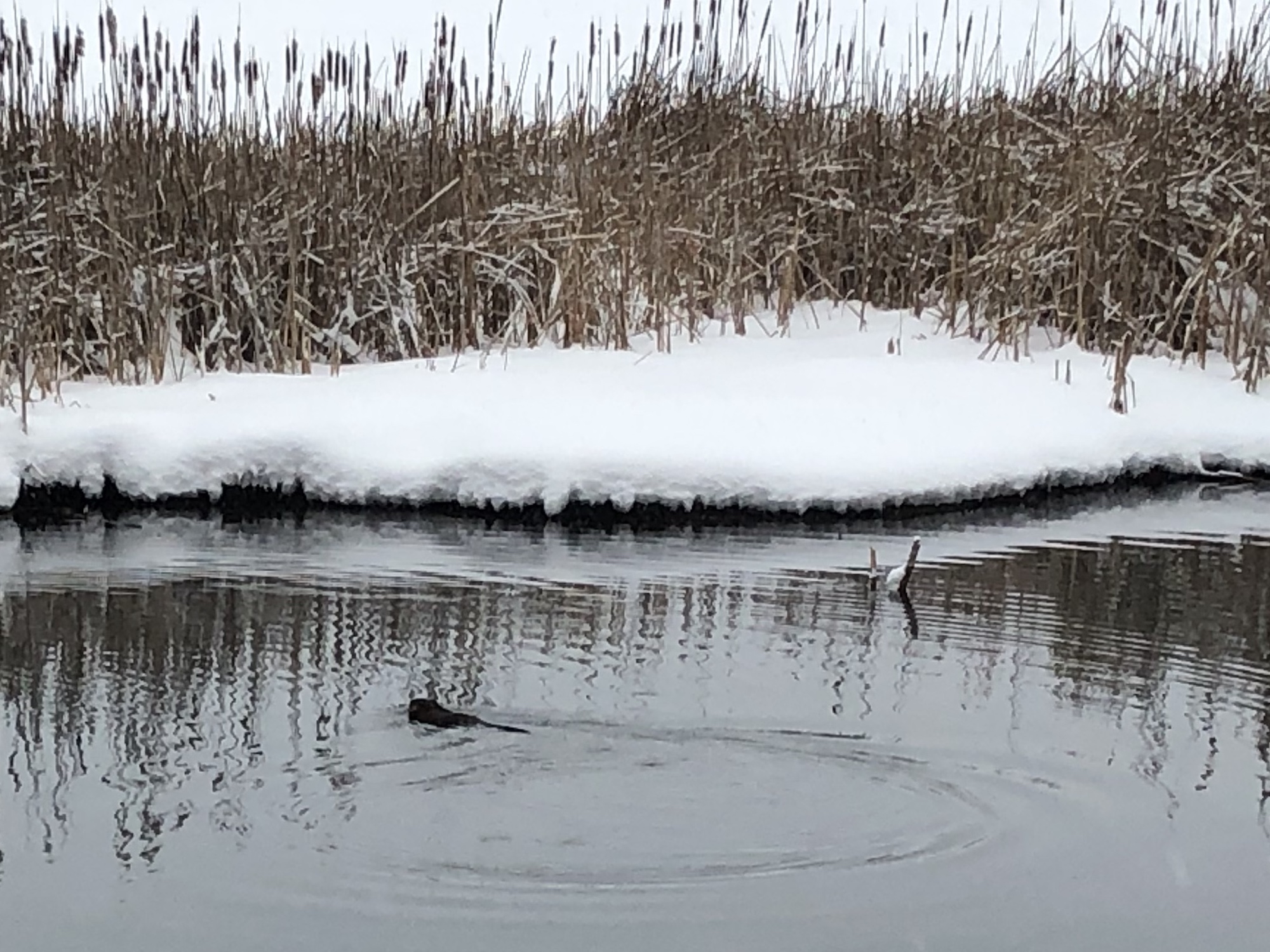 Below: Muskrats or beaver swimming around cattails on Lake Wingra near entrance to Ho-Nee-Um Pond.