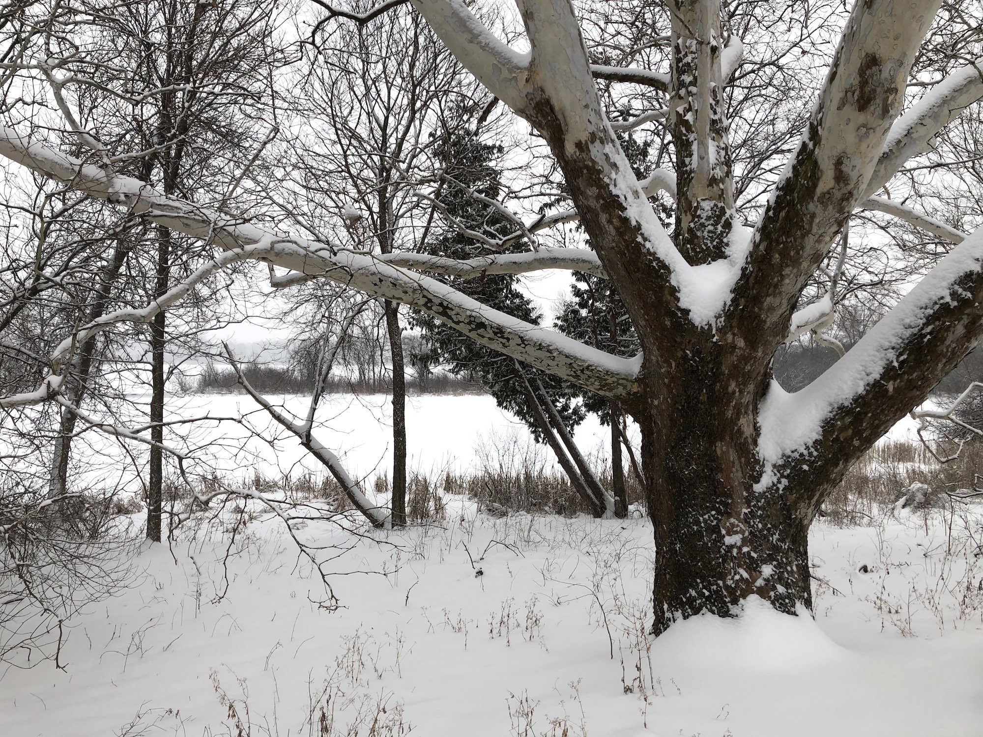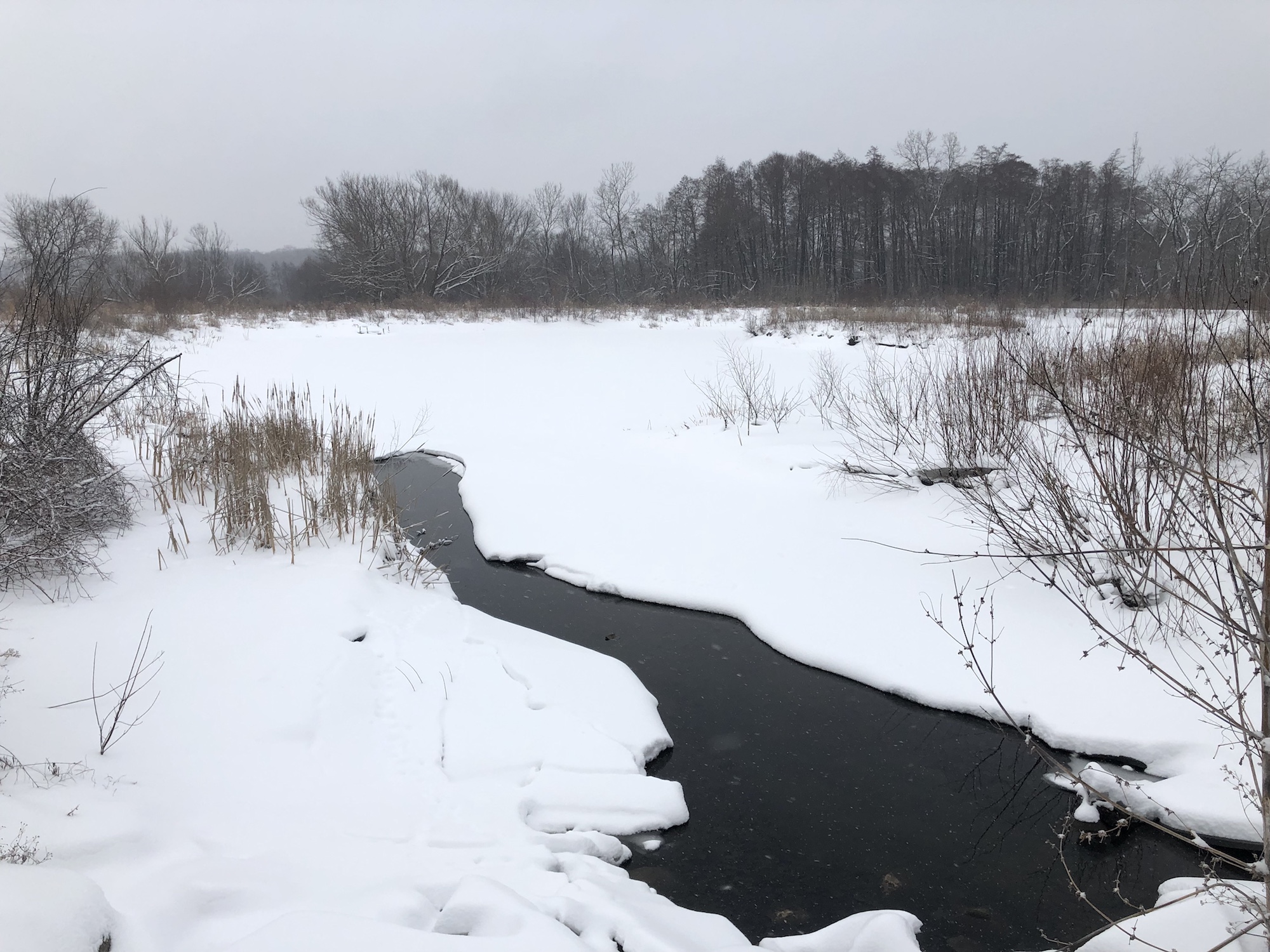 Above: Duck Pond on February 12, 2019 (27°). Rafter of wild turkeys at end of pond.