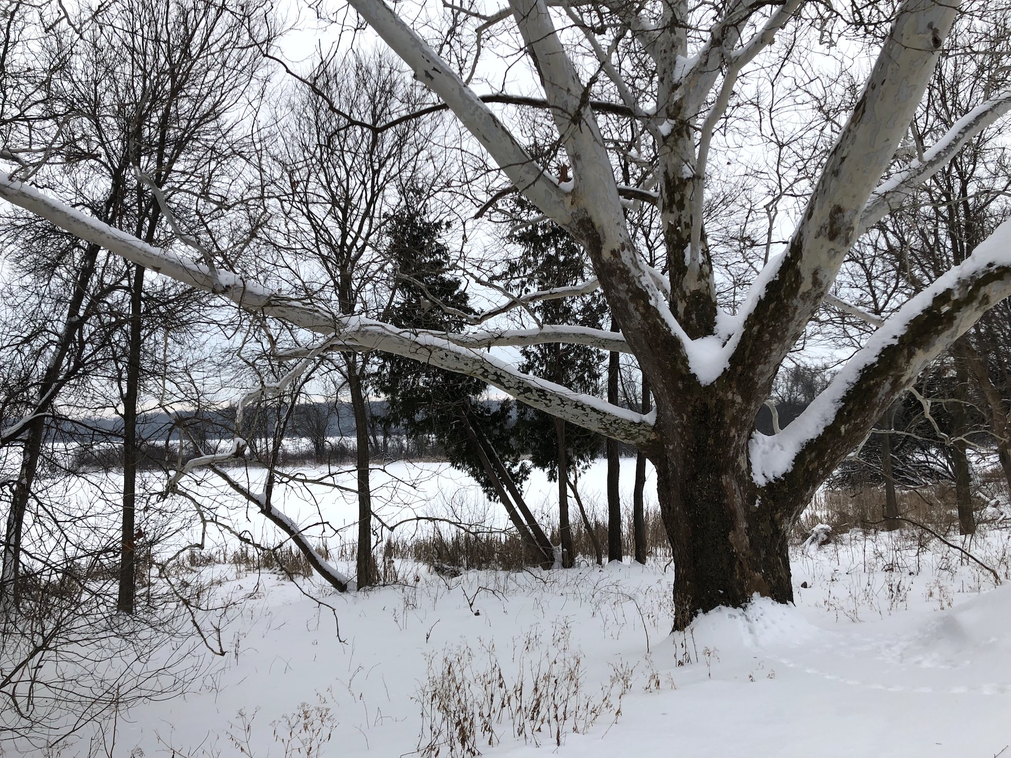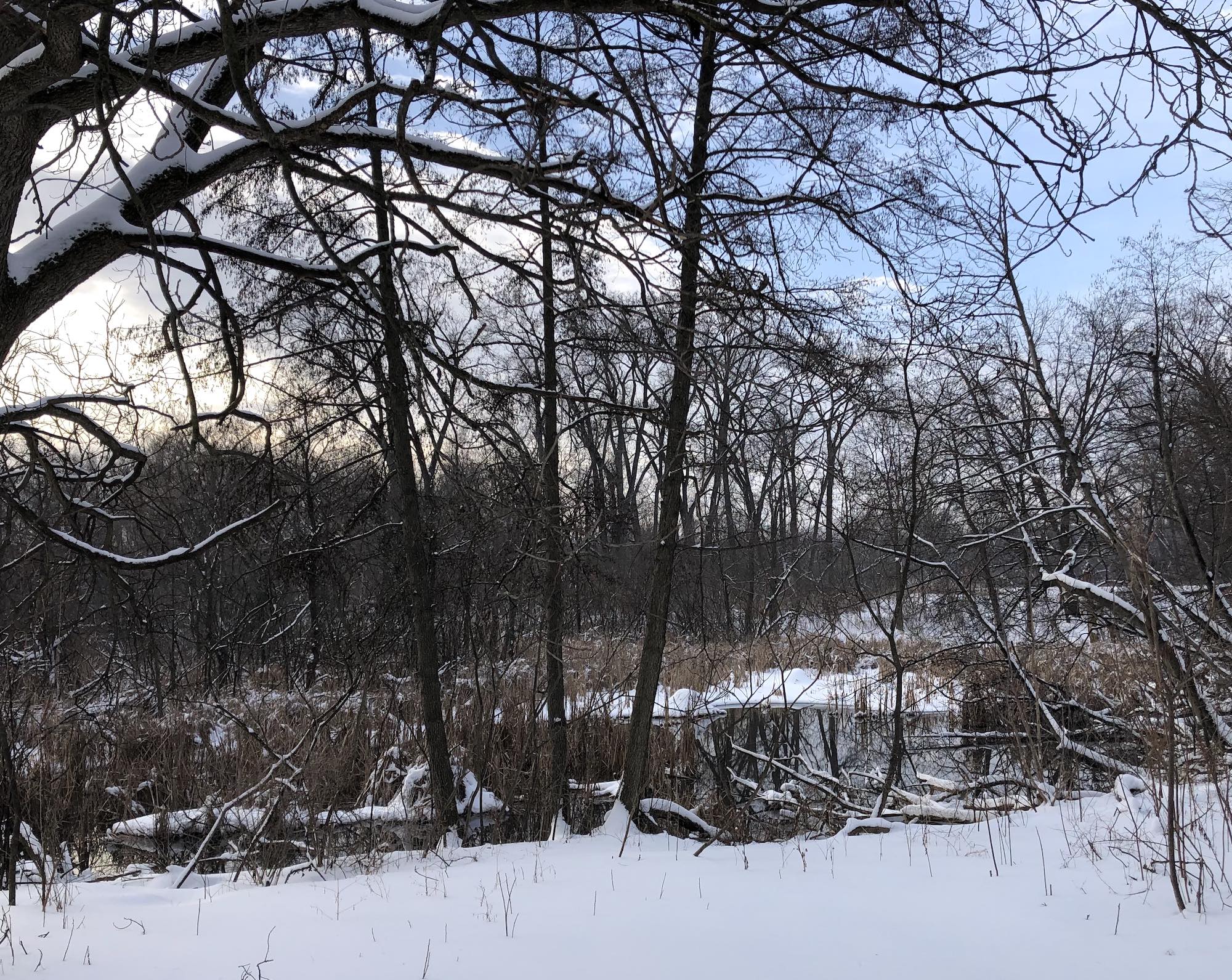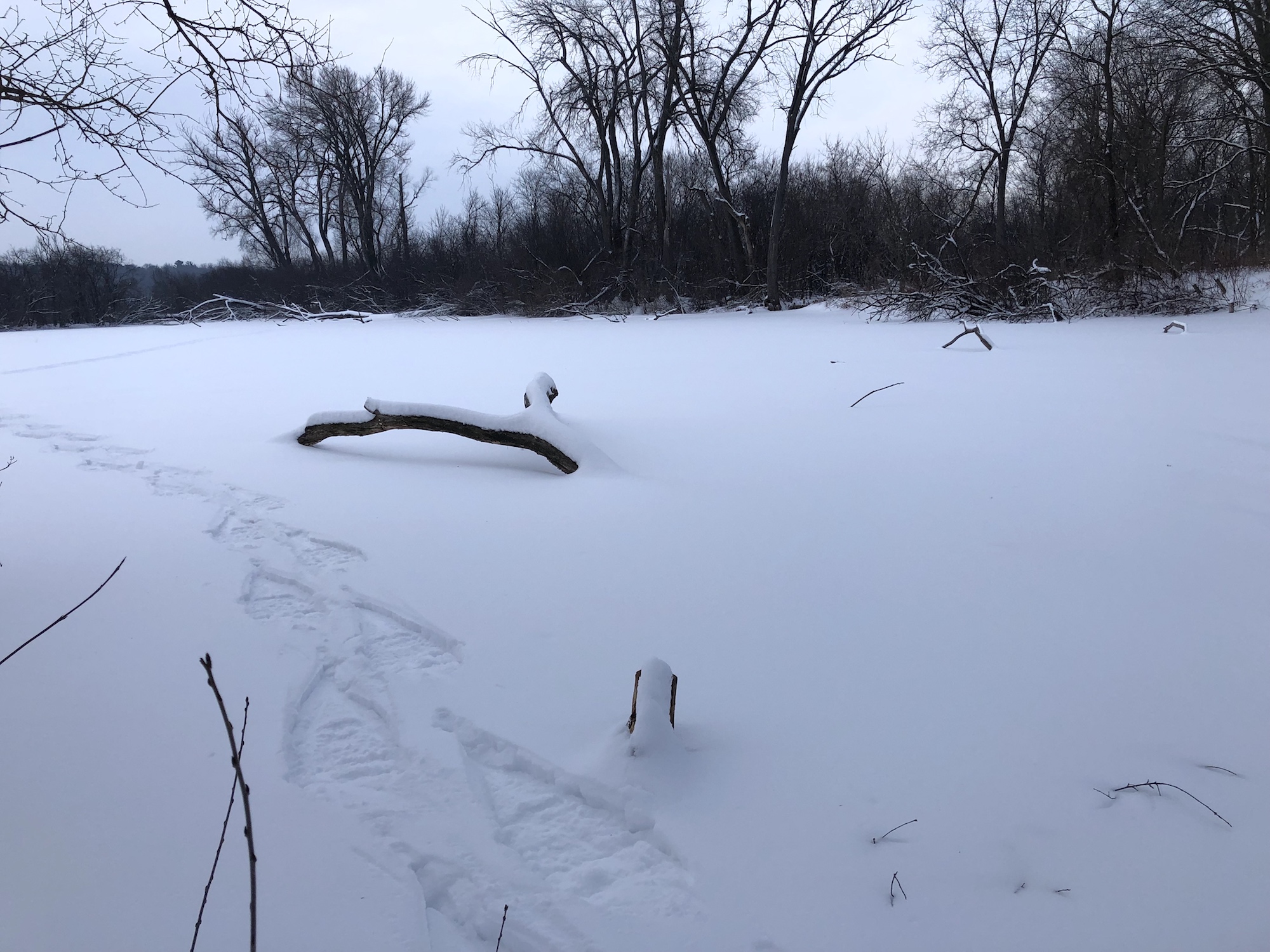 Above: Ho-Nee-Um Pond. Note: snowshoe tracks by forked tree.