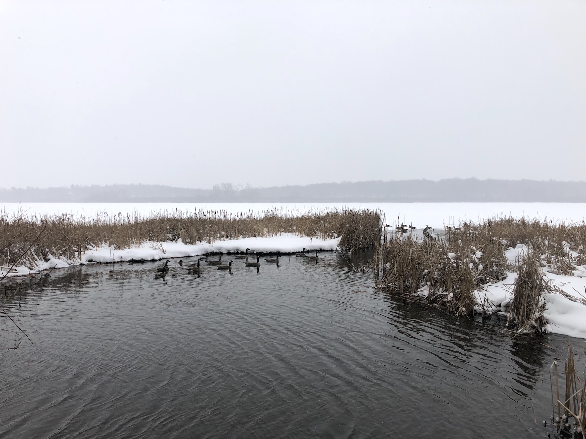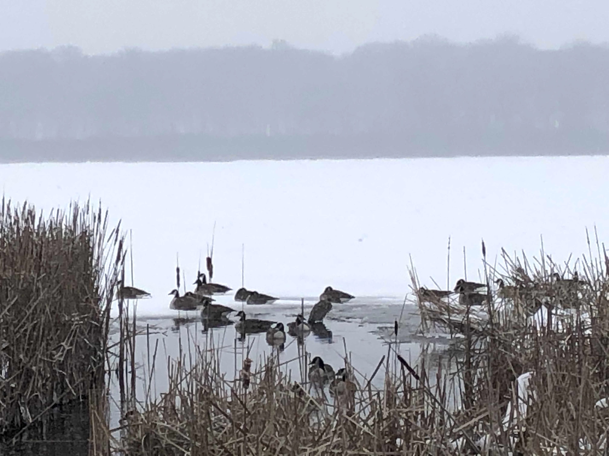 Above: Canada Geese and Great Blue Heron in Lake Wingra cattails (27°).