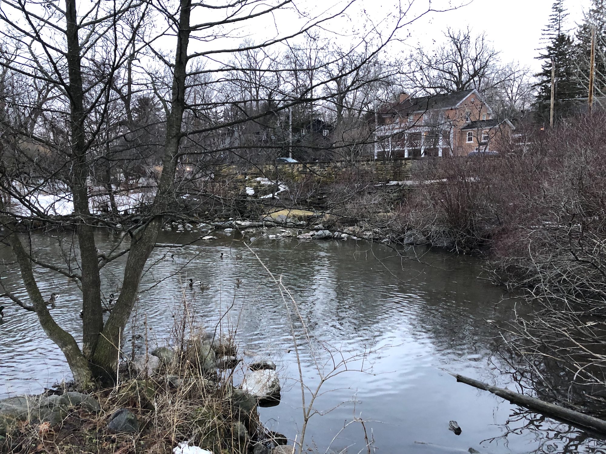 Above: Duck Pond on March 15, 2019 (33°). A rafter of wild turkeys flocking at southern edge of pond.