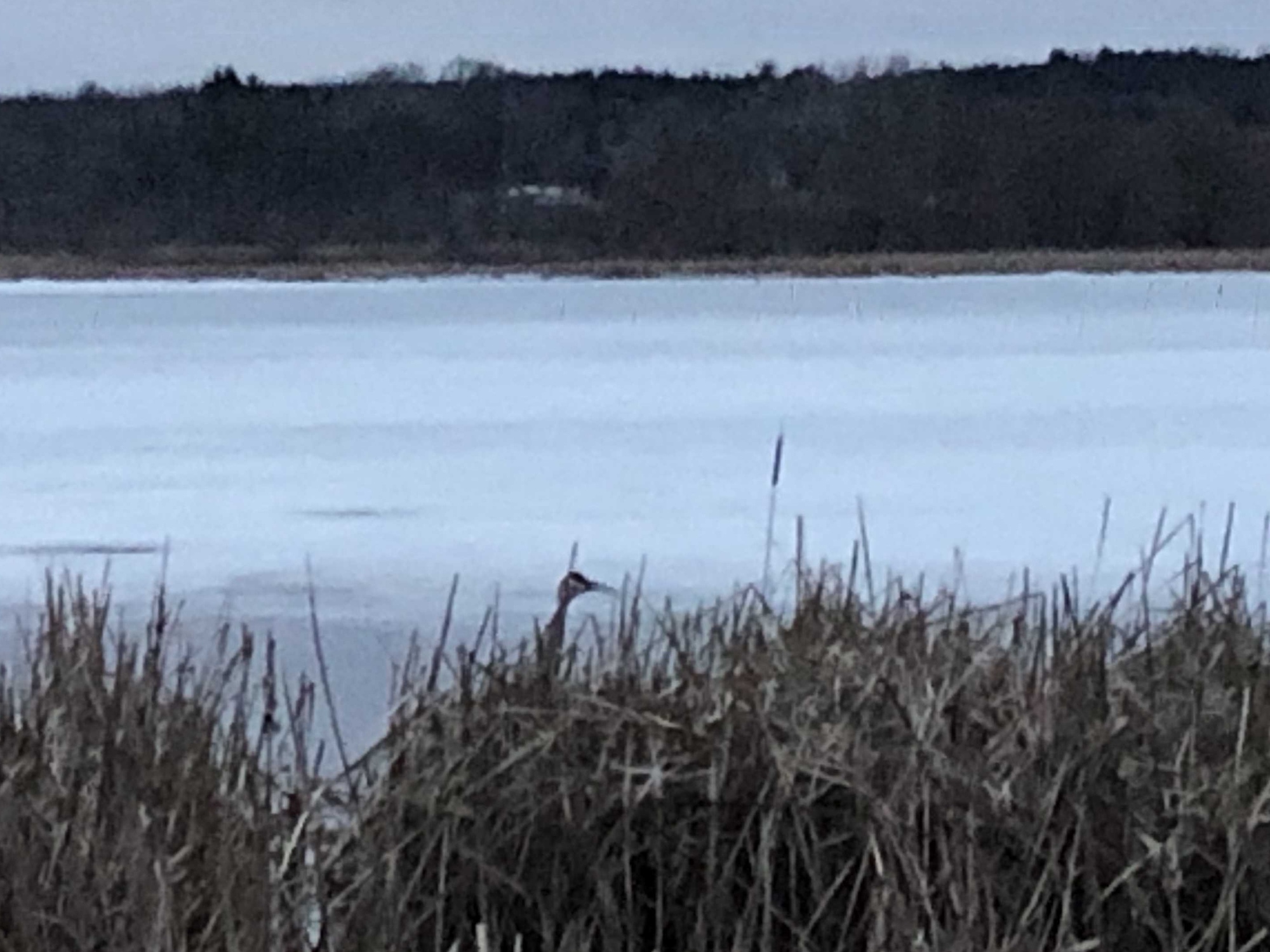 Note: Stirred a murder of crows just before I got to the cattails. Sighted two Sandhill Cranes in Lake Wingra cattails. Two muskrats perched on the edge of the receeding ice by cattails and two more muskrat on receeding ice edge in Ho-Nee-Um Pond (They appear to be eatting). Flock of turkeys by Duck Pond.